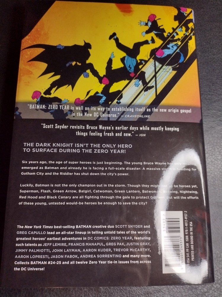 Artist/Writer:Jimmy Palmiotti, Jay Leisten, Jeff Lemire, Francis Manapul, Rafael Albuquerque, Brian Buccellato, Arif Prianto, Andrea Mutti, Vicente Cifuentes, Trevor Mccarthy, Jeremy Haun, Andy Clarke, Aaron Kuder, Jason Fabok, Juan Castro, Robert Venditti, Jim Fern, Chris Sprouse, Matt Hollingsworth, Eduardo Pansica, Aaron Lopresti, Greg Capullo, Marguerite Bennett, Marc Andreyko, Rob Lean, Garry Henderson, Tom Nguyen, Danny Miki, Sonia Oback, Will Conrad, Paul Mounts, Bill Sienkiewicz, Tomeu Morey, Denys Cowan, Pete Pantazis, Daniel Sampere, Greg Pak, Dave McCaig, Ivan Fernandez, Jonathan Glapion, Christy Marx, Guy Major, Karl Story, Cliff Richards, Art Thibert, Fernando Pasarin, Scott McDaniel, Romano Molenaar, Andrea Sorrentino, John Kalisz, John Layman, Allan Jefferson, Scott Snyder, Justin Gray, Travis Moore, Patrick Olliffe, Van Jensen, Júlio Ferreira, Keith Champagne, Chris Sotomayor, Marcelo Maiolo, Blond, Fco Plascencia, Vic Drujiniu, Kyle Higgins, James Tynion IVCover Artist:VariousLanguage:EnglishPublication Year:2014Tradition:US ComicsPublisher:DC ComicsSeries Title:DC Comics: Zero YearCharacter:Commissioner Loeb, Marcus Row, Batman (Bruce Wayne), Charlie (villain), Colonel Jake Kane, Gene, Dr. Death (Dr. Karl Helfern) (villain), Shirley Stewart, Spencer (villain), Basil Karlo, Mr. Archuleta, Lt. Tasker, Lucius Fox, Ra's Al Ghul (Villain), Amygdala (Aaron Helzinger) (villain), Barbara Gordon, Sal Maroni (villain), Red Hood Three-Forty-Seven (Philip Kane) (death)), Officer Harvey Bullock, Selina Kyle, Mary Grayson, Officer Frankie, Officer Ramirez, Kate Kane, Officer Valdez, The Supremacists (villains), Jason Todd, Dr. Pamela Isley, Anarky (villain), Officer Kiviat, Red Hood Sixty-Seven (villain), Thomas Wayne (flashback, corpse), Josh, Russell Tavaroff (first appearance, flashback), Raya Vestri, Red Hood Fifty-Four (villain), The Untitled (villain, death), Harvey Bullock, Lola MacIntire, Sgt. John Stewart, Talia Al Ghul (Villain), Green Arrow (Oliver Queen), Jana, Mrs. Todd, Red Hood Gang (Red Hood One (villain), Commissioner Gillian Loeb, Calvin Summer, C.C. Haly, Mr. Torres, Barry Allen, Martha Wayne (flashback, corpse), Black Mask Gang (villains), Taz, Liam Distal (corpse), Bob, Luke Fox, Chris, Officer Mueller, Lt. Zachary Henshaw (villain, death), Dr. Kelver (flashback, corpse), Killer Moth (villain), Officer Thomas, Batwing (Luke Fox), Red Hood Gang (villains), Officer Peters, Kal-El), Leopold, James Gordon, Cullen Row, Raymond, Oswald Cobblepot, Maggie Sawyer, James Gordon, Jr., Dick Grayson, Arnett Crocker (villain), Tanya Fox, Lt. James Gordon, Black Mask (Roman Sionis) (villain), Dr. Paji (corpse), Alfred Pennyworth, Officer Larson, Officer Francis Laney (villain, death), Superman (Clark Kent), Lana Lang, Harper Row, Henry, John Stewart, Joker (formerly Red Hood One) (villain), Bette Kane, Riddler (Edward Nygma) (Villain), John Grayson, Officer Wilkins, Mr. Vickers, Officer Davison, C.J. Maroni, Iris West, Flash (Barry Allen)Era:Modern Age (1992-Now)Genre:Superheroes