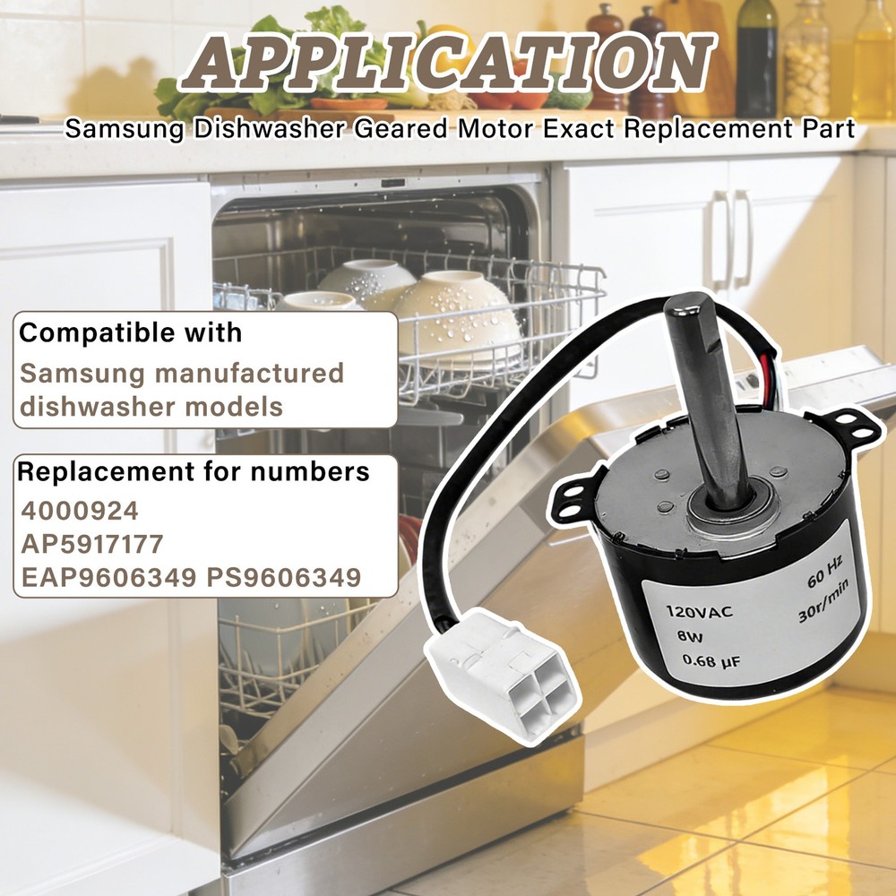 UPC: Does not apply Type: Dishwasher Geared Motor MPN: DD31 - 00013B, DD62 - 00053A gtin13: Does not apply Brand: Great-parts1 Compatible Brand: Samsung Dishwasher Compatible Model: Samsung Dishwasher Suitable For: Dishwasher, Samsung Dishwasher