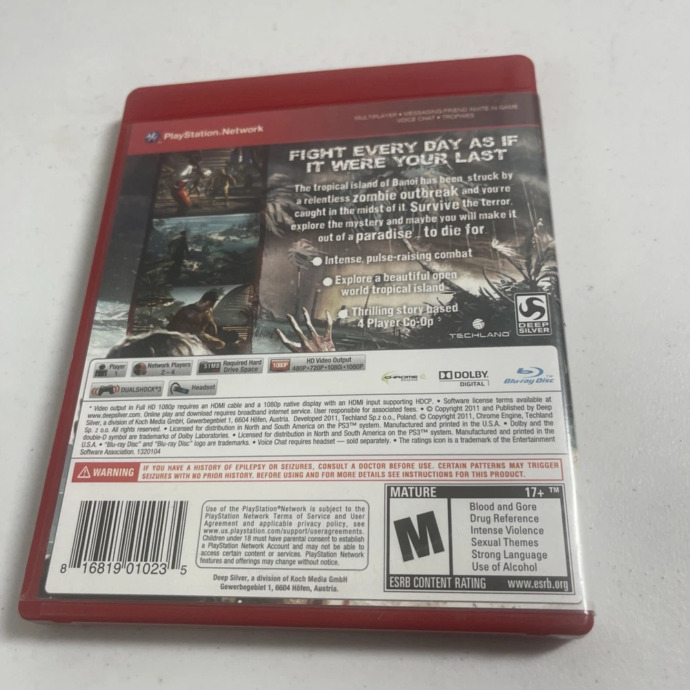Video Game Series:Dead Island SeriesGenre:Action & AdventurePlatform:Sony PlayStation 3Region Code:NTSC-U/C (US/Canada)Country/Region of Manufacture:United StatesRating:M - Maturegtin13:0816819010235Release Year:2012Publisher:Deep SilverFeatures:Complete Edition, Game Of The Year Edition, Manual Included, Multiplayer, Online PlayabilityUPC:0816819010235Game Name:Dead Island- Game of the Year EditionSub-Genre:Boxing, Extreme Sports, Karate, Martial Arts, Mixed Sports, WrestlingManufacturer Warranty:3 Years