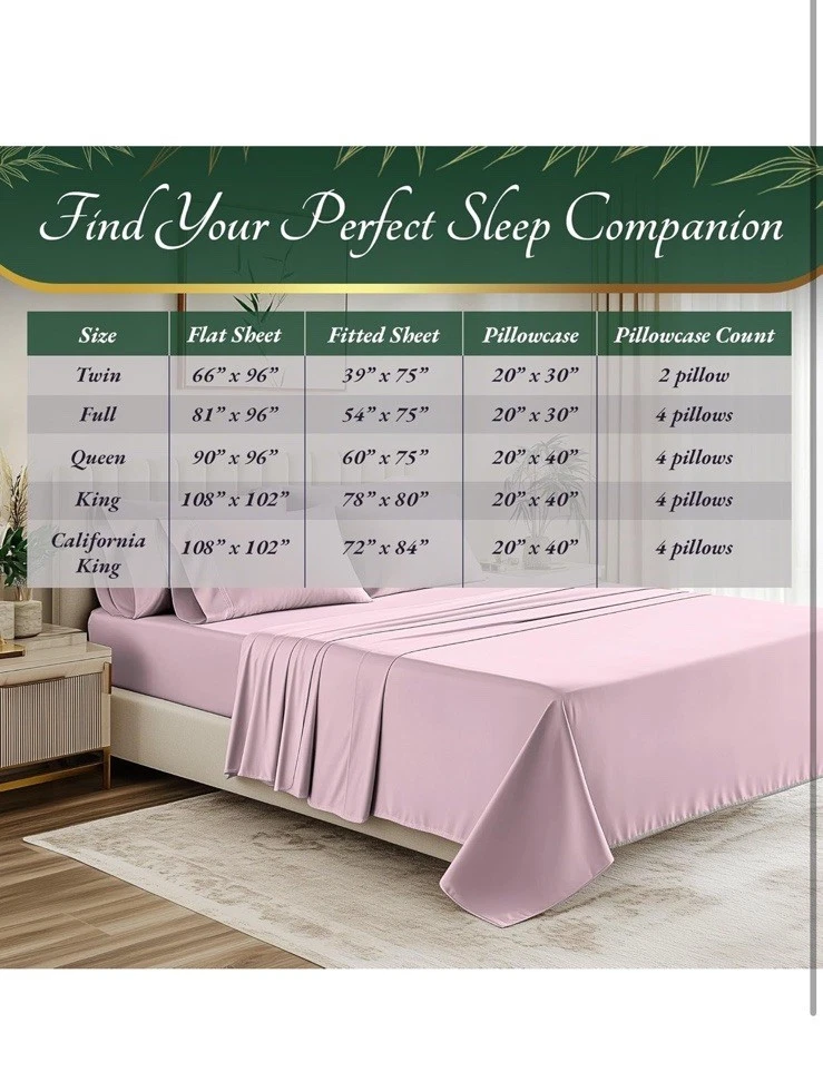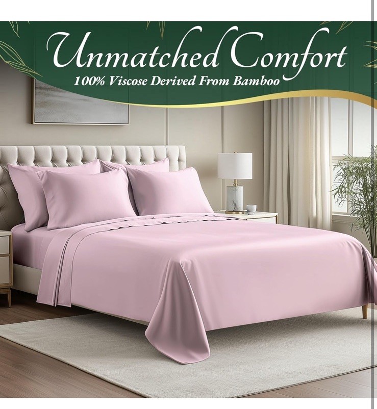 New item! UNMATCHED COMFORT & SOFTNESS: Our unique 100% viscose derived from bamboo sheets king size deliver an unparalleled softness and a smooth, luxurious texture. OEKO-Tex Certified viscose derived from bamboo bed sheets are silky-smooth & naturally hypoallergenic SLEEP IN COOLING BLISS: Elevate your sleep with viscose derived from bamboo cooling sheets. Naturally temperature regulating bed sheet set, moisture-wicking, and innovative Breezweave technology for breathability. Luxury sheets for ultimate relaxation BUILT TO LAST: Our king sheets set is made from 100% viscose derived from bamboo that withstands longer wash cycles and is fade-resistant. Precise double stitching on sheets provides lasting durability and exceptional strength PERFECT FIT FOR All BEDS-6-PIECE SET: Discover the ultimate fit with our king size sheets set tailored for standard mattress dimensions, with a deep 17" pocket for extra-thick mattresses. Package Includes 1pcs Flat Sheet (108x102) inch, 1pcs Fitted Sheet (78x80) inch, 4pcs Pillow Cases (20x40) inch