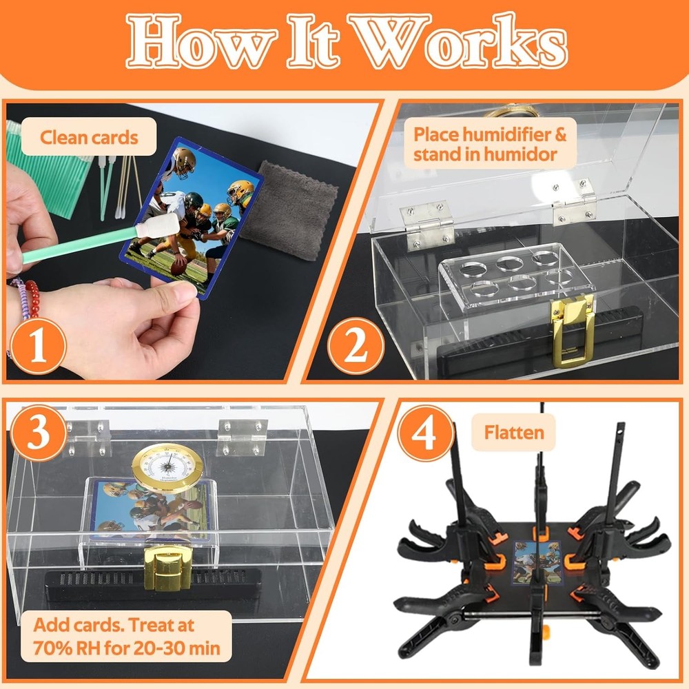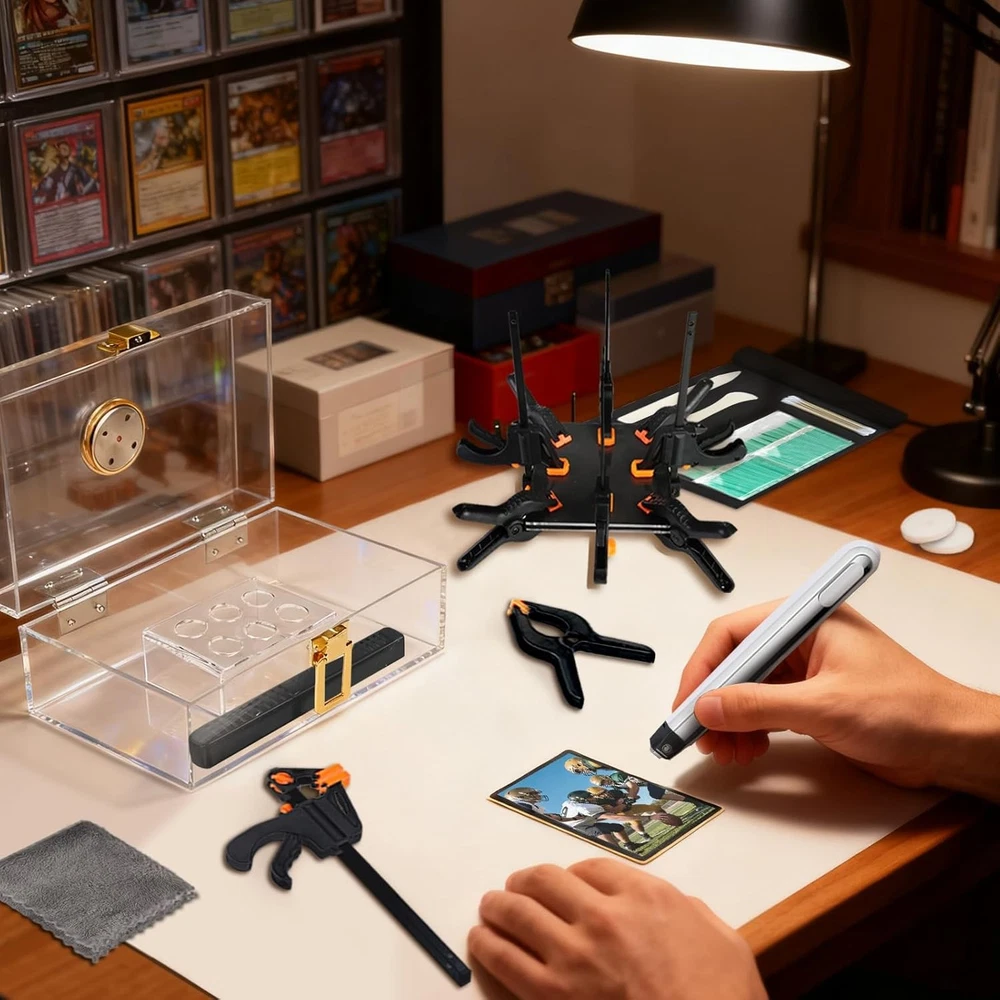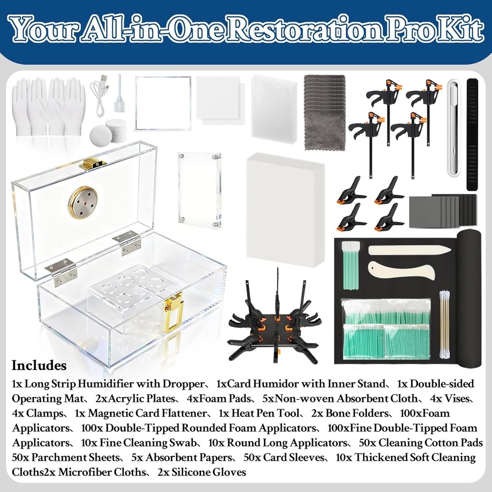 Free eBay listing template designed by dewiso.com DEDC All-in-One Trade Card Flattening Kit Restoration Cleaning with Heat Pen: Clean, Moisturize, and Flatten – Complete Card Care Solution for TCG Collectors and Enthusiasts Acrylic Humidor FREE AND FAST SHIPPING! All-in-One Restoration Solution: This card restoration kit combines cleaning, moisturizing, and flattening functions, providing a comprehensive approach to card repair for avid collectors.Achieve the excellent repair results in 4 steps. First, Clean the card surface with the provided swabs and cloth. Second, Humidify to relax stiff fibers. Third, Flatten the card to correct warping. Finally, use the Thermal Pen to smooth out stubborn creases. Note: Always place a heat-resistant paper between the pen and the card during thermal repair to protect the surface. Complete Cleaning Kit: Card care kit includes 1x Long Strip Humidifier with Dropper、1x Card Humidor with Inner Stand、1x Double-sided Operating Mat、2x Acrylic Plates、4x Foam Pads、5x Non-woven Absorbent Cloth、4x Vises、4x Clamps、1x Magnetic Card Flattener、1x Heat Pen Tool、2x Bone Folders、100x Foam Applicators、100x Double-Tipped Rounded Foam Applicators、100xFine Double-Tipped Foam Applicators、10x Fine Cleaning Swab、10x Round Long Applicators、50x Cleaning Cotton Pads、50x Parchment Sheets、5x Absorbent Papers、50x Card Sleeves、10x Thickened Soft Cleaning Cloths、2x Microfiber Cloths(in black bag)、2x Silicone Gloves Advanced Humidification: Our sports card accessories features built-in acrylic stands to elevate your cards, preventing direct contact with the base. This ensures even moisture distribution for effective softening while preparing them for flattening in this kit. Professional Flattening Tools: With our card flattening kit, you get acrylic plates and clamps to fix bends and lifted edges, offering a reliable solution for card restoration. Heat Pen Precision Repair: The included heat pen and thermal pen for cards allow for targeted thermal treatment to smooth creases, with appropriate temperature settings for safe use on various card types. Professional-Grade Cleaning System: This comprehensive card cleaning kit is equipped with soft cloths and precision-tipped swabs to safely lift dust and erase fingerprints without scratching, restoring the pristine surface and original gloss of your valuable collectibles. Versatile Repair Options: As a versatile card repair kit, it handles multiple damage types, from dents to creases, making it ideal for sports cards, trading cards, and more. Non-Guaranteed Outcome: This kit is designed for cleaning and surface enhancement only. It cannot repair structural damage, creases, or paper loss. Use of the repair kit may be considered "altered" by third-party grading services (e.g., PSA, BGS, SGC). Always test on a low-value card before applying to high-value assets. We are not responsible for any damage caused by improper application. Product We offer a 30-Day Return Policy on items which you are not completely satisfied with. You have the option for a full-refund or an exchange of the item. No returns are available on items shipped outside of the US . Shipping We offer Free Shipping to the US and ship within 2 business days of payment, usually sooner. We use UPS express shipping. That's why your products are usually delivered within 3 days . Contact We try our very best to make sure every customer is completely satisfied. If there's a problem , message us! We're happy to help. 24/7 live chat available.