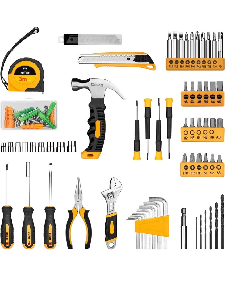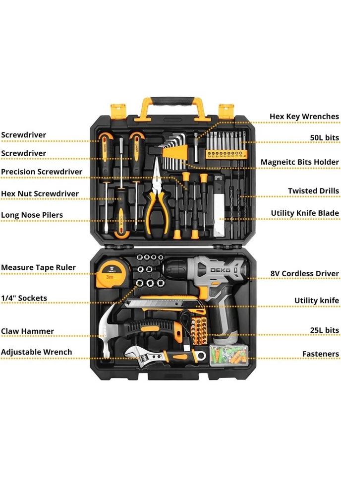 System of Measurement: Both Case Included: Yes Brand: DeKo Case Type: Box Type: Household Tool Set Color: Black Tools Included: Hammer, Hex Key, Pliers, Screwdriver, Socket, Tape measure, Wrench, Drill Number of Pieces: 126 MPN: DKMT126