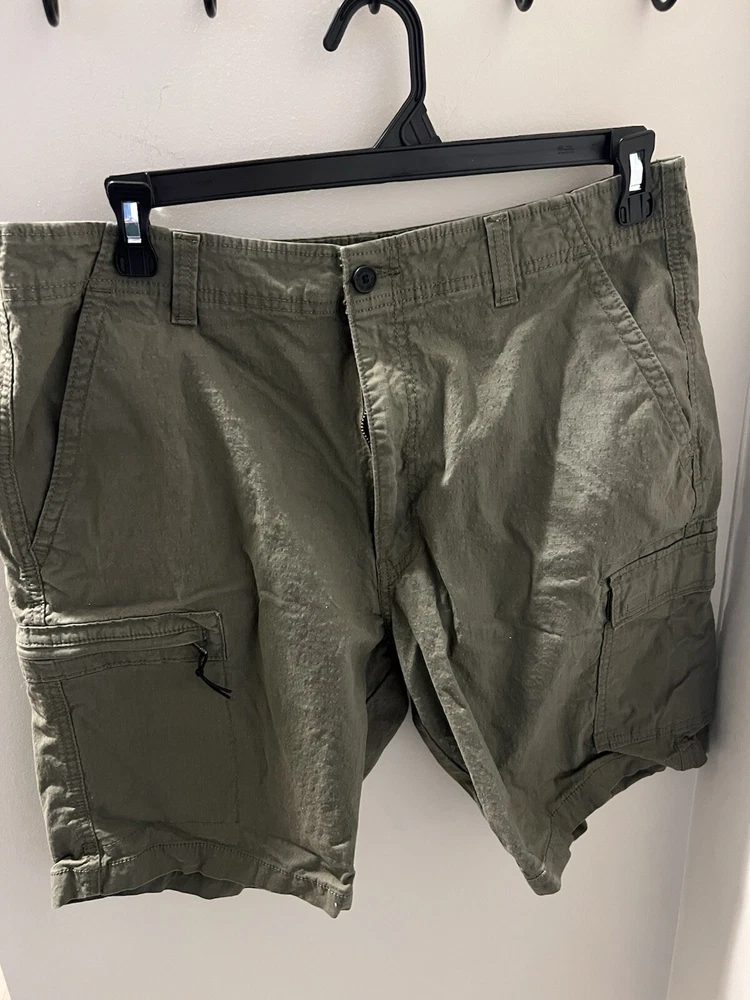 Crafted for comfort and functionality, the DENIZEN from Levi's Men's Flex Lightweight Cargo Shorts are a quintessential addition to your casual wardrobe. These olive green shorts, in size 36, feature a versatile flat front design and a relaxed fit that allows for ease of movement throughout your day. The durable cotton fabric ensures breathability and easy care, making them an ideal choice for the transitional seasons of fall, spring, and summer. Equipped with multiple cargo pockets, this pair offers ample storage for essentials, while the logo accentuates the garment with a touch of brand identity. A medium fabric wash lends a timeless look, and the lightweight construction provides comfort without sacrificing style. Whether you're heading out for a casual outing or just enjoying a leisurely day, these shorts deliver both practicality and effortless style.