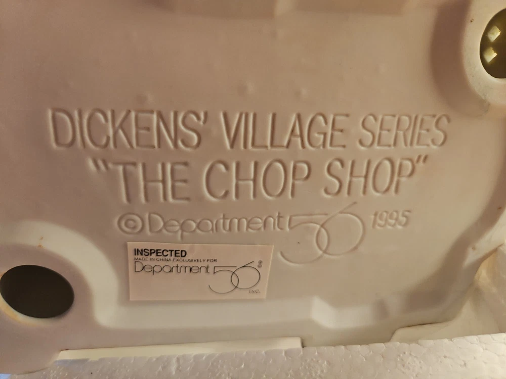 Material:PorcelainRoom:ShopTheme:SeasonalColor:MulticolorOriginal/Reproduction:OriginalCollection:Dickens VillageCountry/Region of Manufacture:ChinaFeatures:Boxed, Hand PaintedBrand:Department 56Antique:NoShape:ShopSeller Notes:“No chips or cracks”Packaging:BoxType:Christmas VillageOccasion:ChristmasYear Manufactured:1995Time Period Manufactured:1990-1999Subject:The Chop Shop