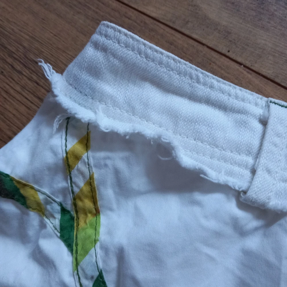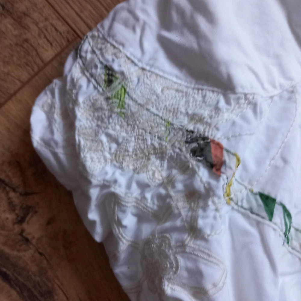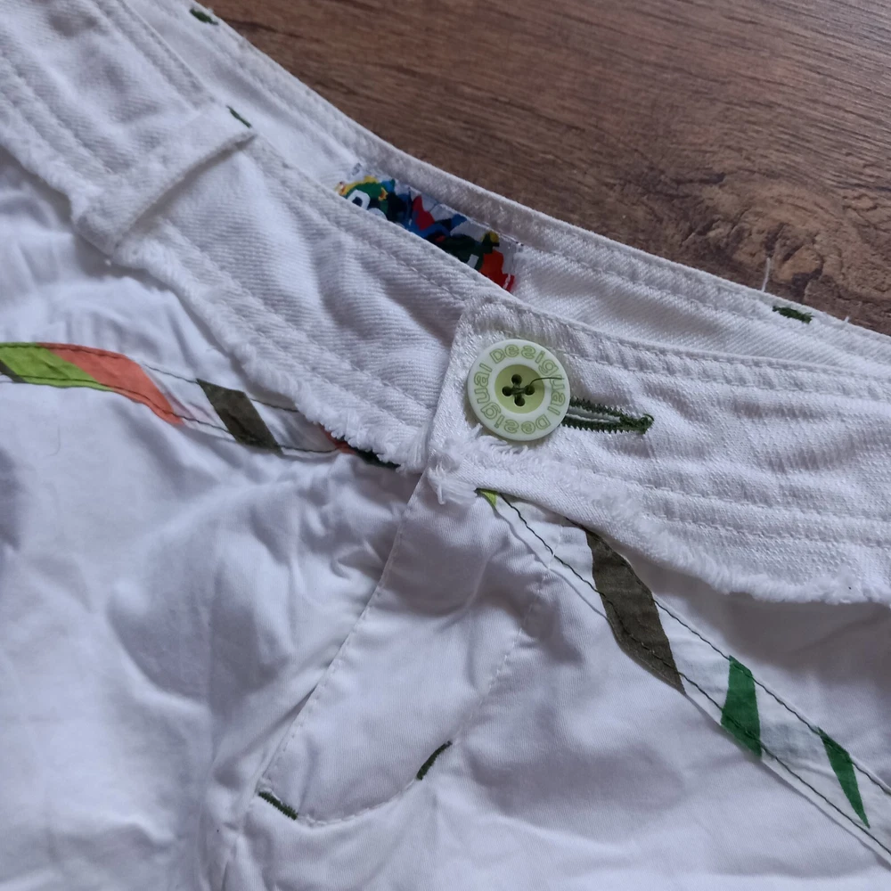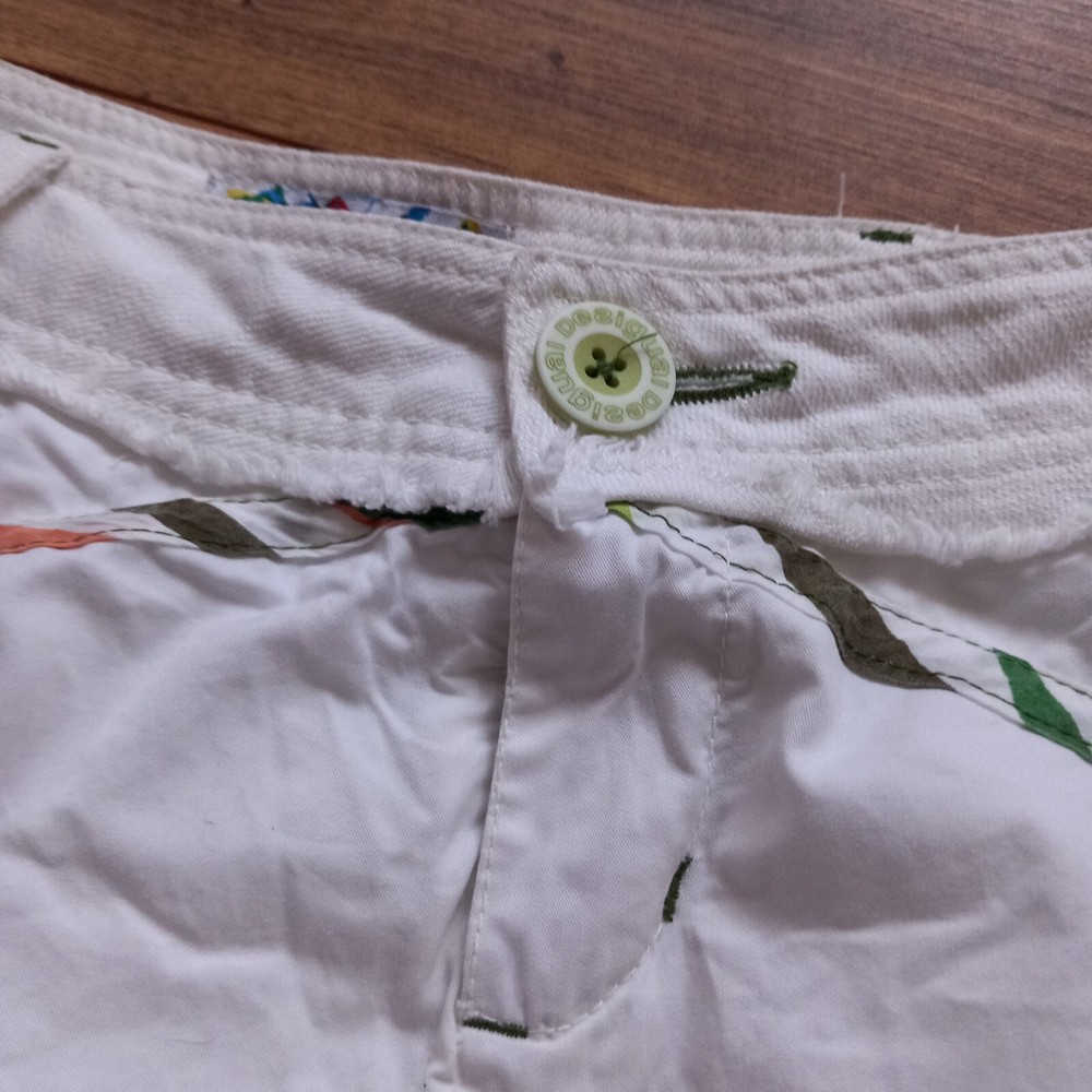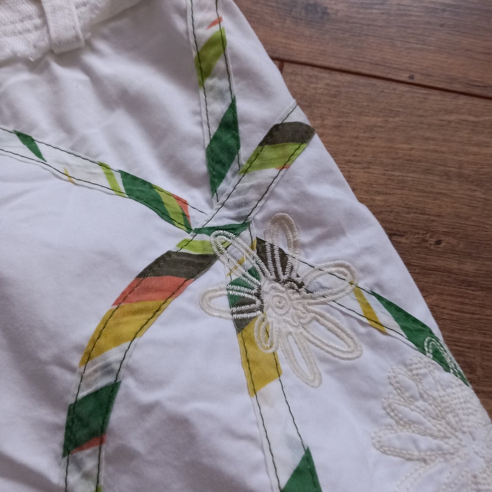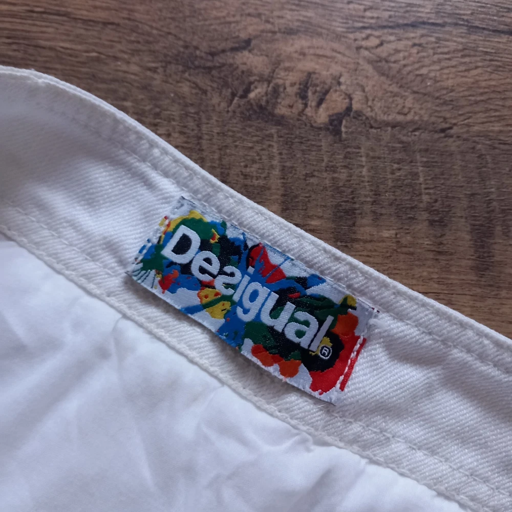 Good condition with no faults found. Unusual bubble hem vintage Desigual iconic design from Spain. Inner label been removed but has 14" across waistband which is in denim, rest of skirt is cotton. Measures 19" in length approx, 19" across hip area. Waist is low so probably best fits a uk 6 or poss 8.