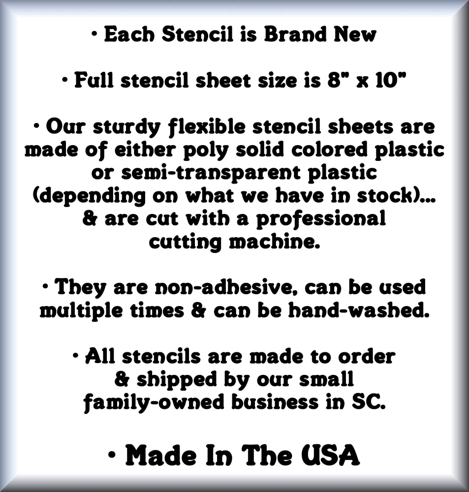EACH Stencil Is Brand New!! ~*~The Color / Black Parts Are Cut Out.~*~ Imperial Creations Stencils.. is a company owned by Angellinn's Attic. Our sturdy stencil sheets are made of either poly solid colored plastic or semi-transparent plastic (depending on what we have in stock)... & are cut with a professional cutting machine. (not laser cut) They are non-adhesive, can be used multiple times & can be hand-washed. WE personally cut each stencil we list & sell. (solid colors we use are black, red, blue, orange, etc) Full Stencil Sheet Size Is: 8" x 10". Thickness Of Stencil Sheet: (.015 to .02) / 15 Mil to 20 Mil (approx. 3/4 size of credit card thickness) YES... I do make Custom Stencils!! Send me a message... and let's design something together!! :) If you have any questions on this item... please ask. I'm a great communicator and will answer any questions you might have. Please Check Out My E-Bay Store ANGELLINN'S ATTIC For Lots Of Other GREAT Stencil Designs!! While In Our Store.. Look For "Stencils" On The Left Toolbar.. Click It for A Drop-Down Of Stencil Categories. THANK YOU so much for Looking, Buying and/or Bidding!! :o) Return Policy: Items may only be returned if they're in the same condition as stated in the listing. Item must still be sealed in manufacturer's bag and/or our company's sealed bag.. unopened/unused. This rule is in place, so that an item can't be returned for refund after using/enjoying the item and trying to send it back. Buyer must email seller before returning item & also provide seller with a tracking number when returning an item.