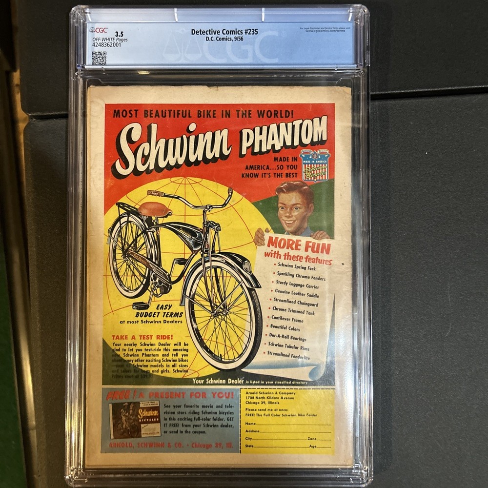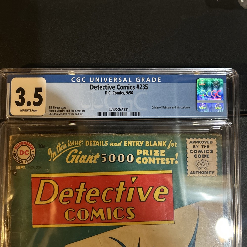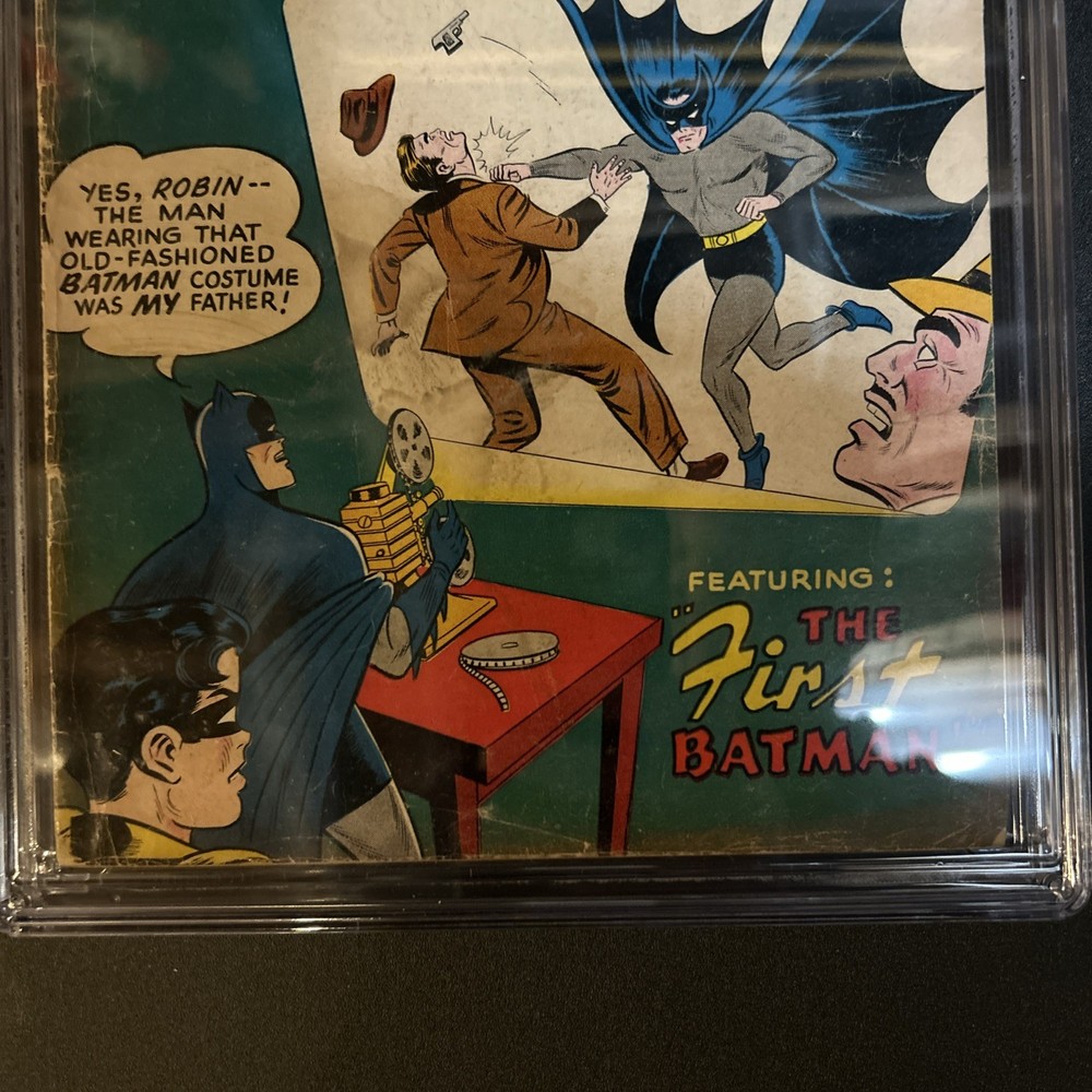 Series Title:Batman: Detective ComicsEra:Silver Age (1956-69)Grade:3.5 Very Good-Genre:SuperheroesCertification:CGCLanguage:EnglishPublication Year:1956Country of Origin:United StatesPublisher:DC ComicsCharacter:Batman (Bruce Wayne)Tradition:US ComicsProfessional Grader:Certified Guaranty Company (CGC)