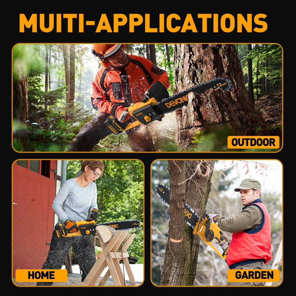 The Devonic Mini Chainsaw 12 Inch Cordless, a powerful and efficient tool designed to meet all your wood cutting and tree trimming needs. This handheld electric chainsaw features a larger cutting surface with a 12-inch cuttable face length and a total steel plate length of 9 inches, allowing you to tackle thicker trees effortlessly. Built with a high-quality guide chain and a pure copper motor, this mini chainsaw ensures smooth and fast cutting, significantly improving your cutting efficiency. Whether you’re pruning branches or cutting firewood, the Devonic Mini Chainsaw delivers reliable performance every time. Equipped with a 20V 2000mAh rechargeable lithium battery, this battery-powered chainsaw offers extended usage times. For even longer operations, it comes with two batteries that can be charged at any time, ensuring you’re always ready for the next task. Despite its powerful capabilities, the Devonic Mini Chainsaw is lightweight and portable. It comes with a compact suitcase that perfectly stores all accessories, making it easy to carry around. The quick and easy assembly process means you can set it up in just 1 minute, making it an ideal tool for both beginners and experienced users. The upgraded copper wire high-efficiency motor provides longer run-time, more torque, and greater power, reducing wear and tear and extending the lifespan of your chainsaw. This ensures that your handheld chainsaw will be a reliable companion for many years to come. 【Powerful And Efficient Cutting】Well built with 1000 watts super power BRUSHLESS motor, the mini chainsaw takes only 10 seconds to cut through a 12inch thick branch. Greatly Save your valuable time, energy and money for trimming yard. 【Efficient Brushless Motor】 This electric chainsaw has a strong BRUSHLESS motor that doubles its lifespan and reduces energy usage by 50%. It also produces only 35% of the noise compared to similar products.Experience uninterrupted and efficient cutting performance for effortless backyard or garden transformations. 【Rechargeable Long Life Battery Pack】The DEVONIC electric chainsaw is equipped with 2pcs 21V 4000mAh high-energy lithium battery pack that's removable and rechargeable.Providing long-lasting use. It can be conveniently and quickly charged at any time. If you do not use the chainsaw for an extended period, please fully charge the batteries before storing them. 【Convenience and Safety】The Mini Chainsaw cordless With an ultra-light body of 5 lbs with an ergonomic grip, it is ideal for gardening work by women and the elderly.Equipped with safety measures to protect body safety: ①Switch lock to prevent accidental start. ② Flaps to prevent splashing wood chips. ③Goggles to protect your eyes. 【2 Years Warranty& Professional Service】Every DEVONIC Mini Chainsaw Battery Powered comes backed by a 24-month hassle-free replacement warranty, eliminating the need for returns. Our professional service team is dedicated to resolving your concerns within 24 hours. Get a prompt and satisfactory response.