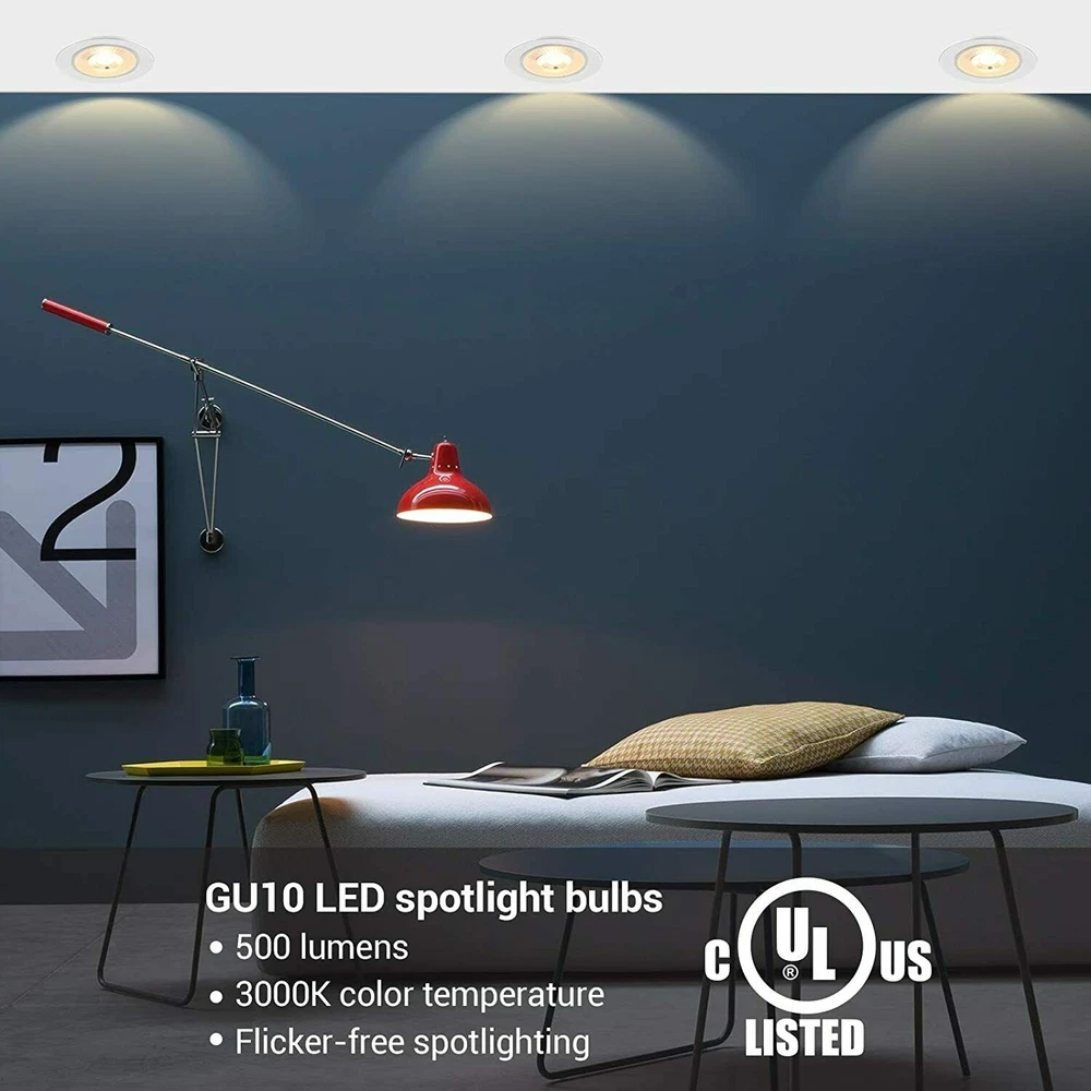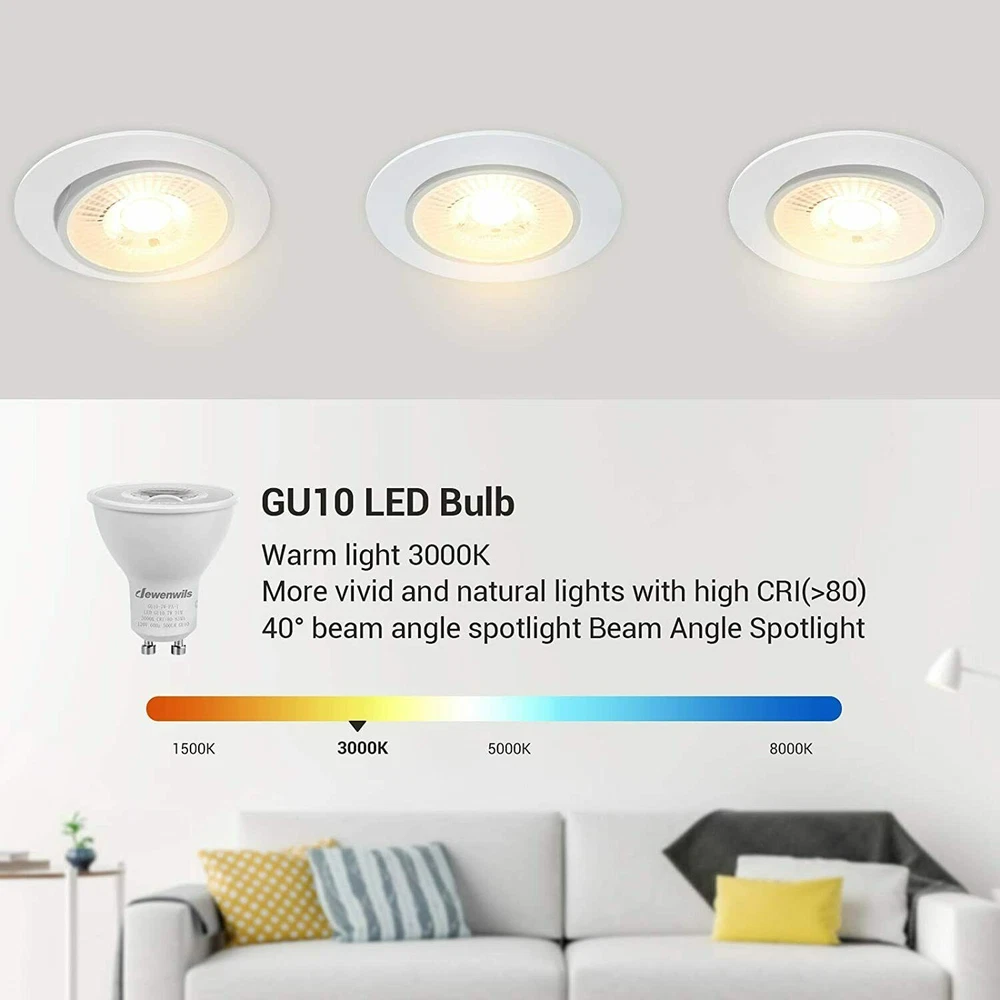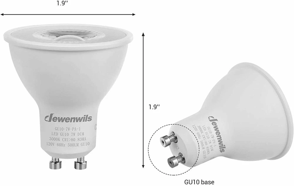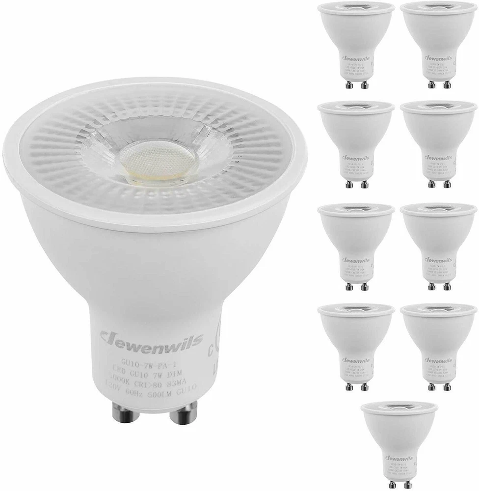 DEW ENWILS 10-Pack/6-Pack GU10 LED Dimmable Bulb, 500LM, 5000K/3000K Warm White Daylight Track Light Bulb, 7W(50W Halogen Equivalent) LED Bulbs, UL Listed 3000K 10 Pack LED Dimmable Bulb-GU10 Base 3000K Warm White DEWENWILS GU10 base spotlights are aimed to replace your current 50-Watt halogen ones, these 7W LED bulbs are rated to last 10, 000 hours, much longer lifespan than the equivalent incandescent lights, saving your money and time. Can be fully dimmable, works with any dimmer switch(NOT included), adjust its brightness to meet any occasion. Choose a dependable high quality 120-Volt GU10 bulb for residential or commercial applications. Size: 1.96*2.16 inch Wattage: 7W(50w equivalent) Lumen: 500LM Beam Angle: 40 degree Package: 10 Pack Color Temperature: Warm White(3000K) 6 Pack LED Dimmable Bulb-GU10 Base 3000K Warm White DEWENWILS GU10 base spotlights are aimed to replace your current 50-Watt halogen ones, these 7W LED bulbs are rated to last 10, 000 hours, much longer lifespan than the equivalent incandescent lights, saving your money and time. Can be fully dimmable, works with any dimmer switch(NOT included), adjust its brightness to meet any occasion. Choose a dependable high quality 120-Volt GU10 bulb for residential or commercial applications. Size: 1.96*2.16 inch Wattage: 7W(50w equivalent) Lumen: 500LM Beam Angle: 40 degree Package: 6 Pack Color Temperature:Warm White(3000K) Voltage: 120V AC 5000K 10 Pack LED Dimmable Bulb-GU10 Base 5000K Color Temperature DEWENWILS GU10 base spotlights are aimed to replace your current 50-Watt halogen ones, these 7W LED bulbs are rated to last 10, 000 hours, much longer lifespan than the equivalent incandescent lights, saving your money and time. Can be fully dimmable, works with any dimmer switch(NOT included), adjust its brightness to meet any occasion. Choose a dependable high quality 120-Volt Gu10 bulb for residential or commercial applications. Size: 1.96*2.16 inch Color Temperature: Daylight White(5000K) Wattage: 7W(50w equivalent) Lumen: 500LM Beam Angle: 40 degree Package: 10 Pack 6 Pack LED Dimmable Bulb-GU10 Base 5000K Color Temperature DEWENWILS GU10 base spotlights are aimed to replace your current 50-Watt halogen ones, these 7W LED bulbs are rated to last 10, 000 hours, much longer lifespan than the equivalent incandescent lights, saving your money and time. Can be fully dimmable, works with any dimmer switch(NOT included), adjust its brightness to meet any occasion. Choose a dependable high quality 120-Volt Gu10 bulb for residential or commercial applications. Size: 1.96*2.16 inch Color Temperature: Daylight White(5000K) Wattage: 7W(50w equivalent) Lumen: 500LM Beam Angle: 40 degree