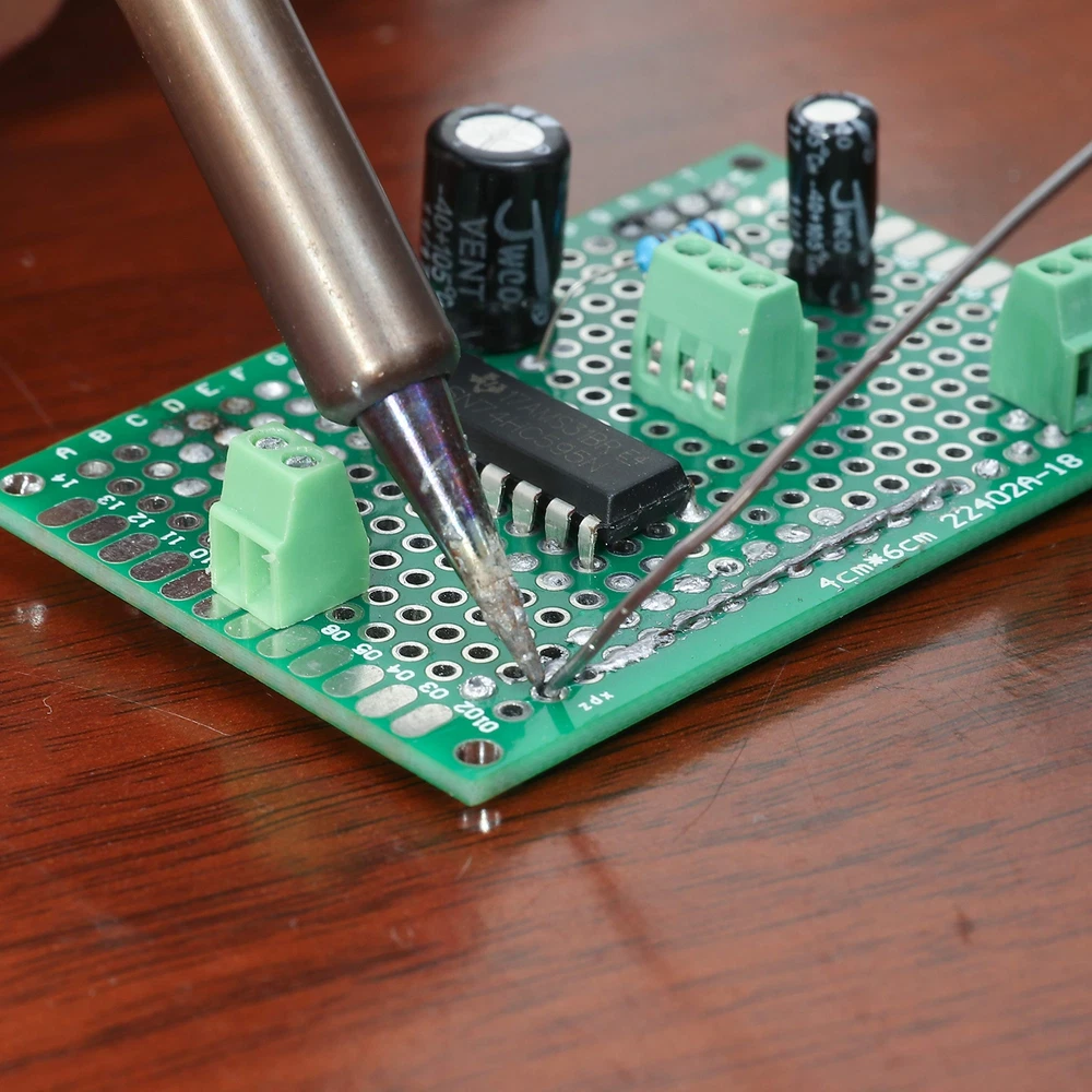 ★ High Quality set of bare PCB with the etched FR4 glass-epoxy circuit board; ★ Solder-able Circuit Protoboards for DIY Electronic Project; 2/3Pin Plug-in Screw PCB Terminal Block Connector; Fit to all sorts of prototype and production PCBs ★ Quality certified; With this proto board you will be able to create or incorporate unique projects into a reliably weatherproof enclosure. ★ Wonderful selection of PCB boards which fit to various electronic projects; With thickness of 1.6 mm and standard 0.1" spacing with a 0.05" offset grid for more flexibility Components Features: PCB Board features and info: - 8 pcs 2 x 8 cm (168 solder points) with a matrix of 6 by 28 Plated Through Hole (PTH) - 8 pcs 3 x 7 cm (240 solder points) with a matrix of 10 by 24 PTH - 5 pcs 4 x 6 cm (280 solder points) matrix of 14 by 20 PTH - 5 pcs 5 x 7 cm (432 solder points) matrix of 18 by 24 PTH - 2 pcs 7 x 9 cm (806 solder points) matrix of 26 by 31 PTH ★ ★ Header Sockets - 10 pcs 1 x 40 Pin Male Header Pin - 10 pcs 1 x 40 Pin Female Header Pin Pitch 0.1'/2.54mm; pin length 11.5mm / 0.45'; ★ ★ Terminal Blocks - 6 pcs 2 Pole Terminal, (2.54-2P) - 6 pcs 3 Pole Terminal, (2.54-3P) ★ Electrical Specification Rated Voltage: 150V/AC; Rated current: 6A; Contact Resistance: 20m Ohm MAX; Insulation; Resistance: 5000M Ohm/1000V; Dielectric Strength: 1250V/1 min ★ Mechanical Specification Temp range: -40F ~ +105C; Torque: 0.1 Nm; Wire range: 26~18AWG; MAX Soldering: +250C for 5 Sec; Strip length: 4.5mm; Pitch 0.1'/2.54mm Terminal blocks; Poles: 2P, 3P ★ Part and Material Screw: M1.5 Steel Zinc plated; Wire guard: Brass, Ni plated; Pin header: Brass, Tin plated; Housing: PA66, UL94V-0 100 % SATISFACTION GUARANTED ★ Excellent quality; Easy soldering; Double sided board with plated-thru holes allows components to be easily soldered to either side of the board THIS IS NOT YOUR NORMAL PERF BOARD! ★ This board is much higher quality with plated-through-holes and annular rings that will not lift off the PCB under normal soldering conditions MUTI-PURPOSE ★ General purpose prototyping circuit board for analog and digital use; With pre-tinned plated holes; Extra accessories to make life easy for you (Screw Terminal Block and Headers) THE FLEXIBILITY OF HAVING CHOICES ★ Great assortment of size and perfect for quickly prototyping stackable circuits; female and male header pin plus screw terminals for your ease and satisfaction PACKAGE COMPONENT ★ 28 Pcs of double sided PCB prototype board in 5 different size with mounting holes or slots on each board corner; 20 Header Socket (female and male); 12 pcs 2/ 3Pole Mount Screw Terminal