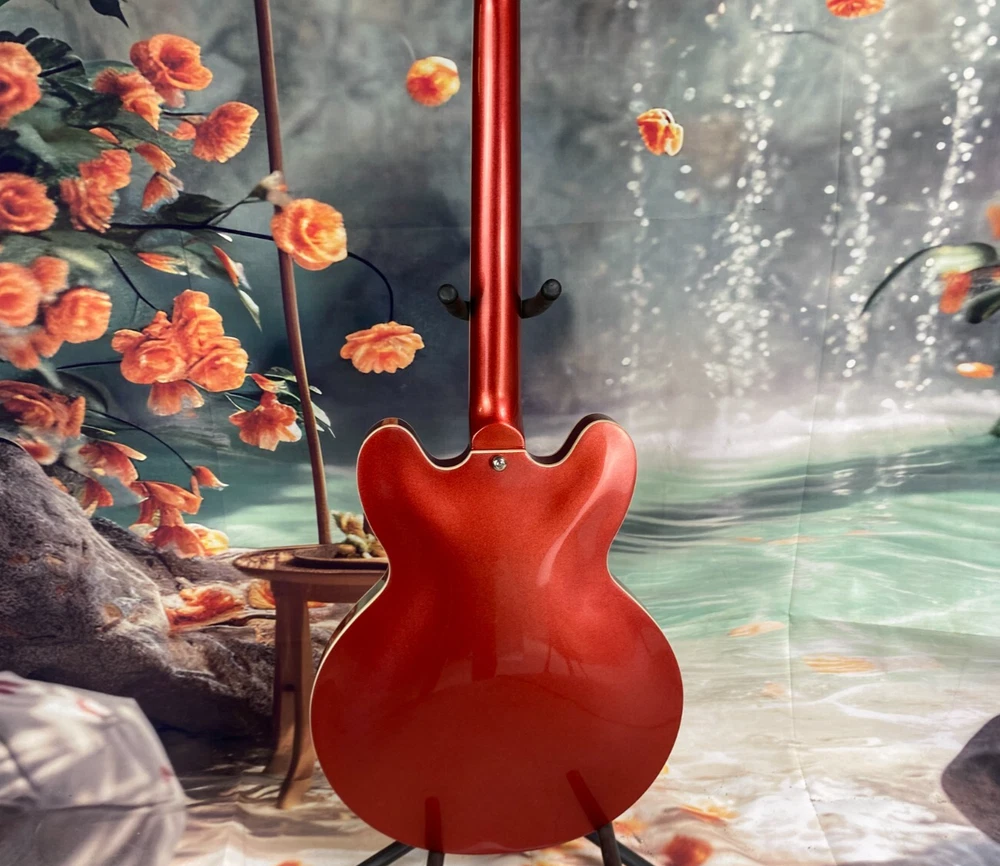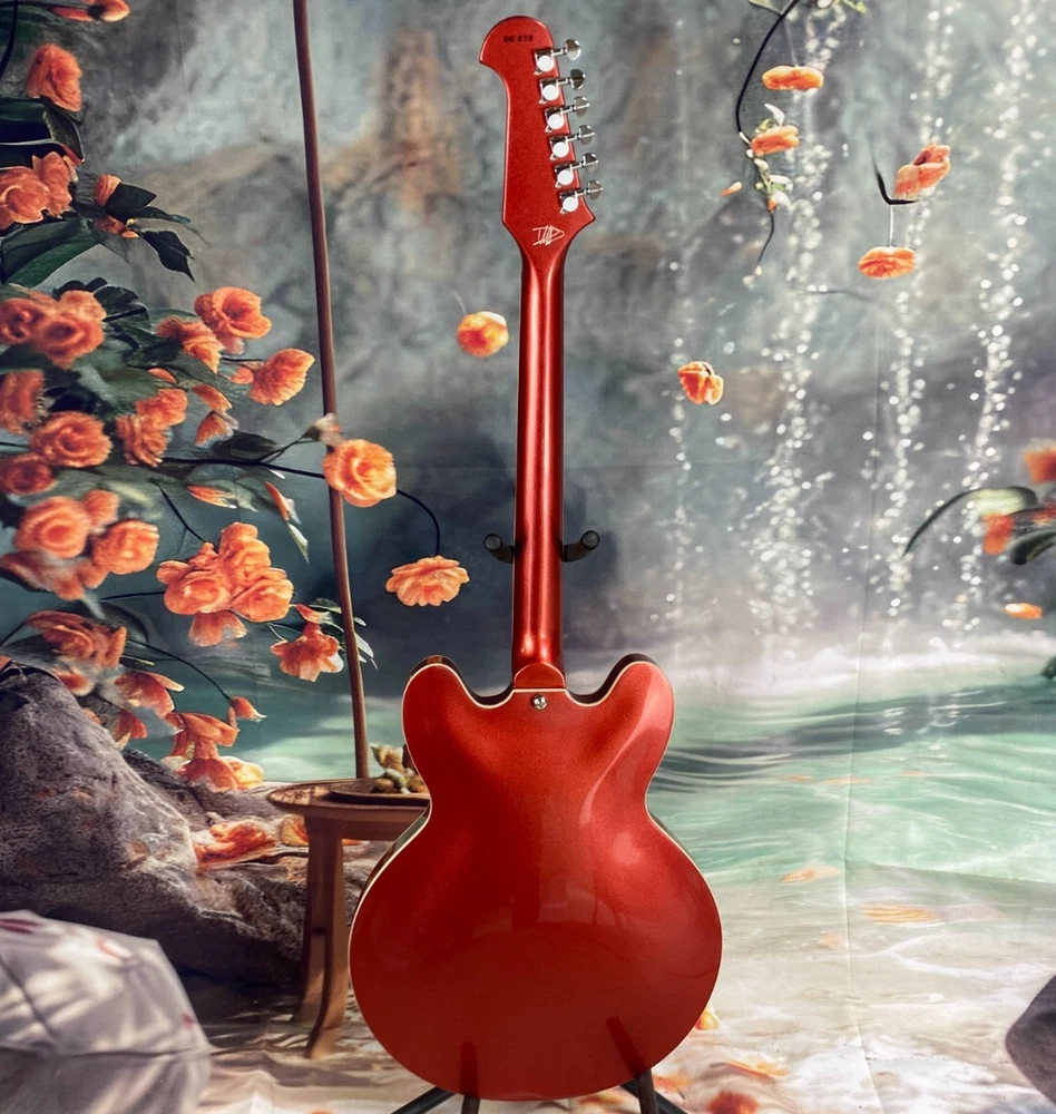 The DG-335 Red electric guitar is a semi-hollow model with a vibrant red body color, making it a stylish choice for guitar enthusiasts. Featuring a mahogany neck, maple body, and rosewood fretboard, this guitar offers a professional level of performance. With 22 frets and a 6-string configuration, this right-handed electric guitar is ideal for musicians looking for a high-quality instrument. The limited time offer adds to the excitement of getting a custom model from China, perfect for players seeking a unique and dynamic sound.