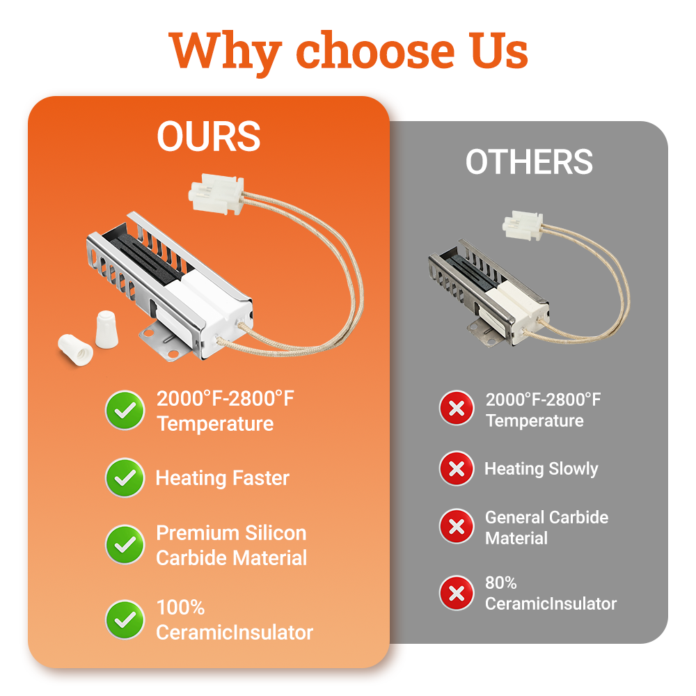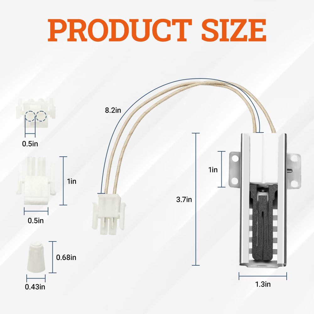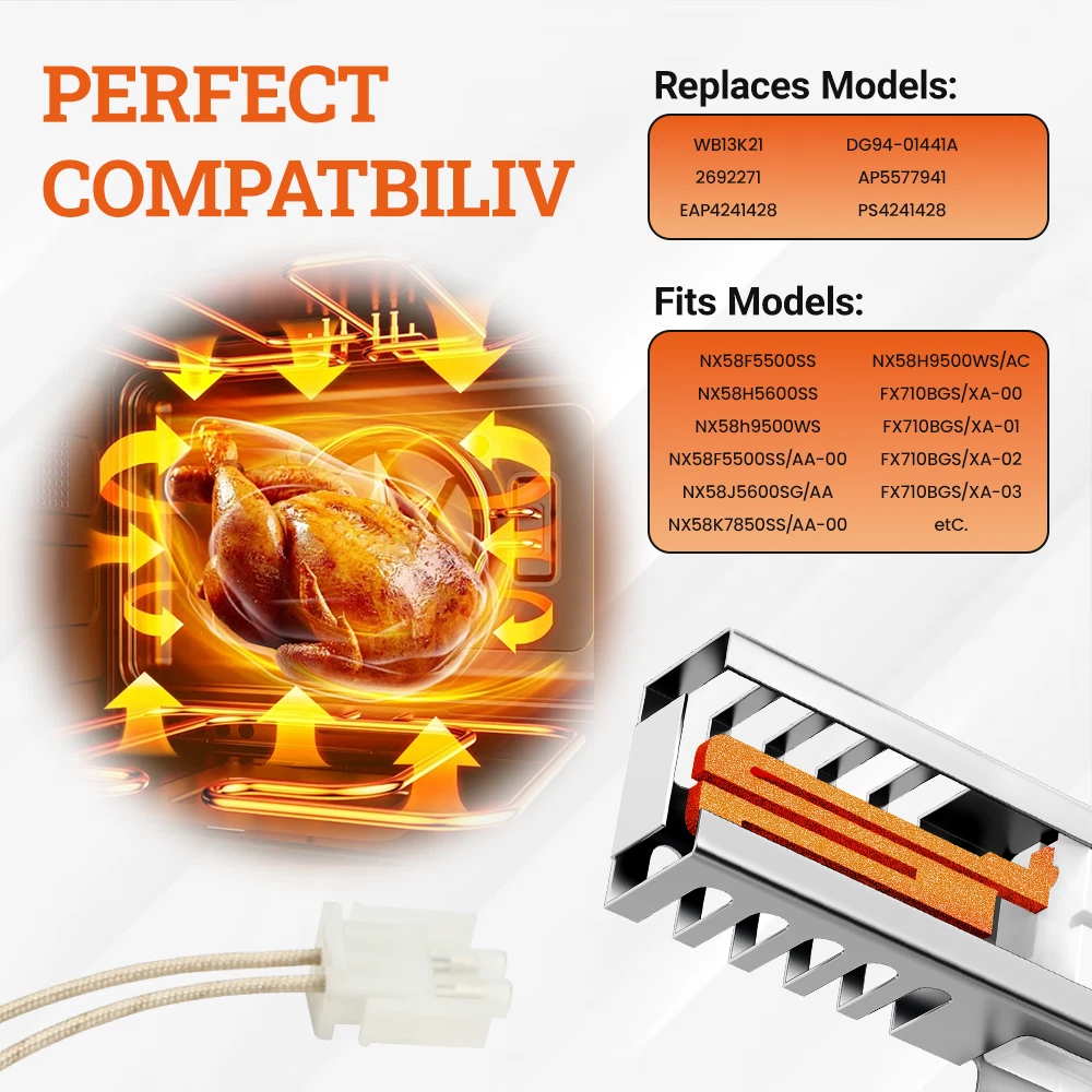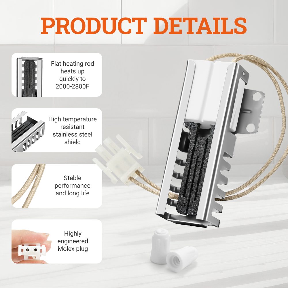 If you are unsure if your machine model matches, please contact customer service to confirm before placing an order. 【PRODUCT INCLUDED】: oven igniter includes 2 ceramic wire nuts,1 connector plug,and two connecting wires.Perfectly solve the problem of oven not heating or heating slowly,extending the service life of the oven. 【UPGRADED IGNITORS】: DG94-00520A fits for Gas Range oven ignitor.Using safe and high-quality materials,it effectively reducing preheating time,and regulating temperature normally,Our product has undergone aging testing,but due to its special material,there may be occasional discoloration issues,which will not affect its effectiveness.Please rest assured that our product quality meets OEM standards. 【COMPATABLE MODELS】: DG94-00520a igniter Compatible with nx58h5600ss/AA NX58F5500SS/AA NX58K9500WG/AA FX710BGS/XA NX58K9850SS/AA NX58H5650WS/AA NX58H9950WS/AA NX58F5500SB/AA NX58F5700WS/AA NX583G0VBSR/AA NX58J5600SG/AA NX58J5600SG/AA NX58K9850SG/AA NX58M5600SB/AA NX58M5600SW/AA NX58M9420SS/AA NX58H9500WS/AC NX58M6850SS/AA NX58M6630SG/AA NX58R5601SG/AA NX58R5601SS/AA NX58R4311SS/AA NX58T7511SS/AA NX58R4311SG/AA NX58R6631SS/AA NX58R6631SG/AA. 【INSTALLATION INSTRUCTIONS】: Simply remove the old igniter and reconnect the new one( If wire connector does not match up you will need to cut off the connector and splice the wires with porcelain wire nuts). Unplug the cooktop before installing the oven igniter. 【AFTER-SALES SERVICE】: If you have any questions or dissatisfaction after receiving the gas oven igniter replacement,please contact us in a timely manner.We will solve them for you in a timely manner and give you a satisfactory result.