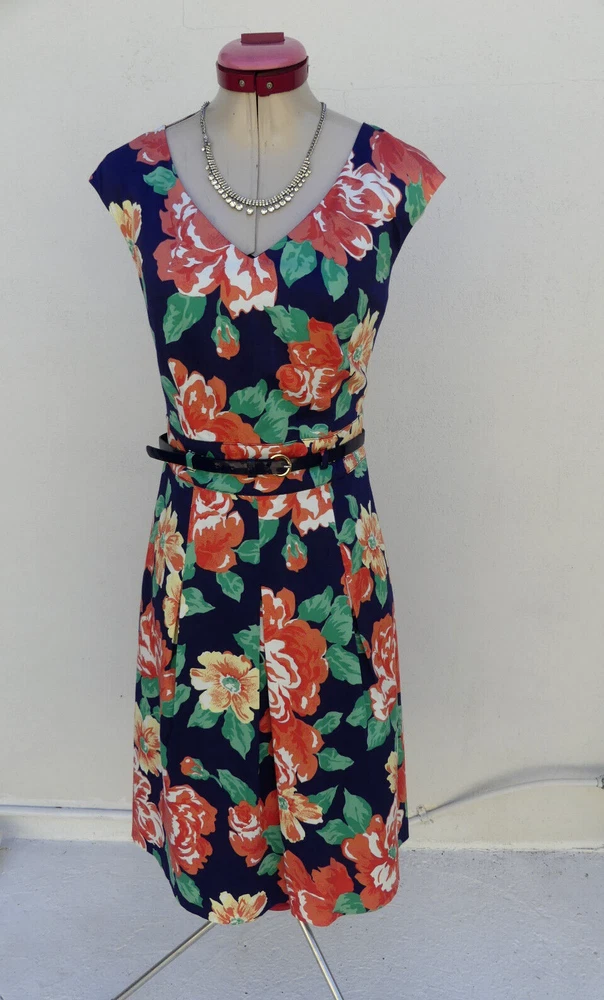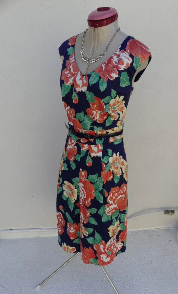 This gorgeous DRESS is sleeveless, with a v-neckline. It is fully lined and fastens with an invisible zip and hook & eye at the back. It is a Fit & Flare style, with a full, pleated skirt and comes with a matching navy blue belt with gold accents. It is navy blue, with a floral print in white, yellow, green, orange, peach and coral colours. It is from DIANA FERRARI and is a size 10, but please check the measurements below, to ensure a good fit. The approximate measurements are: Bust: 90cm Length: 95cm For any other measurements, please use the ‘Contact Seller’ button. It is in GOOD condition, with light wash/fade (it's not as dark as the photos have come out) and light pilling. Lots of other information about this fabulous dress can also be found in Item Specifics. DDD004 Please take a look at the tons of other gorgeous items I have available in your size! I love to combine postage and save you money! So if you are purchasing more than one item from me, please wait for me to send you a combined invoice, or press the 'Request a Total' button in your Cart before paying. I rate my items in the following way: BNWT / BNWOT: Brand New, With Tags or Brand New, Without Tags (some part of the tag will still be attached). New items that have never been worn. EXCELLENT: has been worn, but shows very few actual signs of wear. GOOD: has been worn and is showing light signs of wear. FAIR: has been worn and is showing more signs of wash/wear - or has a small fault, which will be clearly described in the listing I am only human and can make mistakes in my listings and descriptions - so if for any reason you are unhappy with your purchase, please contact me using the 'Contact Seller' button first, so we can quickly resolve the issue. This item comes from a SMOKE FREE HOME but the odd puppy hair may drift in due to the fact she is my darling shadow throughout the day.