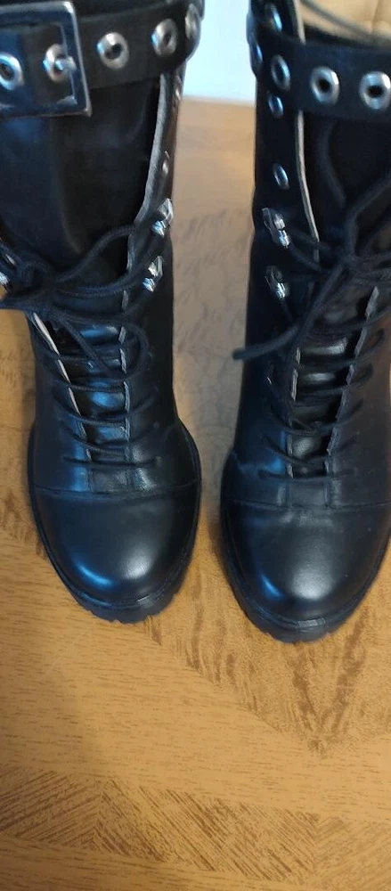 This gorgeous women's black leather platform ankle boot comes with leather buckled straps that can be used on the boots or not. Worn once for about 5 minutes but they didn't work for me since I have VERY difficult feet. 4.5" heel 2 sets of interchangeable buckle straps to place on the outside of the boot after lacing it up.