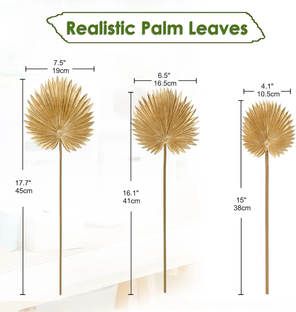 DILATATA Pu Foam Gold Artificial Palm Leaves Faux Tropical Product Details Brand: DILATATA Plant or Animal Product Type: Palm Color: Gold Material: PU Foam Product Dimensions: 3"D x 2"W x 2"H Specific Uses For Product: Home Decor Package Information: all Occasion: Seasons Manufacturer: DILATATA Item Weight: 7 ounces Material:These leaf parts are made of high-quality PU foam, which is soft touch while shapely. Leaves are a vibrant tropical green, not easily damaged and lightly washable.The stems are made of iron wire wrapped with rubber, which is extremely flexible and easy to bend or cut. Various Size: 18L.×7.5W. -2 stem 16L.×6.5W.-2 stems 15L.×4W.-2 stems,total 6 stems. Care free - Fake leaf plant is uv resistant and never fade, can be put outside,front porch, back deck, garden, veranda, balcony ,reservation where the hot weather kills much fresh plants. These Palm Leaves are Ideal for Hawaiin Party , Tropical Party Decorations , Tropical Island. Jungle Party Supplies , Palm Leaves Pool party , Wedding Palm Leaves Decorations , Restaurant Décor , Craft Supplies , Concession Stands , Juice bars , Fast Food Shop , Birthday Party , Baby Shower Decorations. The palm leaf is suitable as supplementary flowers for bouquets to look fuller, and also works wonderfully just by itself in the vase.When you are planning to have a boho-themed wedding or boho flair home decor, it can be mixed in with our other artificial flower products to create an advanced flower decoration. -Suitable for DIY into entrance & aisle welcome floral decor. Long enough stems and leaves will add eye-catching decoration to every corner. -Can be used as filler flowers for wedding bouquets, suitable for placing on the edge of the bouquet to make the bouquet look fuller. -It can be mixed in with other artificial flower products to create an advanced flower decoration as a centerpiece in a vase. -Exquisite craftsmanship Use the best craftsmanship to restore the look of the real monstera leaf Its highly simulated look makes people feel good when looking at it -Real touch and lifelike looking Wonderful Decoration These branches will light up any occasion---Add greenery to home. It can be used as foundation plantings for many gardens , or even backdrops Putting in a suitable size container will give you a comfortable visual experience for the corner of your room or party.