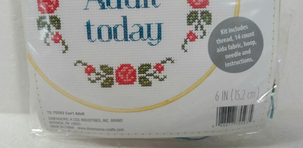 Express your creativity with this DIMENSIONS Cross Stitch Kit featuring the phrase "I CAN'T ADULT" in a small, round hoop included. This kit has everything you need to create a beautiful cross-stitch masterpiece. The brand is well-known for its high-quality products, and this kit is no exception. The hoop is bundled with the kit, making it a complete set for you to start stitching right away. The theme of the kit is words and phrases, and it features a style of small cross-stitching. This kit is perfect for those who love to create and express their unique style. Make a statement with this DIMENSIONS Cross Stitch Kit and create a beautiful piece of art that will last a lifetime.