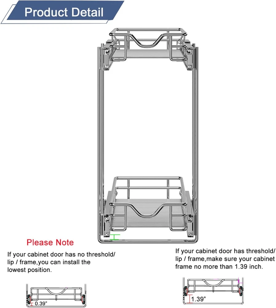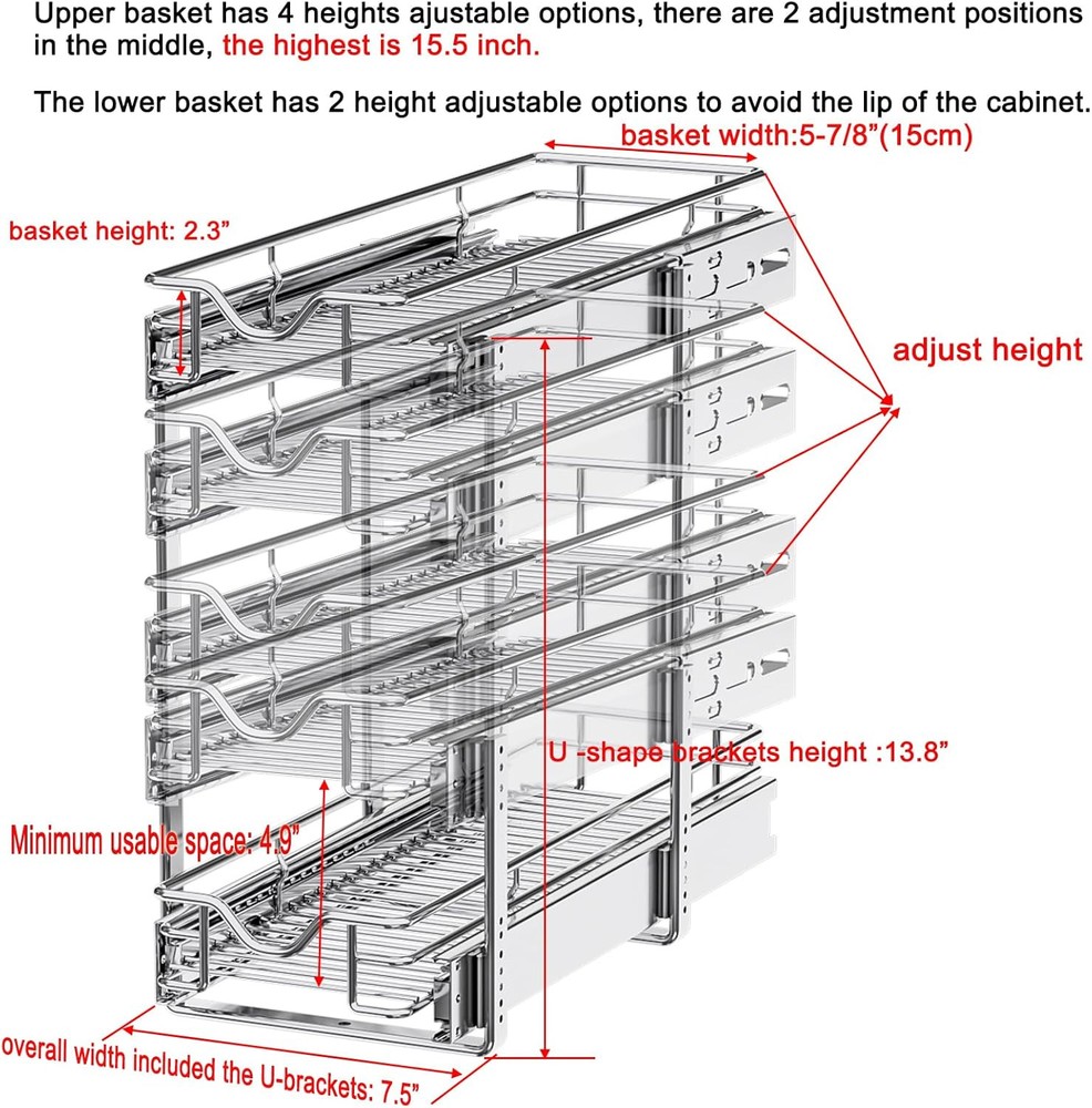 DINDON Pull Out Cabinet Organizer 7-1/2"W X 21-1/2"D, Chrome Product Details Material: Stainless Steel Color: Chrome Special Feature: Moistureproof, Expandable, Adjustable, Rust Resistant Product Dimensions: 21.5"D x 7.5"W x 15"H Shelf Type: Pull-Out Shelf Number of Shelves: 2 Room Type: Laundry Room, Kitchen, Bathroom, Dining Room Finish Type: Glossy Assembly Required: Yes Mounting Type: Bottom mount Recommended Uses For Product: Cookware, Dishware Included Components: 2 pairs Drawer slides, Hardware fitting pack, 2 x Baskets, 2 x U-shaped brackets Item Weight: 11.9 Pounds Brand: DINDON Shelf Weight Capacity: 75 Pounds Is Customizable: No Item Weight: 11.9 pounds Country of Origin: China Size: 7-1/2"W X 21-1/2"D Finish: Glossy Pattern: Solid Shape: Rectangular Number Of Pieces: 1 Special Features: Moistureproof, Expandable, Adjustable, Rust Resistant Usage: Utensils, Cleaning Supplies Batteries Included?: No Batteries Required?: No Material: Stainless Steel Color: Chrome Special Feature: Moistureproof, Expandable, Adjustable, Rust Resistant Product Dimensions: 21.5"D x 7.5"W x 15"H Shelf Type: Pull-Out Shelf 【Product Size】 DINDON pull out cabinet organizer overall size is 7-1/2" W x 21-1/2"D x 15" H, this slide out cabinet organizer size refers to the maximum width including the U shape brackets, actual the basket size is 5-7/8”W x21-1/2”D x 2-3/8”H. Fitting cabinet with more than 7-1/2" W clearance between door hinges or larger. If your cabinet has hinges, measure the width from the hinges, otherwise the hinges will prevent the basket from being pulled out. 【Smooth Slide Out System】 This pull out shelves come with ball bearing slide system,it slides out effortlessly and holds plenty,provide you with accessibility without having to bend and crawl to the back of the dark cabinet to find items.you do lose about 2 inches of room due to the slides being on the sides. Each tier can hold up max weight is 75 lbs without stretching, the weight capacity of each tier in the extended position is less than 40 lbs. 【Premium Material】 This 2 tier pull out spice rack for inside cabinet made of heavy-duty wire construction,chromed, not easy to rust and deform, durable. this pull out shelves makes it more sturdy to hold up to 75 lbs, durable enough to store everything you put in it. It is very sturdy to hold spice jar, bottles. 【Height Adjustable Design】 The upper and lower wire baskets have two height adjustment position, middle has 2 adjustable positions, which can easily solve the problem that the lower wire basket can't be pulled out if your cabinet has the lip or threshold. With a minimum height of 13.8 inches and a maximum height of 15 inches. 【Easy to install 】This pull-out home organizers includes simple step-by-step instructions along with all of the hardware necessary for easy installation. Pls note: The U- bracket screws are not short, pls pay attention to the direction of the mounting screws,the screws are installed from the inner rail. Watch the installation videos, they explain it all. if you have any questions with the product , please contact our customer service first, we will reply to you in 24 hours.