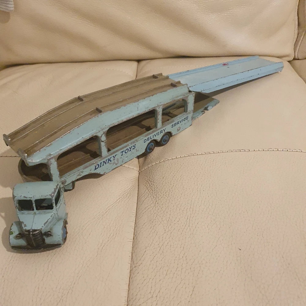 582 THE PULLMORE CAR TRANSPORTER ISSUED BETWEEN 1953-64. A VERY RARE VERSION OF THIS HIGHLY POPULAR DINKY SUPERTOYS. COMES COMPLETE WITH ORIGINAL LOADING RAMP . OVERALL THE MODEL IS IN VERY GOOD CONDITION FOR ITS AGE DISPLAYING SOME HANDLING/PAINT WEAR. PACKED WEIGHT 575gm
