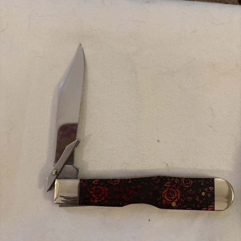 This Case XX pocketknife is a unique addition to any collection. The blade range of 2.76 - 4in. and clip point blade type make it a versatile tool for everyday use. The ambidextrous opening mechanism and mid lock lock type ensure safety and ease of use. The knife features a beautiful red rose handle made of bone and a plain edge blade. It is an original item from the United States and part of the SFO 1 Of 500 product line. The knife comes with a California Prop 65 Warning, making it a compliant product.