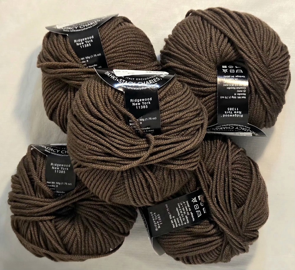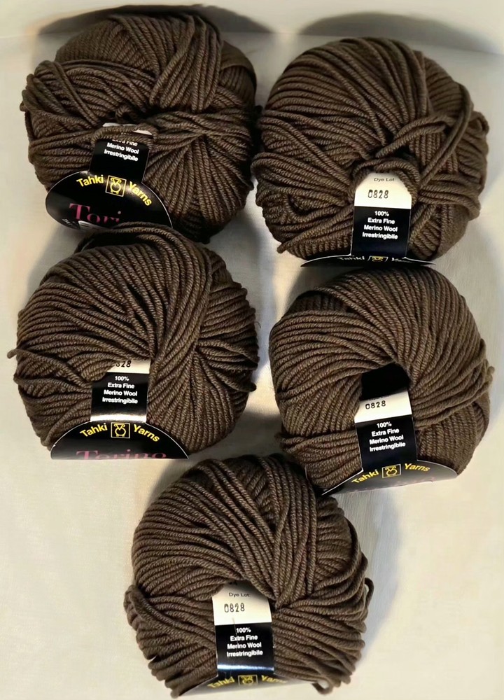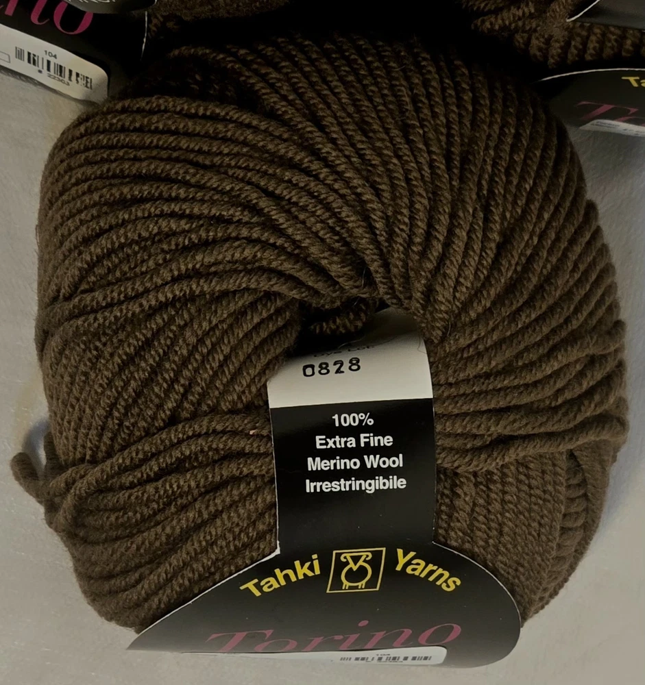 This lot features the highly sought-after, discontinued Tahki Yarns Torino, a luxury Italian merino wool. Perfect for high-quality garments and accessories. Known for its exceptional softness, luxurious feel, and machine-washable properties, Tahki Torino is a favorite for durable garments with great stitch definition. Since it is a discontinued luxury line, this quantity is hard to find. YARN DETAILS: ▪︎Origin - Made in Italy ▪︎Yarn Weight - # 4 Medium / Aran Weight ▪︎Fiber - 100% Extra Fine Merino Wool (Superwash) ▪︎Color - #108 "Chocolate" ▪︎Dye Lot - #0828 Quantity 5 x 50g Skeins ▪︎Skein Yardage - 94 yards | 86 meters (470 yards total) ▪︎Skein Weight - 50 grams (250 grams total) ▪︎Needle - US 8 (5 mm) ▪︎Gauge - 18 sts This rare lot of 5 skeins remains in its original labeling and unused. It has been stored away from all elements in a smoke-free, pet-free, and fragrance-free home. Don't miss out on this rare, high-quality Italian yarn!