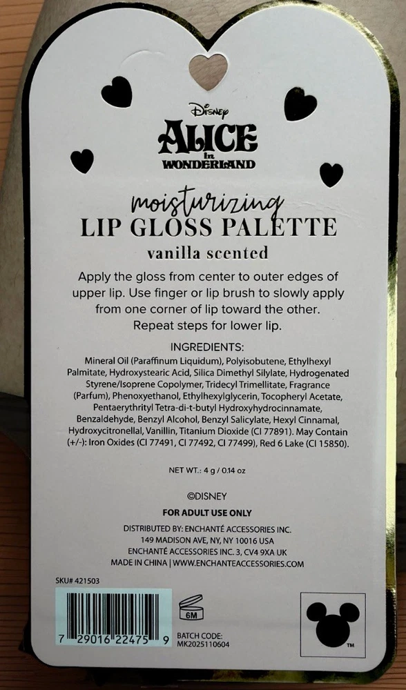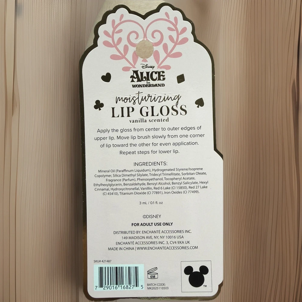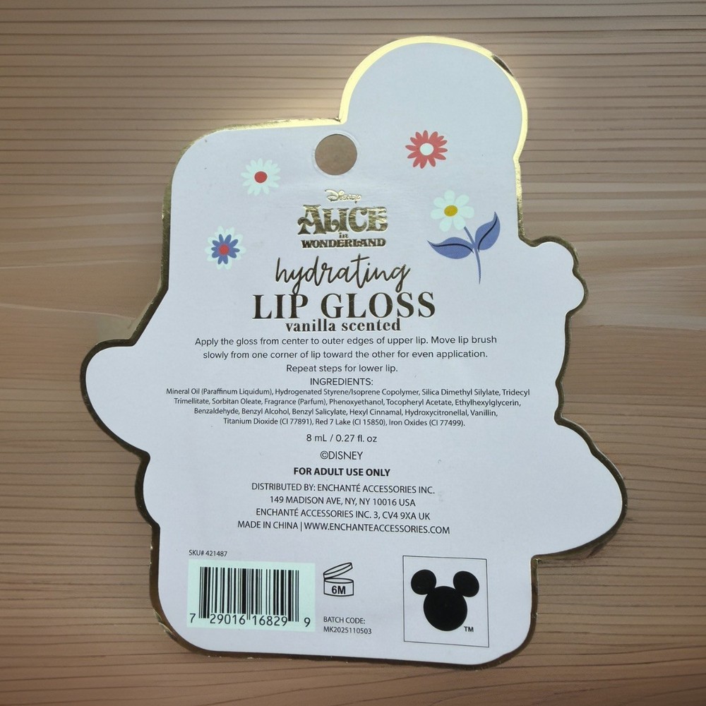 Shade: Assorted Features: Hydrating, Long Lasting Country of Origin: China Size: Standard MPN: n/a Effect: Shine Type: Lip Balm, Lip, Gloss, Lip, Palette Volume: 0.27 fl oz Flavor: Vanilla Scent Product Line: Disney Alice In Wonderland Expiration Date: 12m After Opening Scent: Vanilla Formulation: Liquid Brand: Disney