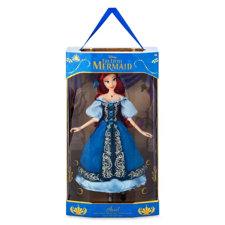 Product Details Let Ariel be part of your world with this limited-edition The Little Mermaid doll. After making a deal with Ursula the sea witch, Ariel joins the human world where she reunites with Prince Eric and ultimately finds true love. Disney artists are proud to present this distinctive Ariel doll, costumed in a lavish interpretation of her on-land peasant dress. Magic in the details Limited Edition of 5,300 Certificate of Authenticity Expressive, highly detailed sculpting Poseable Satin peasant dress with cold shoulders Chain necklace with pendant Chiffon puff sleeves and ruffled neckline Satin corset with golden filigree embroidery and satin ribbon ties Brocade overskirt with contrast trim and golden filigree embroidery Faceted gemstone studs Satin skirt Slip skirt with fine lace trim Molded shoes with satin ribbon ties Satin hair ribbon Finely styled hair Rooted eyelashes Display stand included Comes in elegant window display packaging with golden foil accents, ribbon ties and carry handle Celebrating the 35th Anniversary of Disney's The Little Mermaid (1989) The bare necessities Ages 6+ PVC / ABS plastic / polypropylene / polyester Doll: approx. 16'' H Package: approx. 18 3/4'' H x 11'' W x 5 3/4'' D Imported Item No. 416143347900