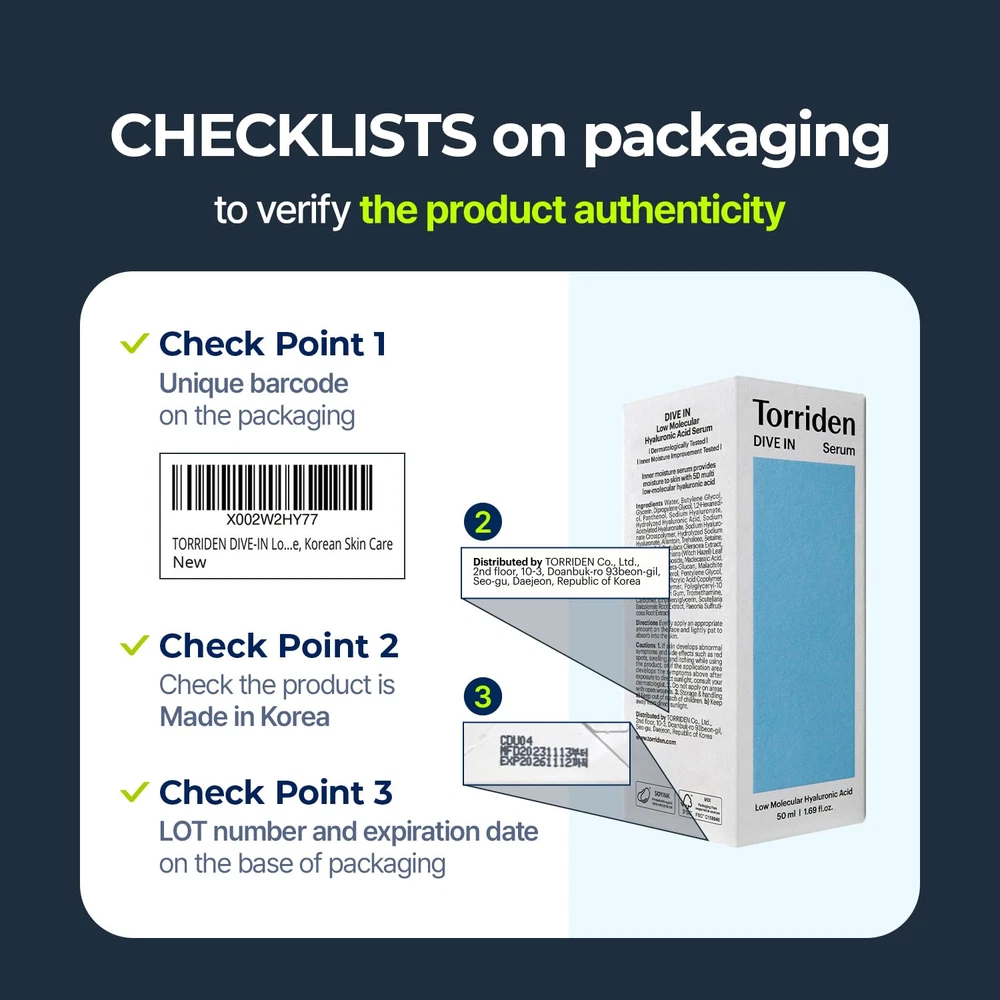 DIVE-IN Low-Molecular Hyaluronic Acid Serum Vegan Korean Skin Care Product Details [5 SECOND SERUM] Low Molecular Hyaluronic Acid Serum focuses on hydrating and soothing the skin from the inside. Its lightweight texture absorbs rapidly and deeply into your skin. [5D COMPLEX HYALURONIC ACID]: 5 types of molecules of HA allows moisture to absorb immediately, deeply, and densely inside your skin to by building 3D networks in the layers of the skin to maintain hydration and moisturization to plump your skin. [ALL DAY HYDRATION] Dive-In Serum has a watery and transparent texture which absorbs instantly into the skin, leaving no stickiness or greasiness. Dive-In skincare line is ideal for dry and dehydrated skin type. [SAFE & HYPOALLERGENIC] Free of artificial fragrance, colorants, parabens, mineral oils, isopropyl alcohol, and other ingredients. They've been tested to be not irritating for skin, and the formula is hypoallergenic and suitable for all skin types including sensitive and acne prone skin. [CLEAN BEAUTY] Our goal is to pursue clean, safe, and sustainable beauty for the future, and so we made our products certified VEGAN and use FSC Certified packaging. All of our products include no animal-derived ingredients or animal testing (cruelty-free). Product Description 1 Test Results 2 Texture 3 Benefits 4 Certifications 5 How to use 1 Review1 2 Review2 3 Review3 Your Hyaluronic Acid infused DIVE-IN Skin Care Regimen Add to Cart Add to Cart Add to Cart Add to Cart Add to Cart Add to Cart Add to Cart Customer Reviews 4.5 out of 5 stars 1,850 4.5 out of 5 stars 709 4.5 out of 5 stars 1,850 4.6 out of 5 stars 125 4.5 out of 5 stars 272 4.5 out of 5 stars 175 4.4 out of 5 stars 126 Price $13.20 $ 13 . 20 $16.20 $ 16 . 20 $35.00 $ 35 . 00 $25.79 $ 25 . 79 $17.00 $ 17 . 00 $20.52 $ 20 . 52 $23.00 $ 23 . 00 What it is Hyaluronic Acid Facial Serum Gentle & Soothing Moisturizer Hyaluronic Acid Facial Serum Sheet Mask For Exra Moisture Gentle & Hydrating Face Wash Hydrating Facial Toning Water Moisturizing Face Cream Core Ingredient 5D Hyaluronic Acid Complex 5D Hyaluronic Acid Complex 5D Hyaluronic Acid Complex 5D Hyaluronic Acid Complex 8D Hyaluronic Acid Complex 5D Hyaluronic Acid Complex 5D Hyaluronic Acid Complex Key Ingredients Panthenol, Allantoin Panthenol, Allantoin Panthenol, Allantoin Panthenol, Allantoin Sodium Cocoyl Glycinate Panthenol, Allantoin Peptide, Allantoin Texture Lightweight, Refreshing Bouncy, Moistful, Rich Moon-shaped Soft Cotton Fluffy & Ultra Soft Sheet Mousse-like Cream to Rich Foam Lightweight, Refreshing Water Lightweight, Smooth, Soft Recommended For Dry & Sensitive (All) Dry & Sensitive (All) Dry & Sensitive (All) Dry & Sensitive (All) Dry & Sensitive (All) Dry & Sensitive (All) Dry & Sensitive (All) Certified Vegan ✔ ✔ ✔ ✔ ✔ ✔ ✔ Cruelty-Free ✔ ✔ ✔ ✔ ✔ ✔ ✔ When do I apply this? A deeply hydrating facial serum for daily use, it is suitable for both your AM and PM routine. Apply liberally after cleansing and toning. Which skin types is the serum suitable for? While it is more deal for dry, dehydrated, and combination skin types, it is suitable for all skin types. Is this product authentic? Make sure that you are purchasing from Torriden. We cannot verify the authenticity, quality, and safety of Torriden’s products sold through unauthorized third parties. Patch Testing Not all skin types are the same, which is why when trying new products, we strongly advise that a small patch test is conducted before going ahead with regular usage to ensure skin compatibility. Item model number 8809504742766 Color Pack of 1 (1.69 fl.oz) Product Dimensions 1.85 x 1.85 x 4.3 inches; 1.76 ounces Country of Origin Korea, Republic of Product Benefits Hydrates, Moisturizes, Soothes, Calms, Plumps Special Ingredients Hyaluronic Acid, Panthenol Use for Face Skin Type Oily, Combination, Sensitive, Dry Scent No Scent 1.85 inches x 1.85 inches x 4.3 inches. Weight: 1.76 oz Payment Details We accept all payments via Ebay using Credit Cards , PAYPAL , Apple Pay and many others Shipping Details We are always working hard to ensure your package arrives as soon as possible. Please understand that some factors like weather, high postal traffic, and the performance of shipping companies are outside of our control. Delivery & Return Policy Details We offer a 30-Day Return Policy on items in which you are not completely satisfied with. You have the option of a full-refund or an exchange of the item. No returns are available on items shipped outside of the USA.