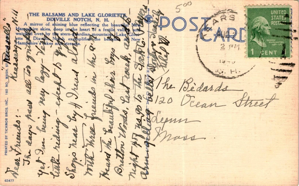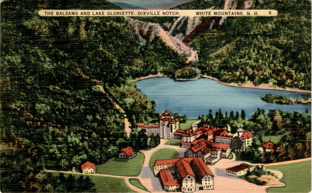 MAKE AN OFFER. THE MORE YOU BUY THE BETTER DEAL I WILL ACCEPT The postcard features an image of The Balsams and Lake Gloriette in Dixville Notch, White Mountains, New Hampshire. The postcard was printed by Tichnor Bros. Inc. The message on the postcard mentions activities such as riding, shopping, and attending a choir performance at Bretton Woods.