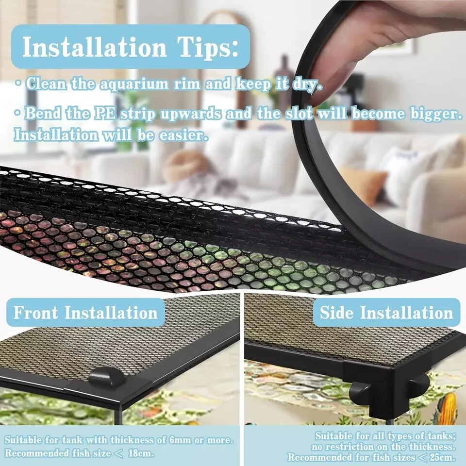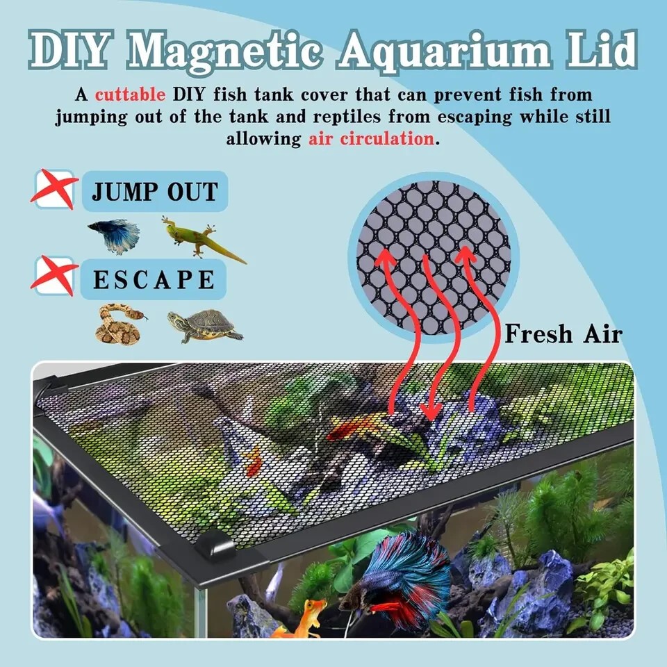 The Magnetic Fish Tank Lid is an emerging product that prevents fish from jumping out of the tank, prevents reptiles from escaping without harming them, and is suitable for use with a wide range of animals and tanks. 【Perfect Fit Aquarium Size】 Compared with traditional aquarium lid, our DIY lid is not only suitable for square tanks (29 gallon, 20gallon, 10 gallon, and other square aquariums less than 36" x 18"), but also can be used for non-standard size, round and curved fish tanks, the strips are very soft and bendable, the mesh can be cut, you can cover the different shapes of tanks on top. 【High Quality Netting】The netting is strong, corrosion-resistant, and can withstand the high temperature of the heating lamp; 5mm hole, is large enough to ventilate, and pets can get air circulation. 【Special Magnetic Design】 Strong magnetic suction, infinite switch, quick to open. The switch is soundless, will not scare the pets. With pull handle design, easy to open and close, easy to feed. 【Flexible Installation】Two kinds of installation methods: front installation -- the thickness of aquarium > 6 mm; side installation -- unlimited thickness, curved aquariums, shaped aquarium and so on.In addition, the mesh can be cut to install the filter air pump. Product Description Magnetic fish tank lid is a product that prevents fish from jumping out of the tank and reptiles from escaping without harming them, suitable for all kinds of animals and fish tanks. Compared with traditional fish tank covers (iron mesh, plastic, glass, etc.), our DIY fish tank cover is not only suitable for square fish tanks (29 gallon, 20gallon, 10 gallon, etc. less than 36" x 18" square fish tank), but also can be used for non-standard sizes of fish tanks, round, curved fish tanks. The magnetic and PE strips are very soft and can be bent, and the mesh can be cut, you can cover on top of different shapes of fish tanks, with very strong practicality. The cover mesh is made of high quality polyester fiber, soft and durable, won't hurt the fish jumping up, the mesh hole is big enough, not only good ventilation, but also allows the fish bait to pass through directly, easy to feed, the mesh can also be cut to allow filters, greenery to pass through, it is both beautiful and practical. On Aug 18, 2025 at 08:06:16 PDT, seller added the following information: