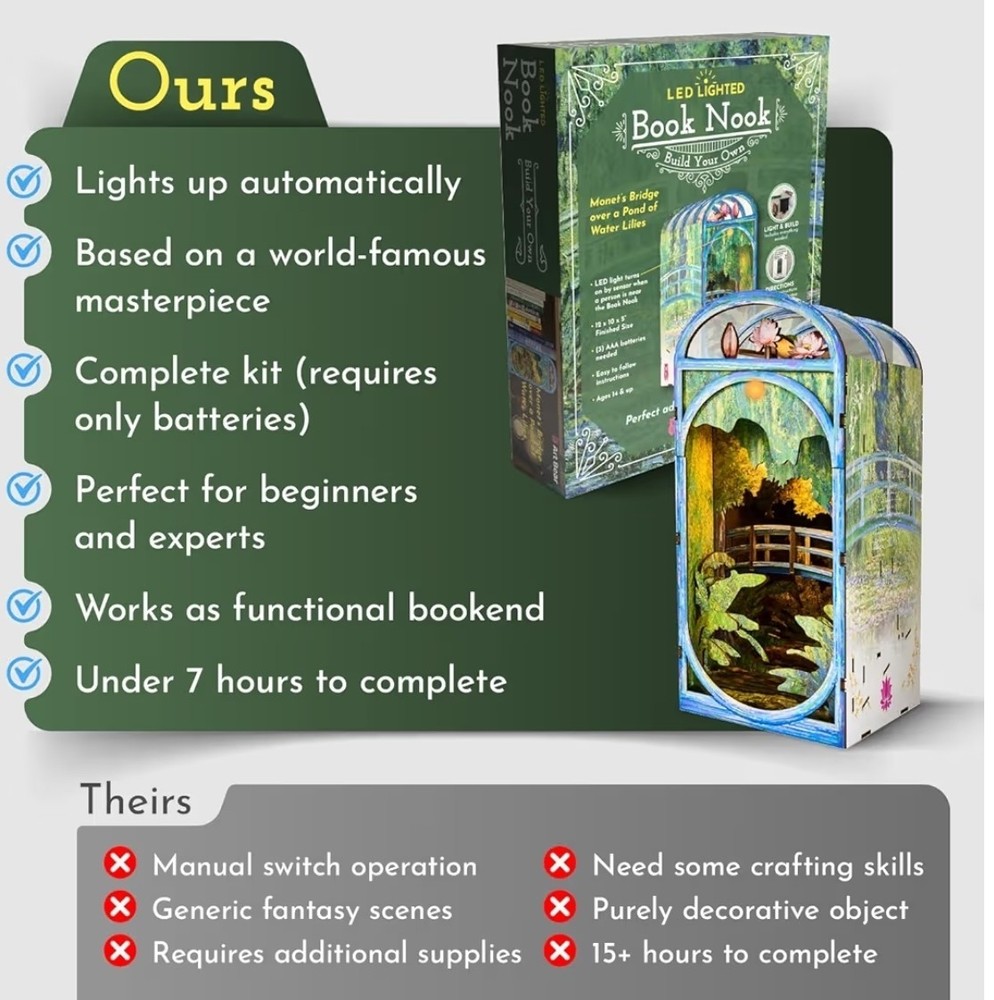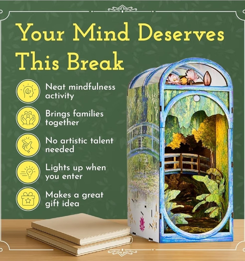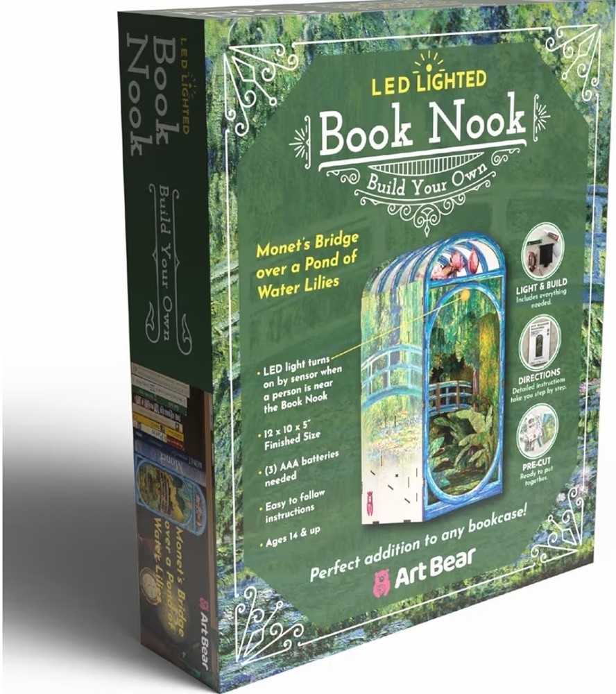 Condition: New Factory Sealed DIY Book Nook Kit - Monet Mini House Building Book Nook Kits for Adults - Wooden 3D Puzzle Bookshelf Accessory for Artisans - Perfect DIY Miniature House Kit & Creative Bookends Gift for Book Lovers Bring art history to life with this art puzzle specially designed to captivate all artists, creatives and lovers of fantasy. A perfect gift for book lovers, this bookshelf decor will keep anyone entertained for hours on end during assembly and then offer a bookshelf accessory and bookend that is a work of art all on its own. The LED motion sensor lights work with the hollow design to illuminate this beautiful work of art and book decor. This diorama box will take you back in time to the Impressionist Era. Illuminate your space with the work of one of art history's greatest masters. This miniature book nook kit combines a working wooden puzzle box with decorative craft, an artistic bookend and the fun of model kits for adults. Designed to accent any room, style or home library decor, this 3D puzzle will bring a touch of 19th century Provence, France to your space. A gorgeous booknook kit to add to any home library. This DIY book nook will bring a miniature world of culture to any room or shelf. Gaze at one of the worlds most famous paintings come to life on your book shelf as you relax or drift off to sleep. All of the Art Bear Book Nook Kits are carefully examined and checked before they are shipped, ensuring that you have all of the pieces that you need to assemble. Before beginning, please make sure that you have two AA batteries and glue. Any liquid glue, even super glue, will work just fine. However, PVA glue usually works best