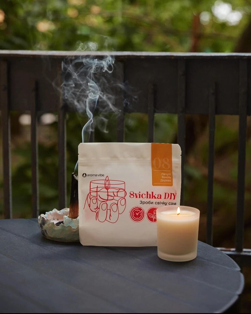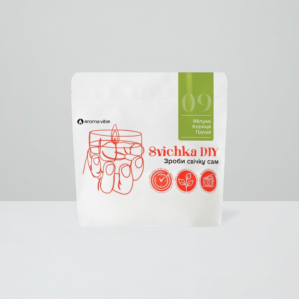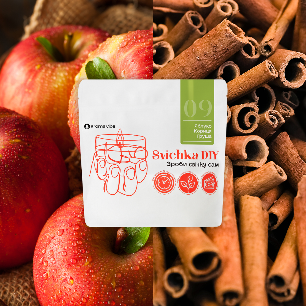 Create Your Own Scented Candle: DIY Candle Kit with Natural Soy Wax, Apple, Cinnamon & Pear This fragrance is a real machine that can transport anyone to the carefree times of childhood, when your mother or grandmother prepared an indescribably delicious apple pie for your birthday or Christmas, and every minute of waiting for it turned into a real test. In color solutions: pink, yellow, orange Space: sweet shop, cafe, coffee shop, pastry shop, children's room, kitchen, kindergarten Atmosphere: summer, childhood, joy from little things, holiday Aroma card DIY Candle Making Kit Family: fruits Notes: apple, cinnamon, ripe fruits and berries Sweetness: ★★★ Astringency: ★☆☆ Freshness: ★☆☆ Composition of the set 300 grams (10.5 ounces) of natural soy wax Cotton wick Centering rod Naturally DIY candle kit 300 grams (10.5 ounces) of natural, ecological soy-based wax with safe aromas and essential oils. Without parabens, paraffin and phthalates. A true perfume Perfumed aroma filling made in France. Smells like the best candle you could find anywhere. No apples and strawberries from China. Ecologically 100% recyclable packaging. The candle does not leave behind anything that can harm nature. Use and safety techniques Burning time is approximately 60 hours Cut the wick to a length of 0.5 cm (0,19 inch) before each smoking Never leave a lit candle unattended Avoid drafts and contact of the candle with flammable materials Keep away from small children and pets The recommended burning time is not less than 1 hour and not more than 4 hours in a row Soy wax We use exactly 100% soy wax. This wax is clean and safe for your health. It also provides the best aroma output and long-lasting burning. High-quality aroma oils The candles you make will not differ in aroma from the highest quality candles on the market. In addition, aroma oils are certified and do not contain parabens, phthalates and other harmful chemicals. Made in Ukraine Each set is made by hand in Kyiv with pride and care. Create comfort with your own hands You will be amazed by the quality of the candles that you will get, because we have developed a very high-quality mixture of soy wax and natural aroma oil on a par with premium candles of the highest quality. DIY Candle is a candle refill . Inside the package, you'll find everything you need to create a candle: pre-scented soy wax , a wick, and a stick to center the wick in your future candle. To make your own candle, you only need our kit, a container, a microwave or a pot of water, and 5 minutes Make candles as easy as one, two, three... Heat the bag in the microwave for 2.5 minutes. Pour the melted wax into your favorite container. Let the wax harden, trim the wick, and enjoy the fresh scent. How to choose a capacity: They fit Glazed ceramics Strong glass Soldered metal cans Enamel products Non-flammable glasses Do not fit Porous ceramics. For example, terracotta Wood, coconut shells, plastic All flammable materials Can't hold water Dimensions DIY candle kit We recommend using containers no larger than 10 cm (5.39 inches) in diameter, because this is how the wick is calculated. The set includes a 12 cm (6.47 inch) long wick, so the capacity should not be higher than 11.5 cm (6.20 inch) Frequently asked questions (FAQ) DIY candle kit Where can I find a wick and a wick holder? Everything in the package! Yes, everything goes together and in order to make a candle you don't need anything except the DIY Candle package How should I choose a glass? It must be a leak-proof glass with a diameter of up to (10 cm 5.39 inch). Can I make a candle without a microwave? Yes, you can put the DIY Candle package in a pot of water. The package should stand upright over medium heat until the wax in it is completely melted. It takes different time from 8 to 15 minutes depending on your stove and pot. How many candles can be made from one set? Contains 300 grams (10.5 ounces) of wax. This is definitely enough for almost any candle you can find at home. But there is only 1 wick in the set, so if you have wax left after you make a candle, you can order more wicks and make more!