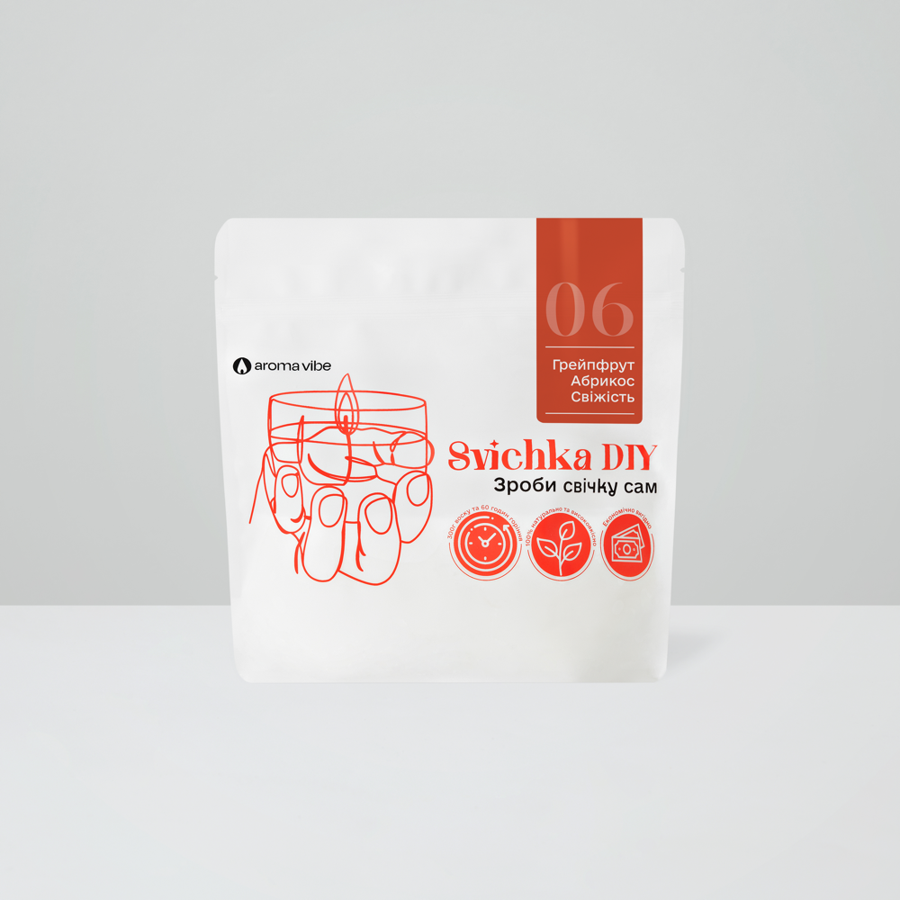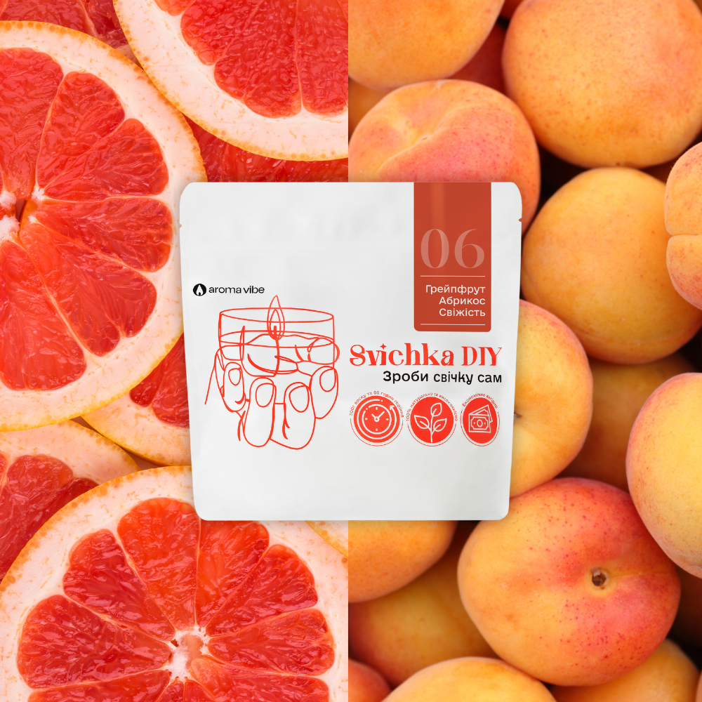 Create Your Own Scented Candle: DIY Candle Kit with Natural Soy Wax, Grapefruit, Apricot & Freshness Citrus aroma with notes of grapefruit and ripe apricot. DIY candle making kit. Natural soy wax candles. Grapefruit scented candle. Apricot candle. Fresh scented candle. Handmade candles kit Family: tree Notes: ripe figs, patchouli flowers, nutmeg Sweetness: ★★☆ Astringency: ★★☆ Freshness: ★★☆ Composition of the set 300 grams (10.5 ounces) of natural soy wax Cotton wick Centering rod Naturally DIY candle kit 300 grams (10.5 ounces) of natural, ecological soy-based wax with safe aromas and essential oils. Without parabens, paraffin and phthalates. A true perfume Perfumed aroma filling made in France. Smells like the best candle you could find anywhere. No apples and strawberries from China. Ecologically 100% recyclable packaging. The candle does not leave behind anything that can harm nature. Use and safety techniques Burning time is approximately 60 hours Cut the wick to a length of 0.5 cm (0,19 inch) before each smoking Never leave a lit candle unattended Avoid drafts and contact of the candle with flammable materials Keep away from small children and pets The recommended burning time is not less than 1 hour and not more than 4 hours in a row Soy wax We use exactly 100% soy wax. This wax is clean and safe for your health. It also provides the best aroma output and long-lasting burning. High-quality aroma oils The candles you make will not differ in aroma from the highest quality candles on the market. In addition, aroma oils are certified and do not contain parabens, phthalates and other harmful chemicals. Made in Ukraine Each set is made by hand in Kyiv with pride and care. Create comfort with your own hands You will be amazed by the quality of the candles that you will get, because we have developed a very high-quality mixture of soy wax and natural aroma oil on a par with premium candles of the highest quality. DIY Candle is a candle refill . Inside the package, you'll find everything you need to create a candle: pre-scented soy wax , a wick, and a stick to center the wick in your future candle. To make your own candle, you only need our kit, a container, a microwave or a pot of water, and 5 minutes Make candles as easy as one, two, three... Heat the bag in the microwave for 2.5 minutes. Pour the melted wax into your favorite container. Let the wax harden, trim the wick, and enjoy the fresh scent. How to choose a capacity: They fit Glazed ceramics Strong glass Soldered metal cans Enamel products Non-flammable glasses Do not fit Porous ceramics. For example, terracotta Wood, coconut shells, plastic All flammable materials Can't hold water Dimensions DIY candle kit We recommend using containers no larger than 10 cm (5.39 inches) in diameter, because this is how the wick is calculated. The set includes a 12 cm (6.47 inch) long wick, so the capacity should not be higher than 11.5 cm (6.20 inch) Frequently asked questions (FAQ) DIY candle kit Where can I find a wick and a wick holder? Everything in the package! Yes, everything goes together and in order to make a candle you don't need anything except the DIY Candle package How should I choose a glass? It must be a leak-proof glass with a diameter of up to (10 cm 5.39 inch). Can I make a candle without a microwave? Yes, you can put the DIY Candle package in a pot of water. The package should stand upright over medium heat until the wax in it is completely melted. It takes different time from 8 to 15 minutes depending on your stove and pot. How many candles can be made from one set? Contains 300 grams (10.5 ounces) of wax. This is definitely enough for almost any candle you can find at home. But there is only 1 wick in the set, so if you have wax left after you make a candle, you can order more wicks and make more!