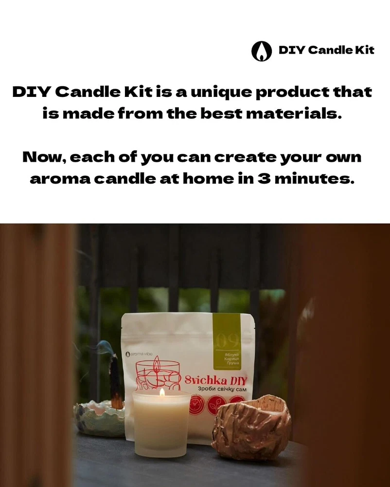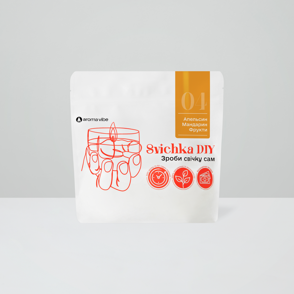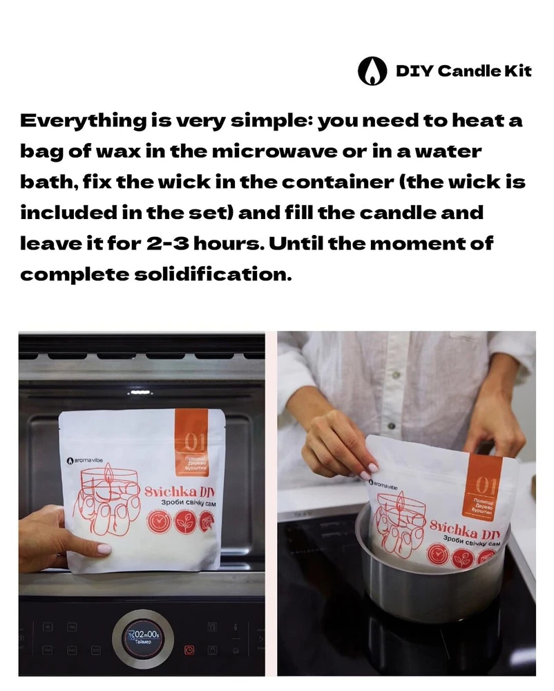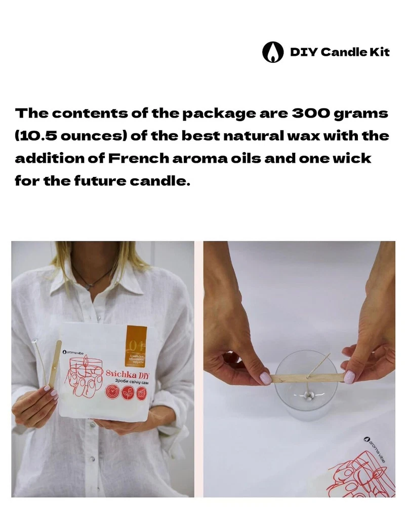 Create Your Own Scented Candle: DIY Candle Kit with Natural Soy Wax, Flowers, Orange, Tangerine & Fruit This fragrance creates a real celebration of freshness in any place. It can be winter outside the window, and in the center - the summer coolness of the shade of a citrus garden filled with ripe fruits. Bright orange peel gives its juices to the air under the gentle sunlight. Orange scented candle. Tangerine candle. Fruit scented candle Space: home, office, clothing or jewelry store, grocery store, clinic Atmosphere: focus, concentration, cleanliness, health Aroma card Family: Citrus Notes: tangerine, orange peel, summer fruits Sweetness: ★☆☆ Tolerance: ★☆☆ Freshness: ★★★ Composition of the set 300 grams (10.5 ounces) of natural soy wax Cotton wick Centering rod Naturally DIY candle kit 300 grams (10.5 ounces) of natural, ecological soy-based wax with safe aromas and essential oils. Without parabens, paraffin and phthalates. A true perfume Perfumed aroma filling made in France. Smells like the best candle you could find anywhere. No apples and strawberries from China. Ecologically 100% recyclable packaging. The candle does not leave behind anything that can harm nature. Use and safety techniques Burning time is approximately 60 hours Cut the wick to a length of 0.5 cm (0,19 inch) before each smoking Never leave a lit candle unattended Avoid drafts and contact of the candle with flammable materials Keep away from small children and pets The recommended burning time is not less than 1 hour and not more than 4 hours in a row Soy wax We use exactly 100% soy wax. This wax is clean and safe for your health. It also provides the best aroma output and long-lasting burning. High-quality aroma oils The candles you make will not differ in aroma from the highest quality candles on the market. In addition, aroma oils are certified and do not contain parabens, phthalates and other harmful chemicals. Made in Ukraine Each set is made by hand in Kyiv with pride and care. Create comfort with your own hands You will be amazed by the quality of the candles that you will get, because we have developed a very high-quality mixture of soy wax and natural aroma oil on a par with premium candles of the highest quality. DIY Candle is a candle refill . Inside the package, you'll find everything you need to create a candle: pre-scented soy wax , a wick, and a stick to center the wick in your future candle. To make your own candle, you only need our kit, a container, a microwave or a pot of water, and 5 minutes Make candles as easy as one, two, three... Heat the bag in the microwave for 2.5 minutes. Pour the melted wax into your favorite container. Let the wax harden, trim the wick, and enjoy the fresh scent. How to choose a capacity: They fit Glazed ceramics Strong glass Soldered metal cans Enamel products Non-flammable glasses Do not fit Porous ceramics. For example, terracotta Wood, coconut shells, plastic All flammable materials Can't hold water Dimensions DIY candle kit We recommend using containers no larger than 10 cm (5.39 inches) in diameter, because this is how the wick is calculated. The set includes a 12 cm (6.47 inch) long wick, so the capacity should not be higher than 11.5 cm (6.20 inch) Frequently asked questions (FAQ) DIY candle kit Where can I find a wick and a wick holder? Everything in the package! Yes, everything goes together and in order to make a candle you don't need anything except the DIY Candle package How should I choose a glass? It must be a leak-proof glass with a diameter of up to (10 cm 5.39 inch). Can I make a candle without a microwave? Yes, you can put the DIY Candle package in a pot of water. The package should stand upright over medium heat until the wax in it is completely melted. It takes different time from 8 to 15 minutes depending on your stove and pot. How many candles can be made from one set? Contains 300 grams (10.5 ounces) of wax. This is definitely enough for almost any candle you can find at home. But there is only 1 wick in the set, so if you have wax left after you make a candle, you can order more wicks and make more!