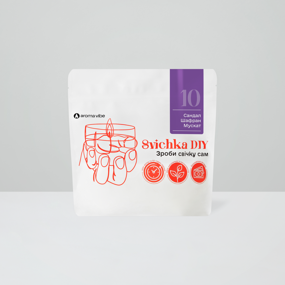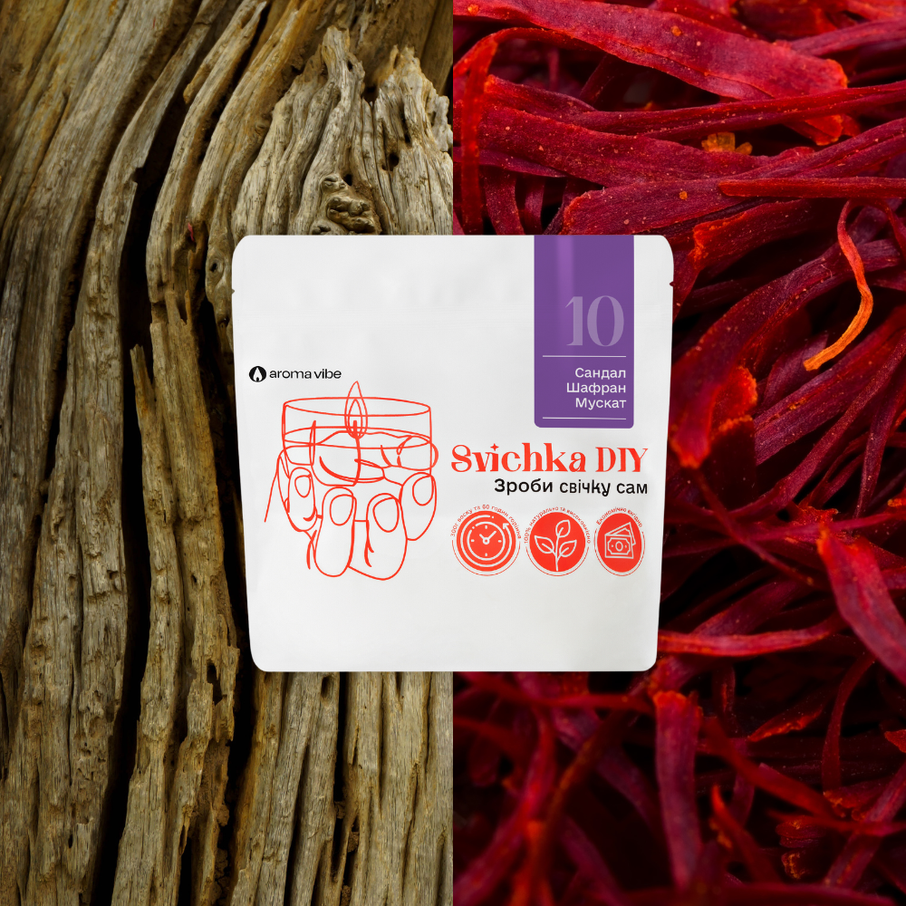 Create Your Own Scented Candle: DIY Candle Kit with Natural Soy Sandalwood, Saffron & Nutmeg A fresh cut of sandalwood is covered with tears of golden resin, which completely saturates the air with sweet nutmeg aromas with light, direct notes of crocus flowers. Successful color solutions: white, beige, black Space: living room, office, lobby, car interior Atmosphere: coziness, hygge, family evenings, late autumn or winter outside the window Aroma card DIY Candle Making Kit Family: tree Notes: sandalwood, saffron, nutmeg Sweetness: ★☆☆ Astringency: ★★☆ Freshness: ★☆☆ Composition of the set 300 grams (10.5 ounces) of natural soy wax Cotton wick Centering rod Naturally DIY candle kit 300 grams (10.5 ounces) of natural, ecological soy-based wax with safe aromas and essential oils. Without parabens, paraffin and phthalates. A true perfume Perfumed aroma filling made in France. Smells like the best candle you could find anywhere. No apples and strawberries from China. Ecologically 100% recyclable packaging. The candle does not leave behind anything that can harm nature. Use and safety techniques Burning time is approximately 60 hours Cut the wick to a length of 0.5 cm (0,19 inch) before each smoking Never leave a lit candle unattended Avoid drafts and contact of the candle with flammable materials Keep away from small children and pets The recommended burning time is not less than 1 hour and not more than 4 hours in a row Soy wax We use exactly 100% soy wax. This wax is clean and safe for your health. It also provides the best aroma output and long-lasting burning. High-quality aroma oils The candles you make will not differ in aroma from the highest quality candles on the market. In addition, aroma oils are certified and do not contain parabens, phthalates and other harmful chemicals. Made in Ukraine Each set is made by hand in Kyiv with pride and care. Create comfort with your own hands You will be amazed by the quality of the candles that you will get, because we have developed a very high-quality mixture of soy wax and natural aroma oil on a par with premium candles of the highest quality. DIY Candle is a candle refill . Inside the package, you'll find everything you need to create a candle: pre-scented soy wax , a wick, and a stick to center the wick in your future candle. To make your own candle, you only need our kit, a container, a microwave or a pot of water, and 5 minutes Make candles as easy as one, two, three... Heat the bag in the microwave for 2.5 minutes. Pour the melted wax into your favorite container. Let the wax harden, trim the wick, and enjoy the fresh scent. How to choose a capacity: They fit Glazed ceramics Strong glass Soldered metal cans Enamel products Non-flammable glasses Do not fit Porous ceramics. For example, terracotta Wood, coconut shells, plastic All flammable materials Can't hold water Dimensions DIY candle kit We recommend using containers no larger than 10 cm (5.39 inches) in diameter, because this is how the wick is calculated. The set includes a 12 cm (6.47 inch) long wick, so the capacity should not be higher than 11.5 cm (6.20 inch) Frequently asked questions (FAQ) DIY candle kit Where can I find a wick and a wick holder? Everything in the package! Yes, everything goes together and in order to make a candle you don't need anything except the DIY Candle package How should I choose a glass? It must be a leak-proof glass with a diameter of up to (10 cm 5.39 inch). Can I make a candle without a microwave? Yes, you can put the DIY Candle package in a pot of water. The package should stand upright over medium heat until the wax in it is completely melted. It takes different time from 8 to 15 minutes depending on your stove and pot. How many candles can be made from one set? Contains 300 grams (10.5 ounces) of wax. This is definitely enough for almost any candle you can find at home. But there is only 1 wick in the set, so if you have wax left after you make a candle, you can order more wicks and make more!