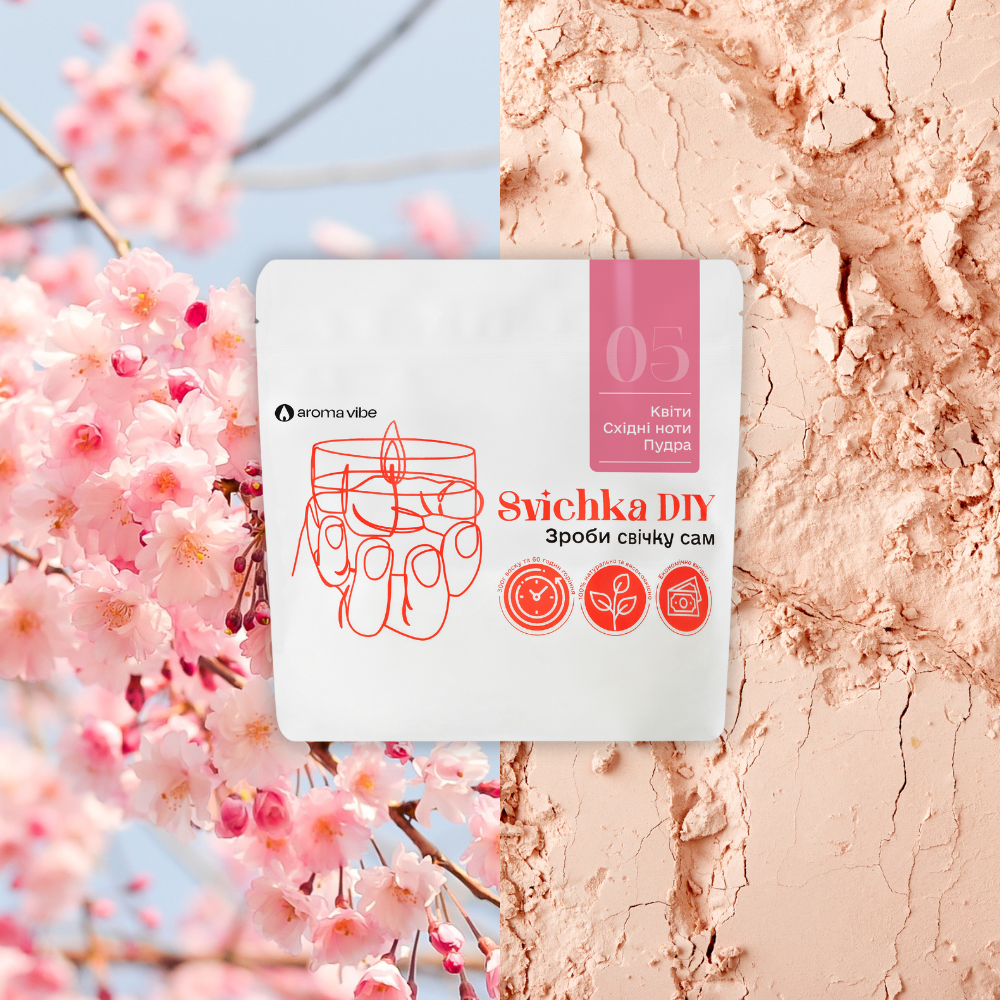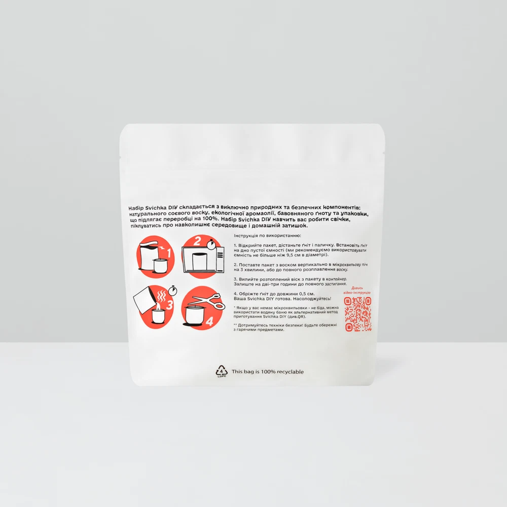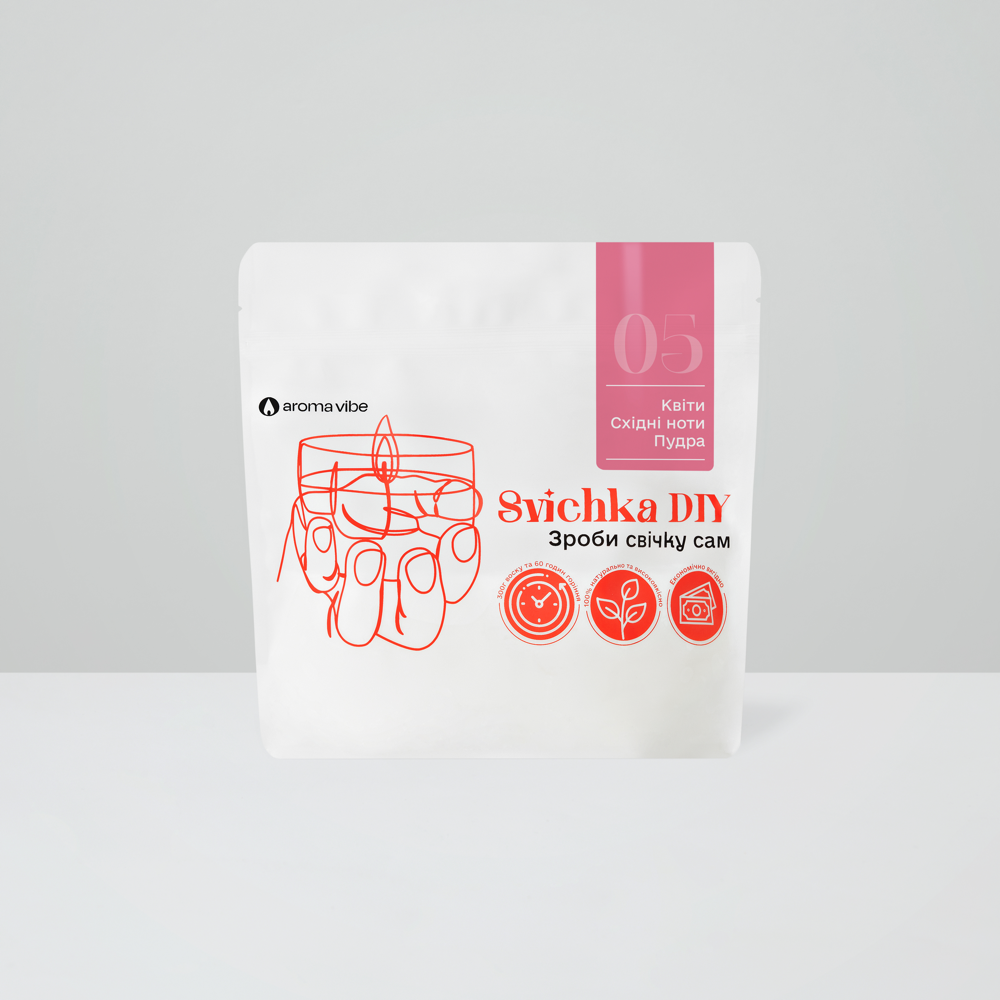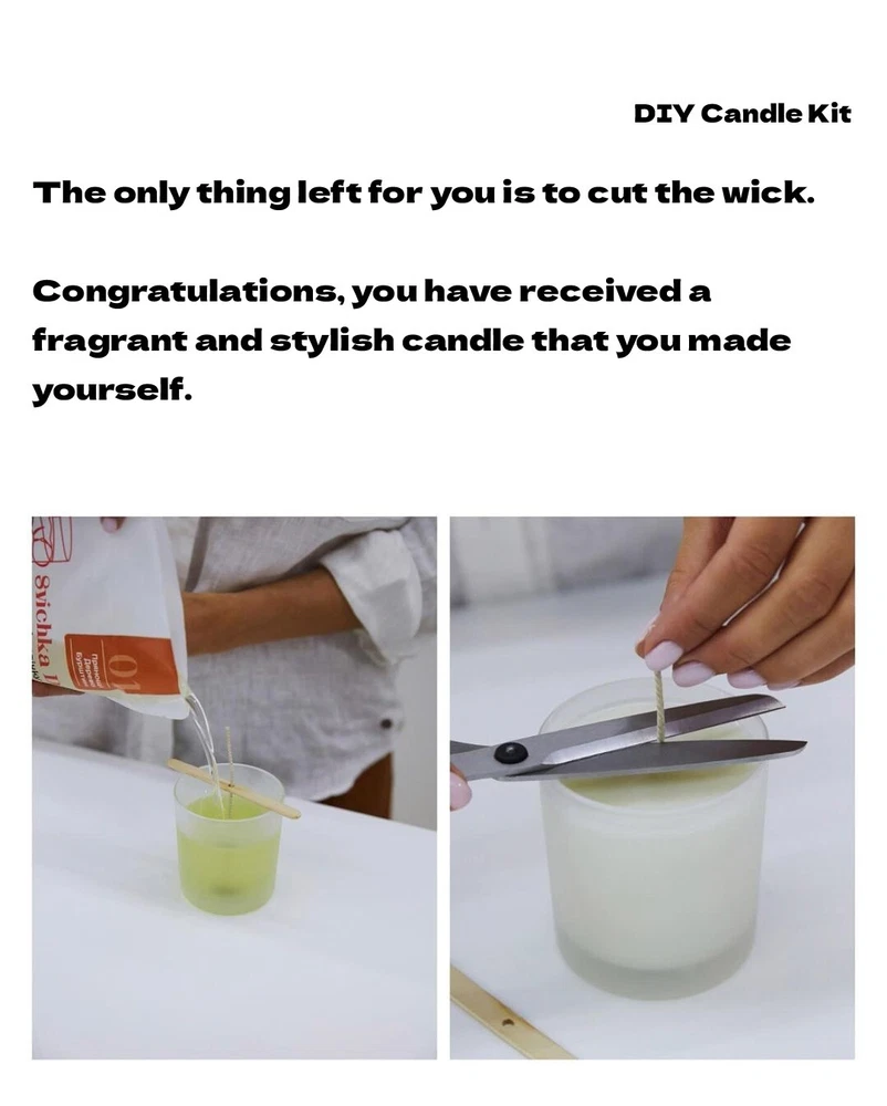 Create Your Own Scented Candle: DIY Candle Kit with Natural Soy Wax, Flowers, Eastern Notes & Powder The mystery and luxury of the spacious halls of the Taj Mahal, decorated with precious stones and precious metals. The floor is filled with petals of exotic flowers, and the warm wind brings the sharpness of oriental spices from the yard. DIY candle making kit. Natural soy wax candles. Flower scented candle. Eastern notes candle. Powder scented candle. Handmade candles kit. In color solutions: pink, purple, orange, golden Space: bedroom, living room, bathroom, clothing, fabric or jewelry store, beauty salon Atmosphere: luxury, sophistication, tenderness, eroticism Family: spices Notes: white pepper, turmeric, flowers Sweetness: ★★☆ Astringency: ★★☆ Freshness: ★★☆ Composition of the set 300 grams (10.5 ounces) of natural soy wax Cotton wick Centering rod Naturally DIY candle kit 300 grams (10.5 ounces) of natural, ecological soy-based wax with safe aromas and essential oils. Without parabens, paraffin and phthalates. A true perfume Perfumed aroma filling made in France. Smells like the best candle you could find anywhere. No apples and strawberries from China. Ecologically 100% recyclable packaging. The candle does not leave behind anything that can harm nature. Use and safety techniques Burning time is approximately 60 hours Cut the wick to a length of 0.5 cm (0,19 inch) before each smoking Never leave a lit candle unattended Avoid drafts and contact of the candle with flammable materials Keep away from small children and pets The recommended burning time is not less than 1 hour and not more than 4 hours in a row Soy wax We use exactly 100% soy wax. This wax is clean and safe for your health. It also provides the best aroma output and long-lasting burning. High-quality aroma oils The candles you make will not differ in aroma from the highest quality candles on the market. In addition, aroma oils are certified and do not contain parabens, phthalates and other harmful chemicals. Made in Ukraine Each set is made by hand in Kyiv with pride and care. Create comfort with your own hands You will be amazed by the quality of the candles that you will get, because we have developed a very high-quality mixture of soy wax and natural aroma oil on a par with premium candles of the highest quality. DIY Candle is a candle refill . Inside the package, you'll find everything you need to create a candle: pre-scented soy wax , a wick, and a stick to center the wick in your future candle. To make your own candle, you only need our kit, a container, a microwave or a pot of water, and 5 minutes Make candles as easy as one, two, three... Heat the bag in the microwave for 2.5 minutes. Pour the melted wax into your favorite container. Let the wax harden, trim the wick, and enjoy the fresh scent. How to choose a capacity: They fit Glazed ceramics Strong glass Soldered metal cans Enamel products Non-flammable glasses Do not fit Porous ceramics. For example, terracotta Wood, coconut shells, plastic All flammable materials Can't hold water Dimensions DIY candle kit We recommend using containers no larger than 10 cm (5.39 inches) in diameter, because this is how the wick is calculated. The set includes a 12 cm (6.47 inch) long wick, so the capacity should not be higher than 11.5 cm (6.20 inch) Frequently asked questions (FAQ) DIY candle kit Where can I find a wick and a wick holder? Everything in the package! Yes, everything goes together and in order to make a candle you don't need anything except the DIY Candle package How should I choose a glass? It must be a leak-proof glass with a diameter of up to (10 cm 5.39 inch). Can I make a candle without a microwave? Yes, you can put the DIY Candle package in a pot of water. The package should stand upright over medium heat until the wax in it is completely melted. It takes different time from 8 to 15 minutes depending on your stove and pot. How many candles can be made from one set? Contains 300 grams (10.5 ounces) of wax. This is definitely enough for almost any candle you can find at home. But there is only 1 wick in the set, so if you have wax left after you make a candle, you can order more wicks and make more!