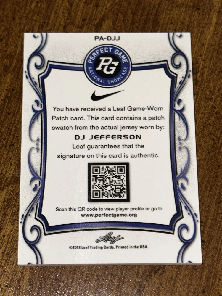 DJ JEFFERSON 2018 LEAF PERFECT GAME NATIONAL SHOWCASE GAME WORN JERSEY PATCH AUTOGRAPH. Serial-Numbered #4/25 YES, Great AUTOGRAPH!! Shipping is $5.50 with INSURED tracking. International Shipping via GLOBAL SHIPPING PROGRAM at this time. CHECK OUT THE OTHER ITEMS AVAILABLE!