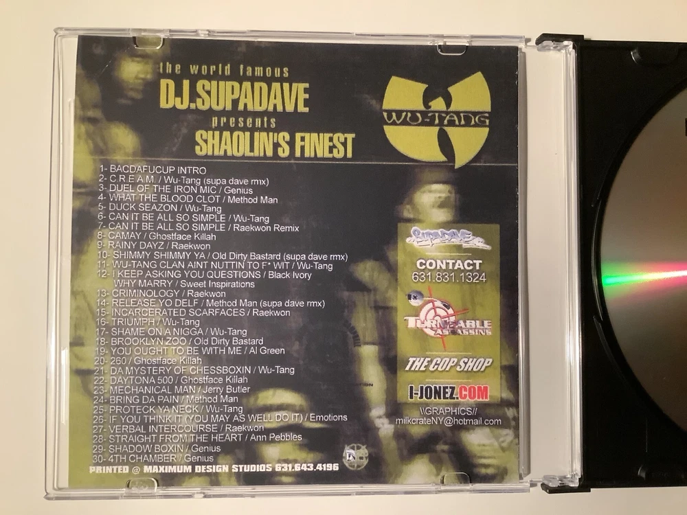 Rare DJ Supa Dave Best Of Wu Tang Clan Shaolin's Finest mixtape featuring exclusive remixes, this is one of the finest Wu Tang mixtapes ever produced, original blends and remixes executed perfectly by a real hip hop dj not a computer playlist . CDr, insert and slimcase are like new, disc has been tested all the way through and plays perfectly. N o extra shipping charge for additional purchases.