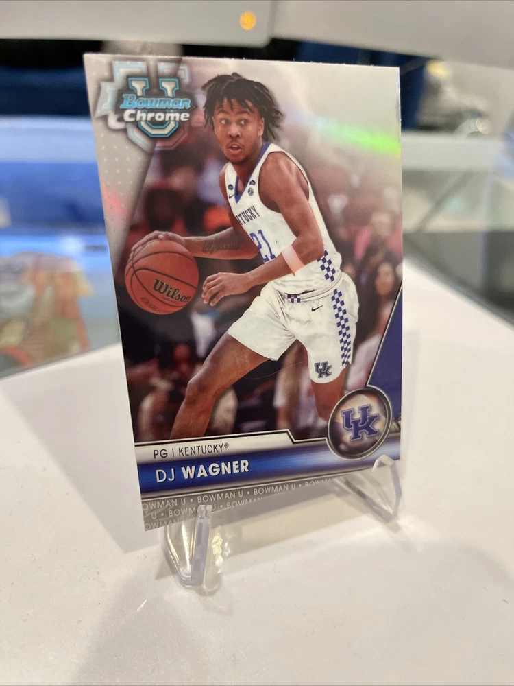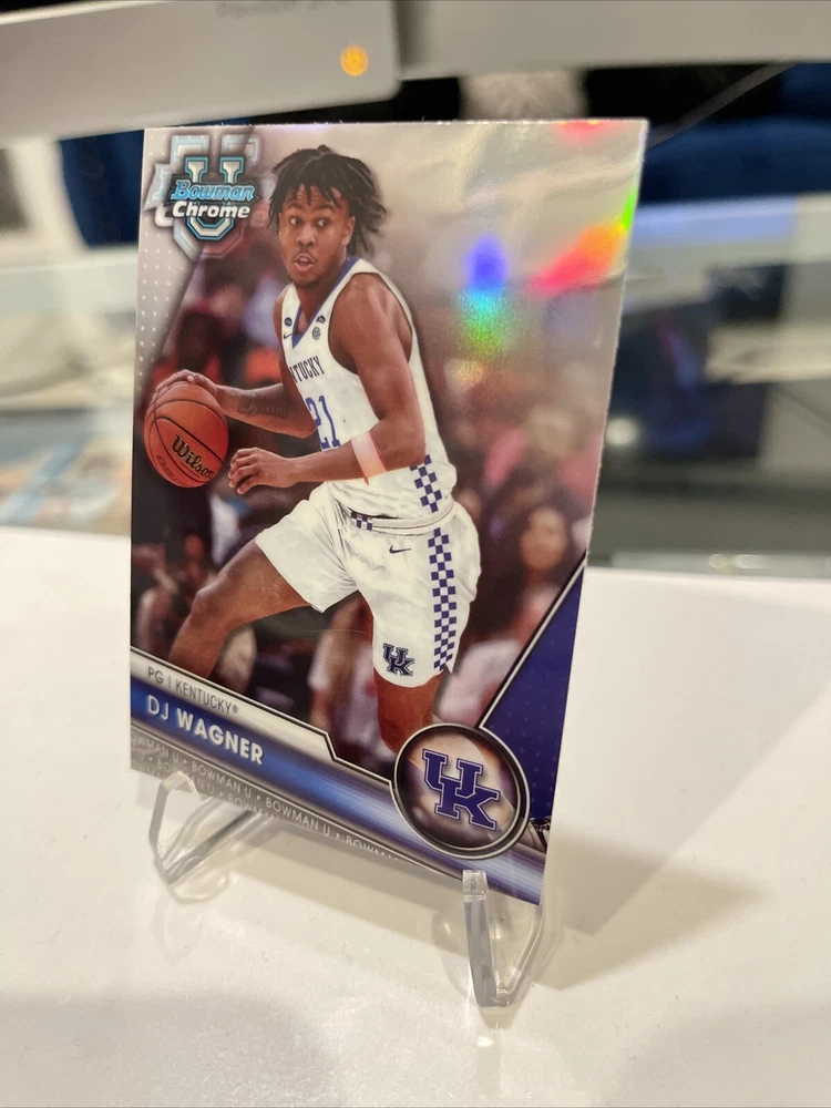This rare DJ Wagner 2023 Bowman Chrome trading card features a stunning image variation SSP case hit, making it a must-have for any serious collector. With its Chrome Refractor parallel/variety and unique features, this card is sure to be a standout addition to your collection. The card showcases DJ Wagner, a former player for the Arkansas Razorbacks and Kentucky Wildcats, and is part of the National Collegiate Athletic Association (NCAA) league. The card number is 43 and it is from the 2023 season. Don't miss out on the opportunity to own this highly sought-after sports trading card.