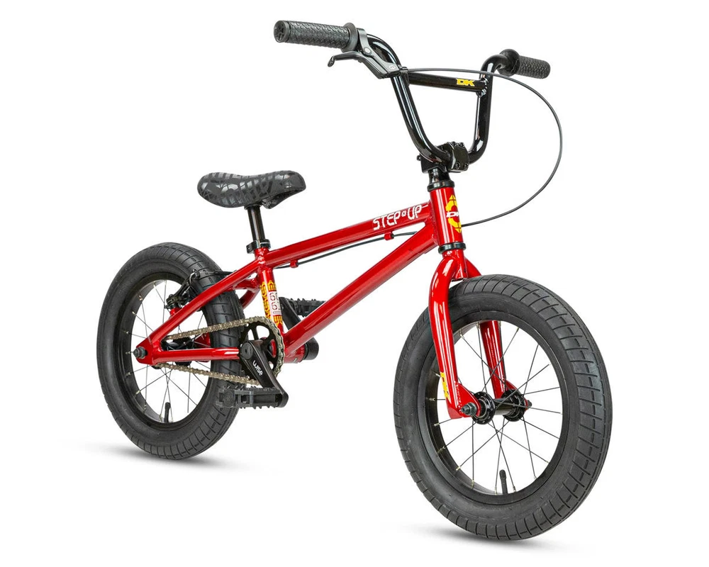 DK Step Up 14" BMX Bike Description: The DK Step Up 14" BMX bike is perfect for young riders wanting to improve their skills. It has a lightweight 6061 aluminum frame and a 15.5” top tube for easy handling. Key features include 14-inch wheels with street tires, a safe linear V-brake, and 102mm Wise alloy cranks. The front load stem has a 30mm reach, and the 6" rise handlebars offer a comfy grip. Weighing just 15lbs 8oz, this bike is ideal for little BMX fans ready for new adventures! Specifications: Frame: 6061 Aluminum Fork: 4130 Chromoly Steerer w/ Tapered Legs and Integrated Crown Race Headset: Standard Threadless (1") Stem: Alloy Front Load (30mm Reach) Bars: Alloy (6" Rise) Grips: DUO Mini Grips Cranks: Wise Alloy 3-Piece (102mm Length) Bottom Bracket: Euro w/ 4130 Chromoly Spindle Pedals: PC Mini Platform Sprocket: DK (25 Tooth) Chain: KMC Z-510 Front Hub: Alloy Sealed (3/8" Axle) Rear Hub: Alloy Sealed (3/8" Axle) Driver: 9 Tooth Front Rim: Alloy (Single Wall) (20 Hole) Rear Rim: Alloy (Single Wall) (20 Hole) Front Tire: Street (14" x 2.25") Rear Tire: Street (14" x 2.25") Seat: DK Padded (Combo) Seat Post: Combo (22.2mm) Seat Clamp: Alloy Brake Lever: Wise Short Reach Brakes: Linear V-brake Alloy Gyro: - Gyro Tabs: None Brake Mounts: Welded Extras: - Color: Red Weight: 15.5 lbs Geometry: Toptube Length: 15.5” Chainstay Length: 11.75” Headtube Angle: 74° Seattube Angle: 71° Bottom Bracket Height: - Standover: - Recommended Sizing Guide: 2'8" to 3'6" Note: To ensure that every component on your bicycle is working properly, we recommend that all bikes be assembled by a qualified mechanic. Improper assembly of your bicycle may lead to premature wear or failure of individual components such as headsets, crank assembly and wheels. Failure to do so may void the manufacturer warranty. About Us | View Store