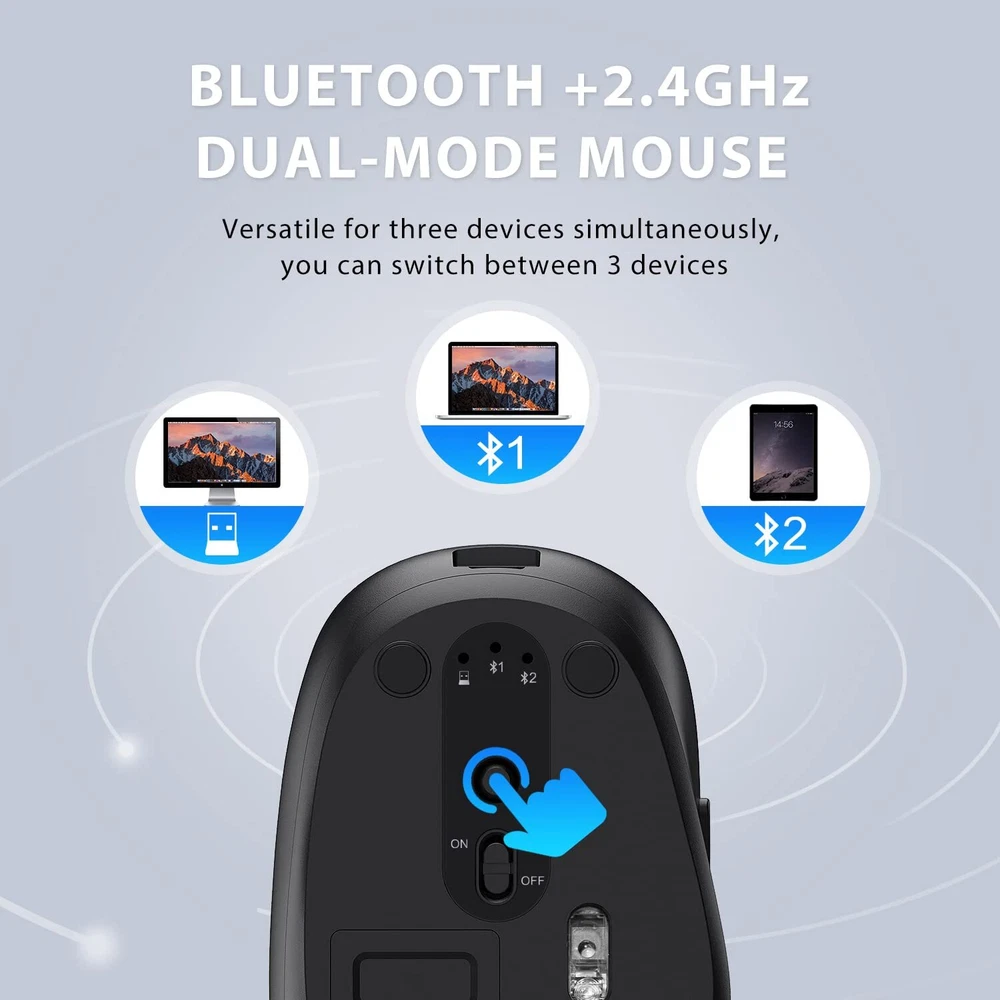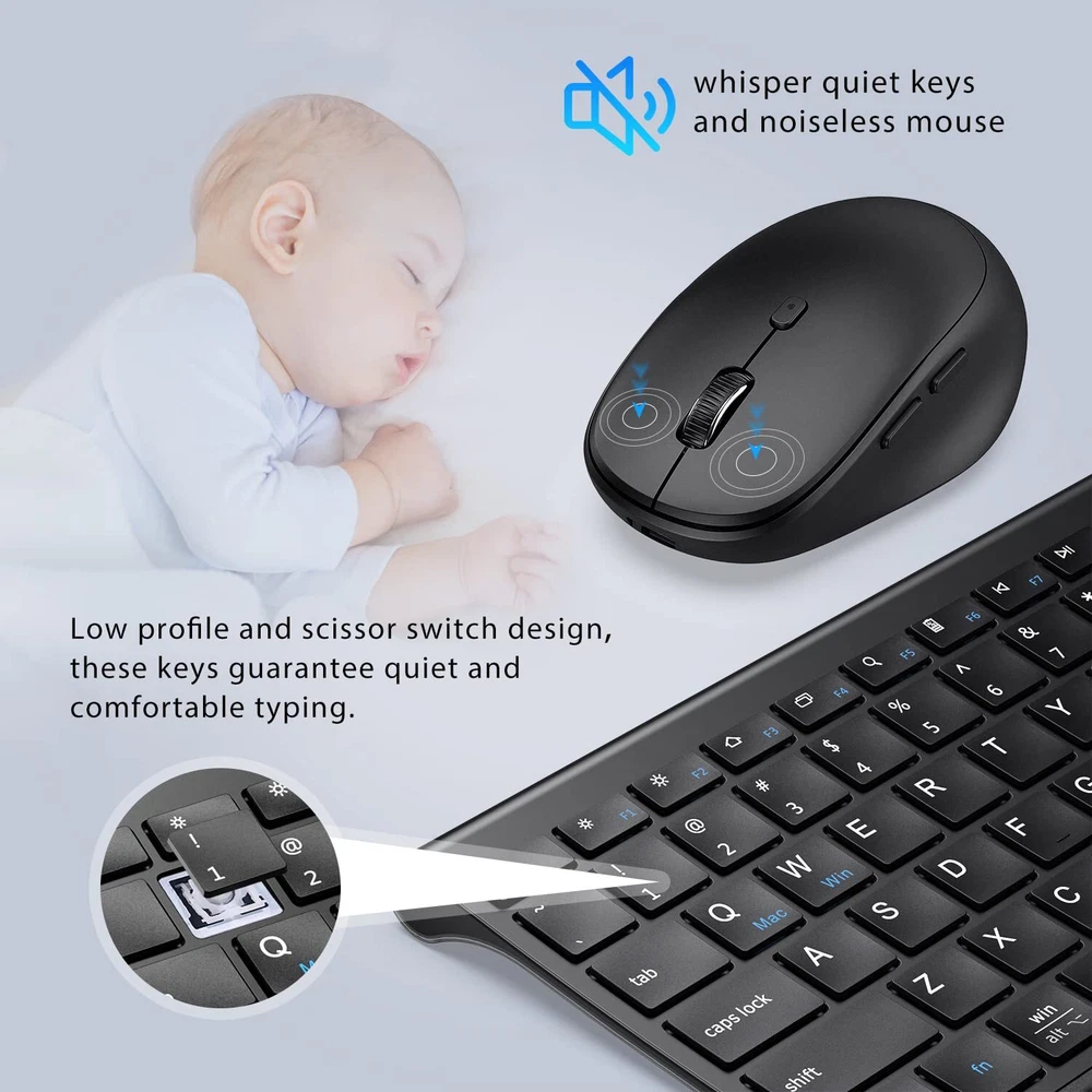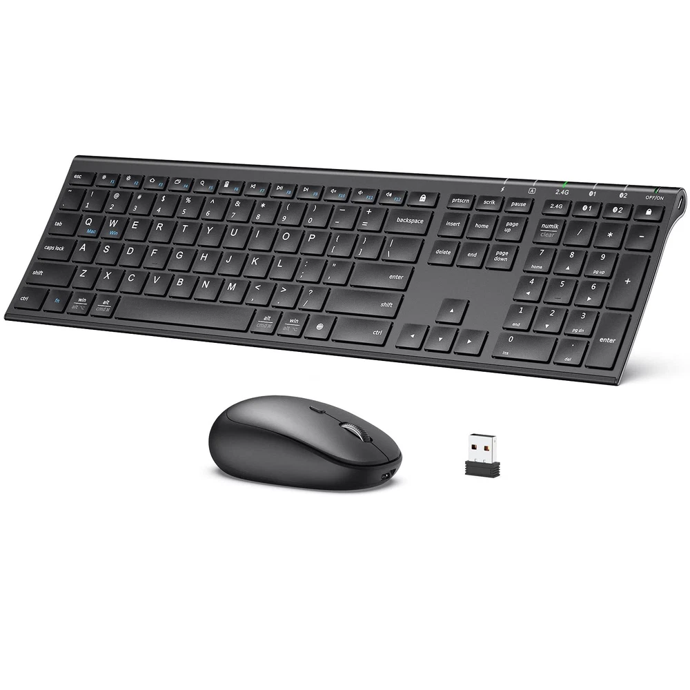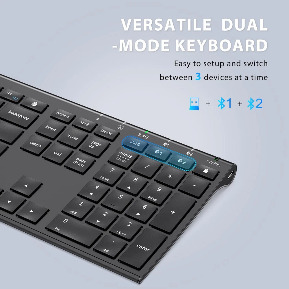 MULTI-DEVICE CONNECTIONS: Both keyboard and are dual-mode designed and three channels enabled(Bluetooth channel *2 + 2.4GHz USB channel *1). Effortlessly realize quick and smooth switch between 3 devices by pressing a single button. UNIVERSAL COMPATIBILITY: Fully with Mac, iOS, Android, Windows 7/8/10. Customers can select the corresponding system through the keyboard fn+Q/W. RECHARGEABLE BATTERY SAVES ENERGY: Forget the annoyance of having to change batteries with this bluetooth keyboard and , which use lithium-ion battery to give you up to 90 hours of continuous use on a single charge. When you're not using them, both the keyboard and will go on standby to save energy. Just click the or hit any key of the wireless keyboard to wake them up. ULTRA-THIN FULL-SIZE KEYBOARD: The ultra-thin full-size keyboard has an independent number zone and multimedia functions. It is the most suitable keyboard for office work. The X-structure design of the keys is labor-saving, light-sounding, stable, and can accurately every stroke. The bottom of the keyboard is designed with aluminum alloy, and at the same time, it adopts a special process to make the appearance thinner and more beautiful. PACKAGE CONTENTS: 1xDual Mode Keyboard, 1x Dual Mode ,1xUSB Receiver,1xKeyboard Cover,1xCharging Cable, 1xUser Manual, 24 Hours . 1 year limited hardware