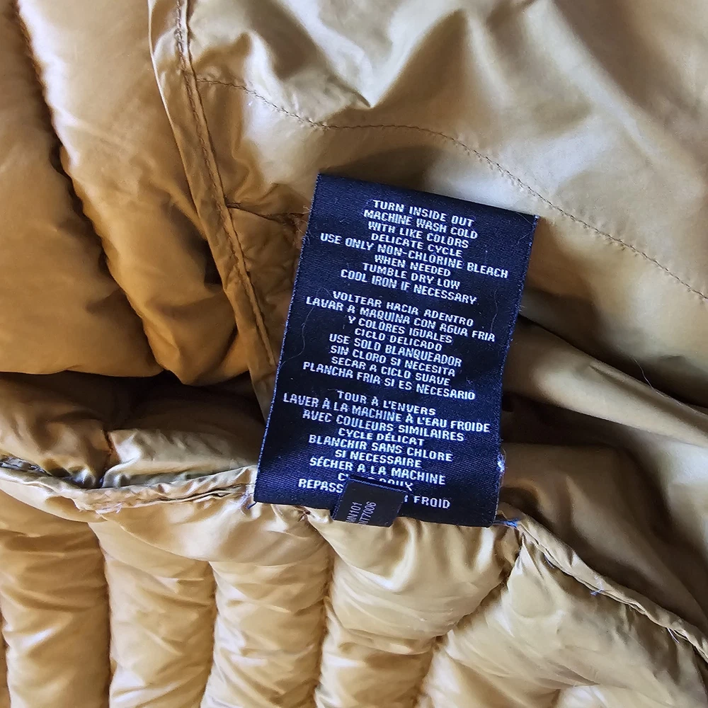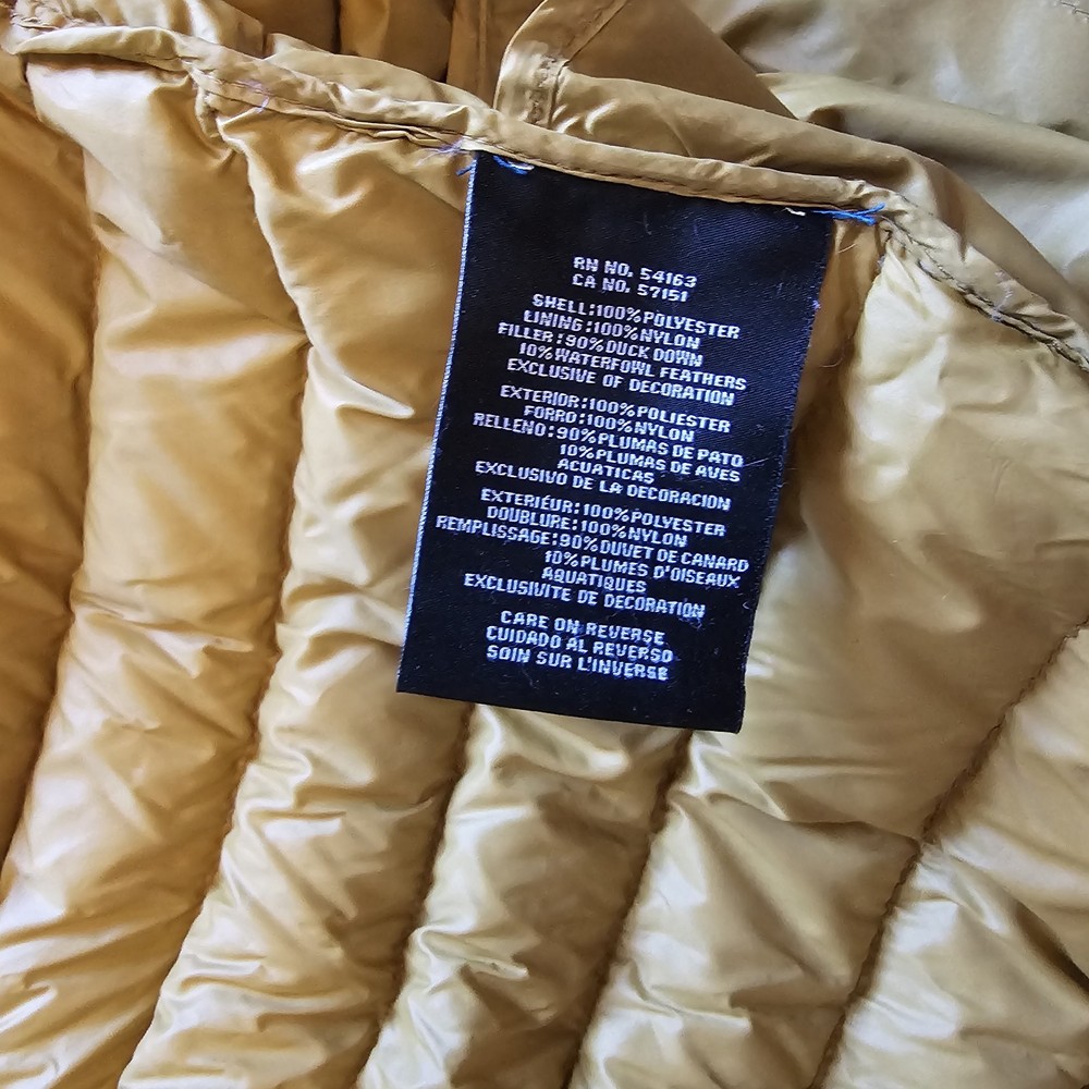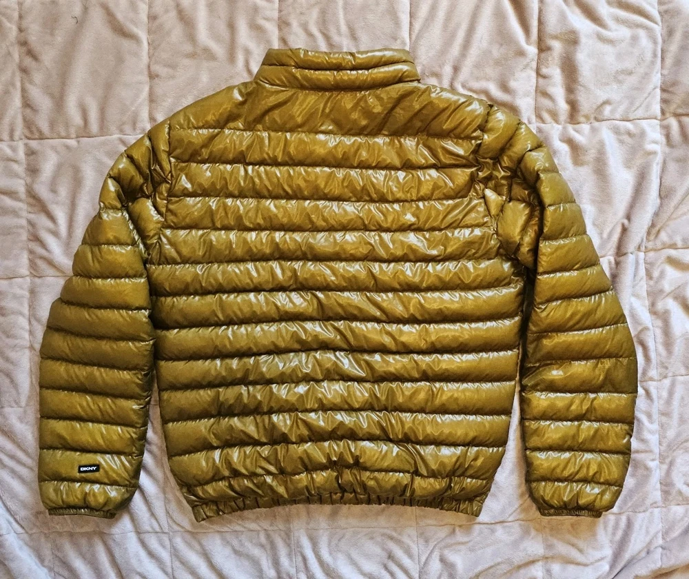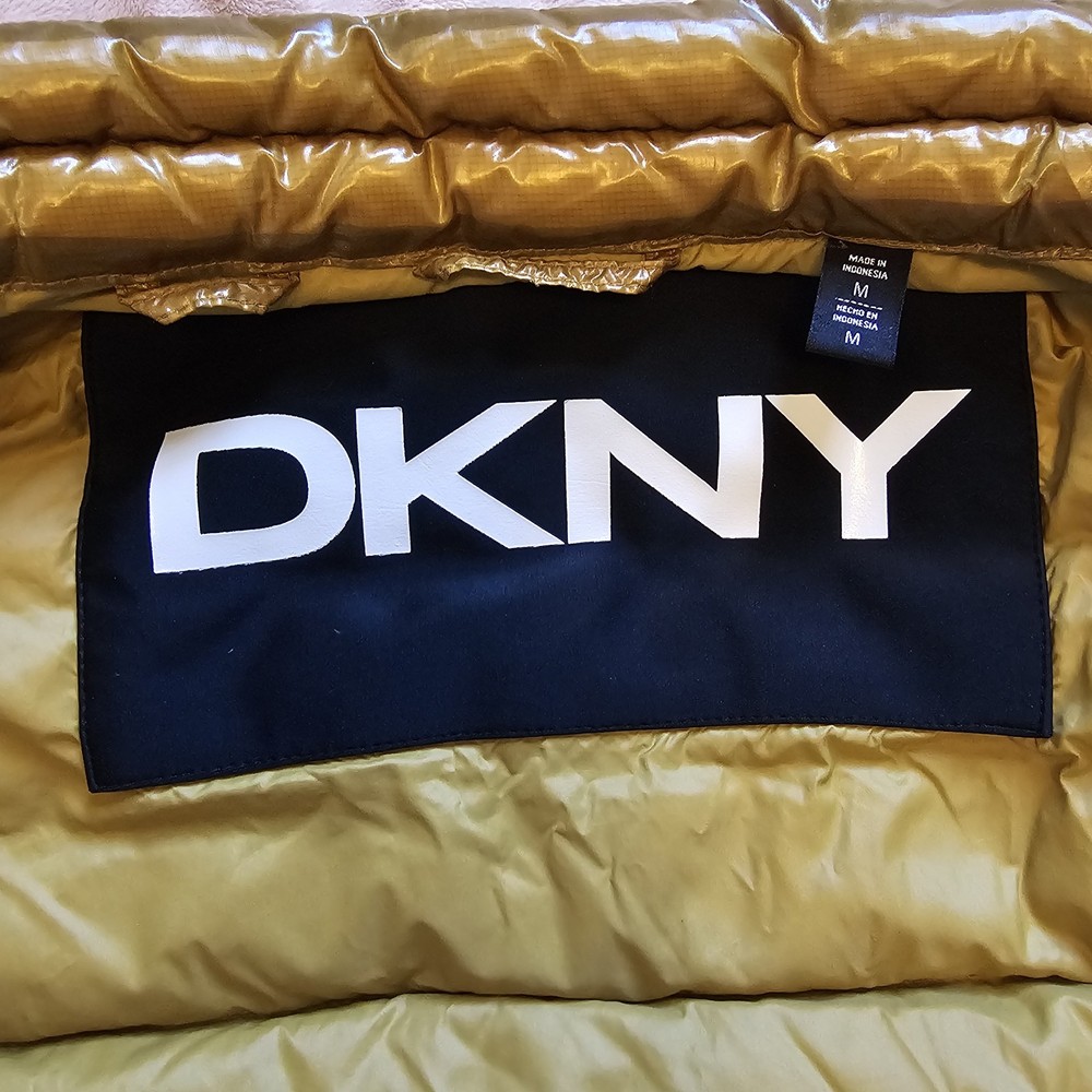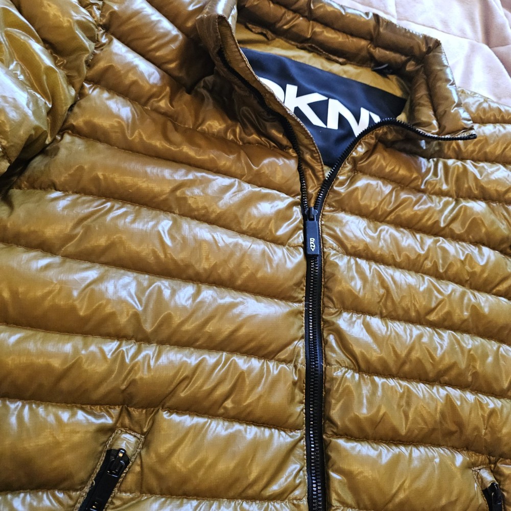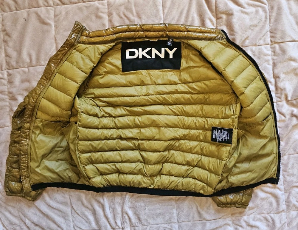 DKNY men’s lightweight down puffer jacket in metallic gold. Full zip front with stand collar and zip hand pockets. Large interior pockets. Quilted, packable design with a glossy metallic finish that stands out while still being easy to wear. Shell is 100% polyester with nylon lining. Filled with 90% duck down and 10% waterfowl feathers. Lightweight but warm, compressible, and ideal for travel or layering. Size Medium (tagged). Measures 25 inches down back, 22 pit to pit. Please refer to measurements for best fit. Has small repair spot on sleeve end, check pics for details.