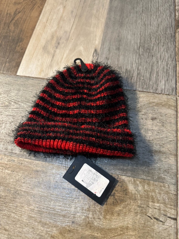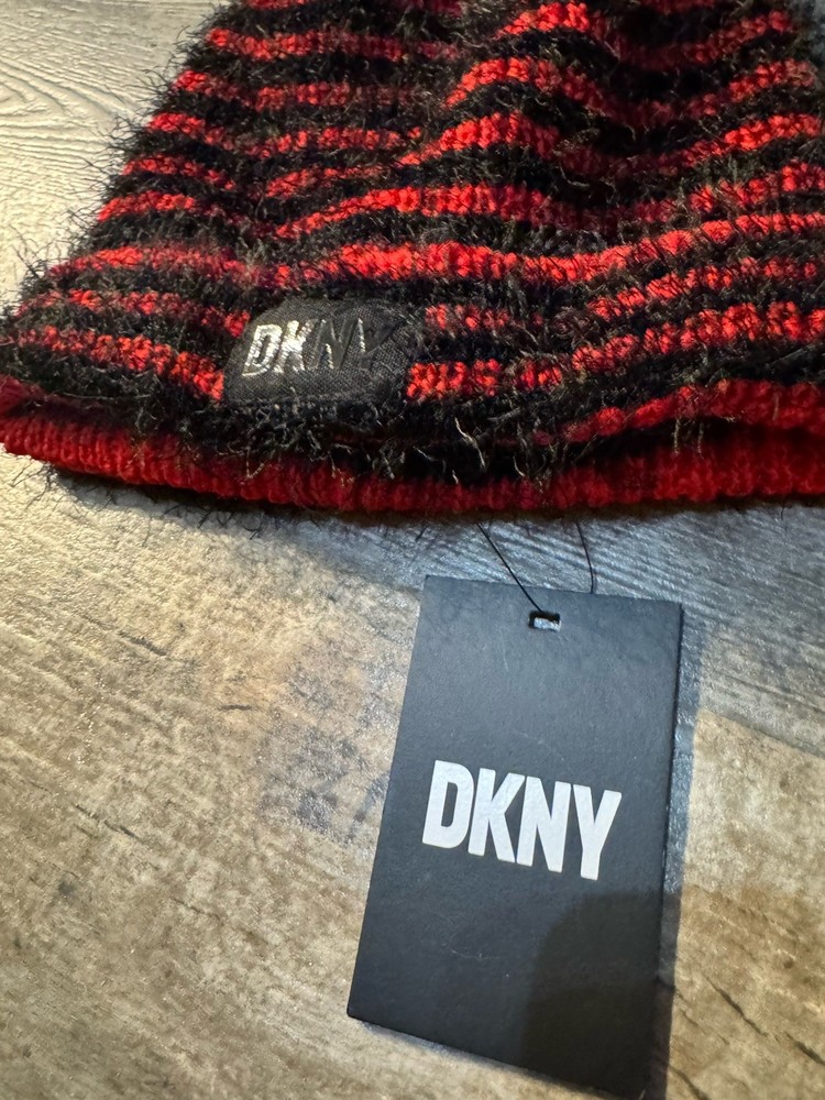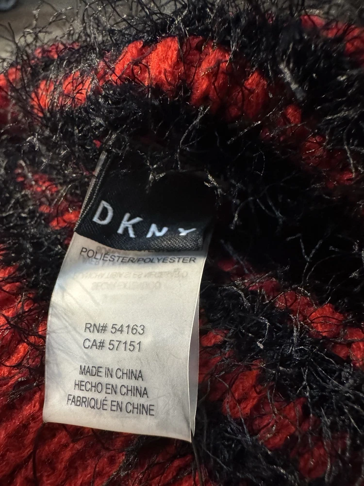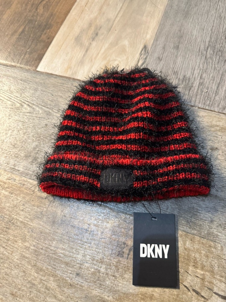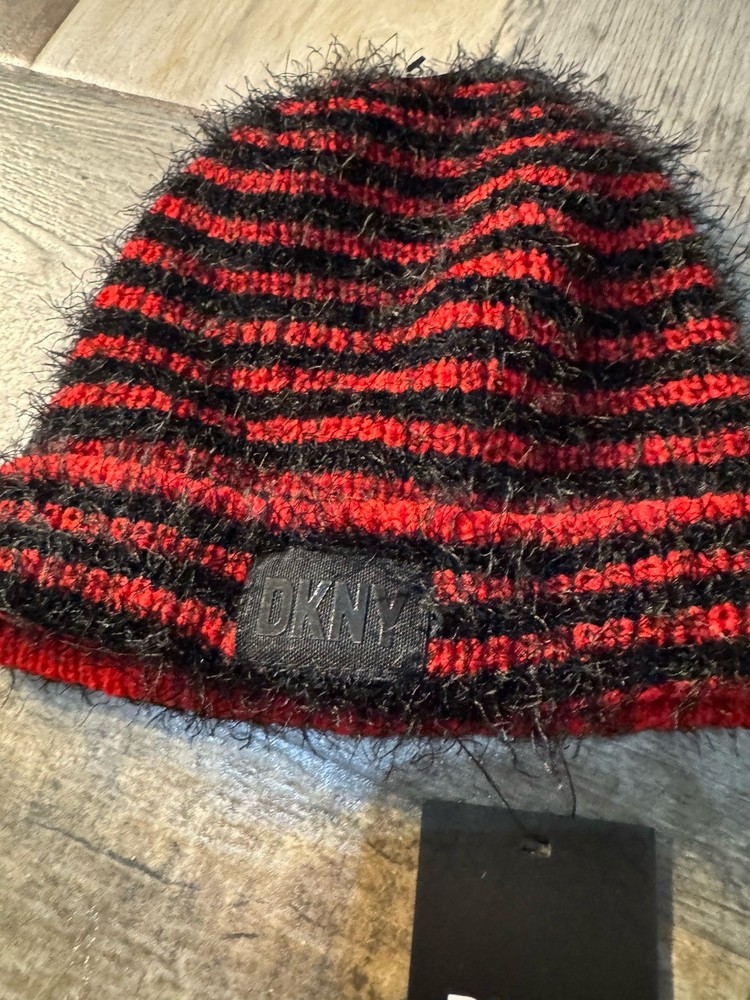 Stay stylish and cozy during the colder seasons with this DKNY Red Black Lined Fleece Striped Knit Beanie. Made from 100% acrylic and 100% polyester, this beanie features a solid pattern with a bold red color and black stripes. The logo accents add a touch of designer flair, making it perfect for casual occasions in winter or fall. With its one-size fit and lined fleece fabric, this beanie is a must-have accessory for any fashion-forward woman.