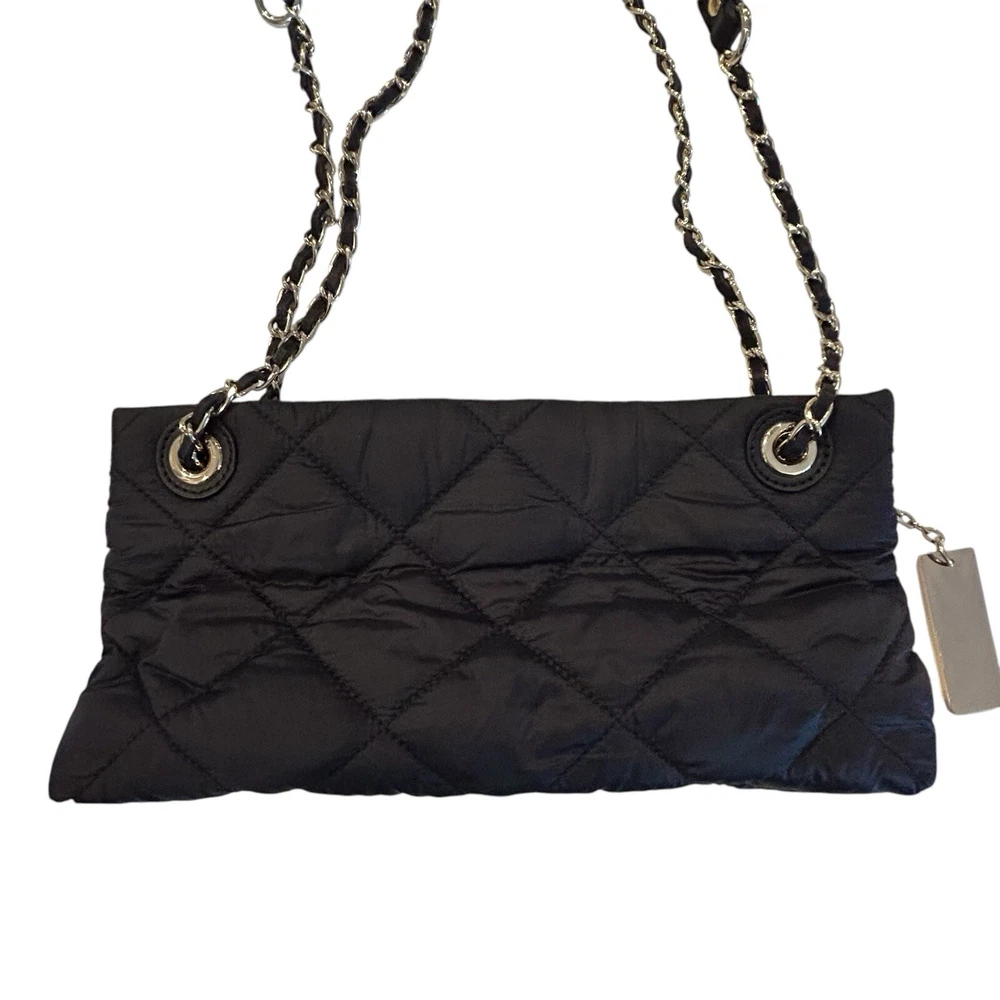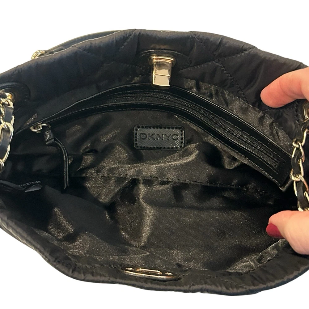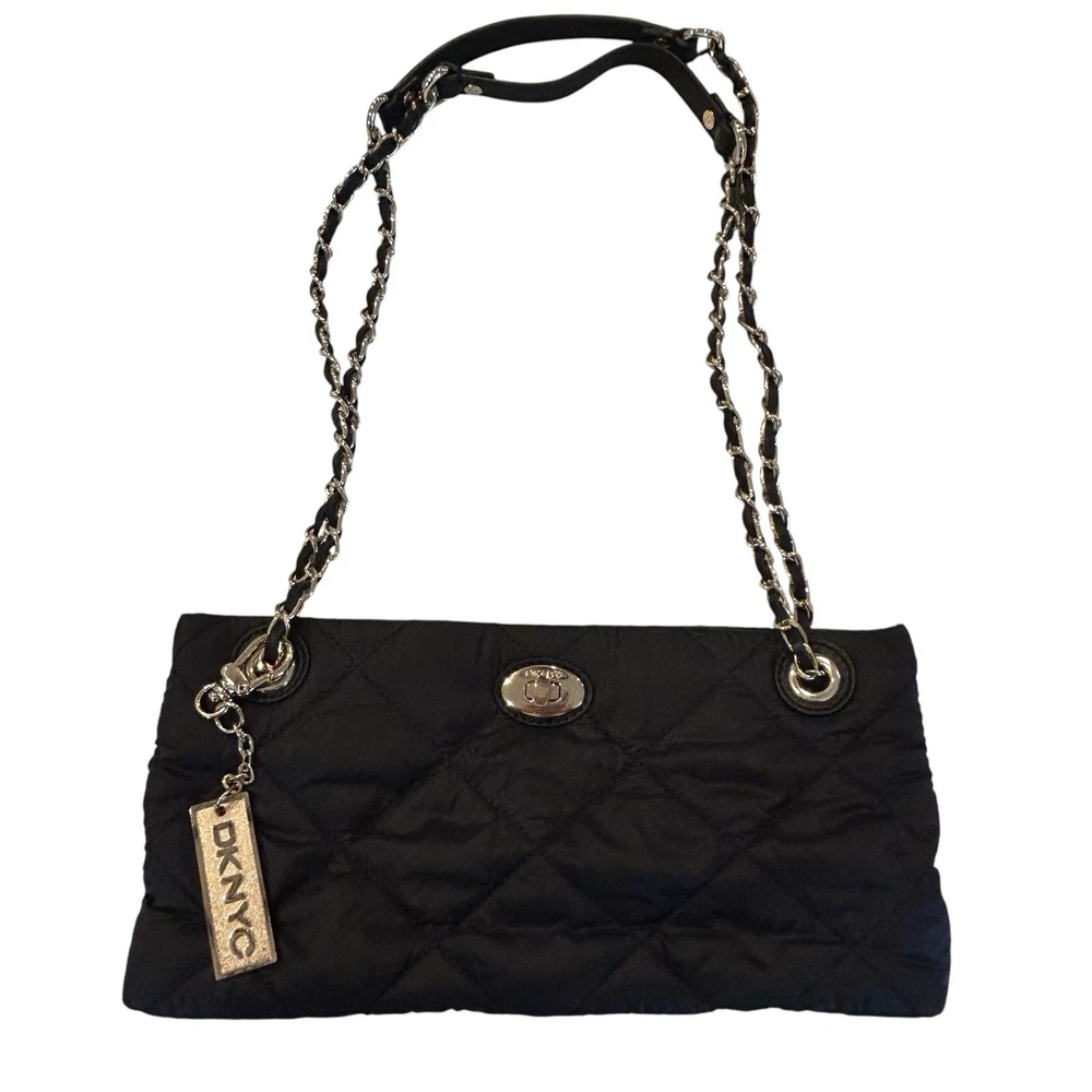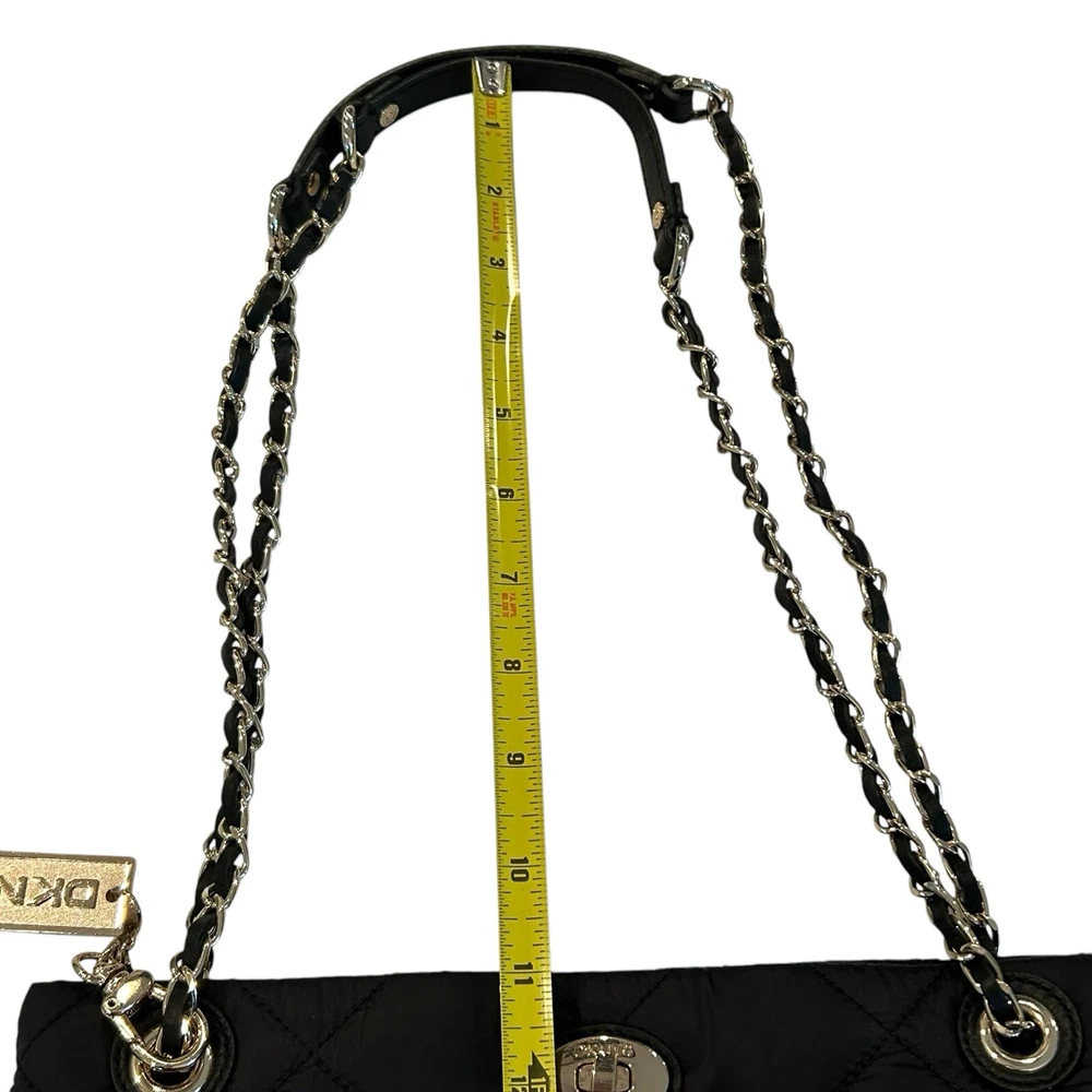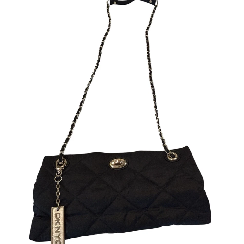 DKNYC Quilted Black Clutch Purse Gold Metal Chain Straps Evening Bag. Good pre-owned condition with normal wear, no tears or stains, see photos for details. Measurements in photos and are approximate. (111)