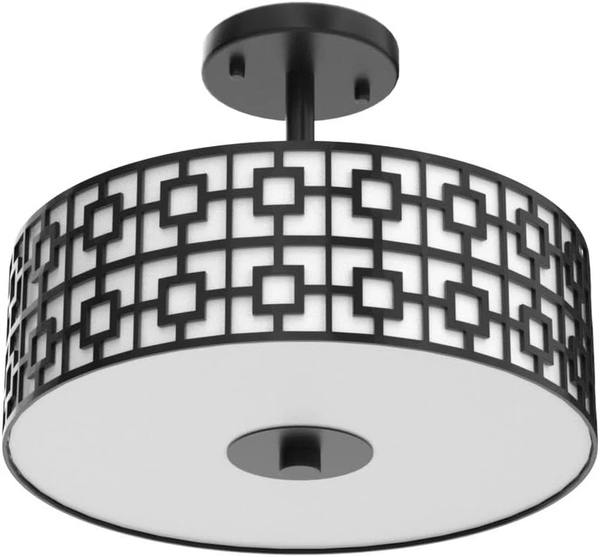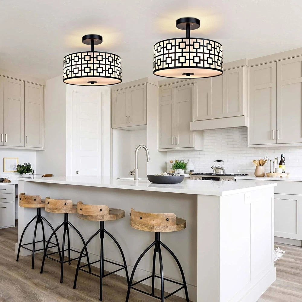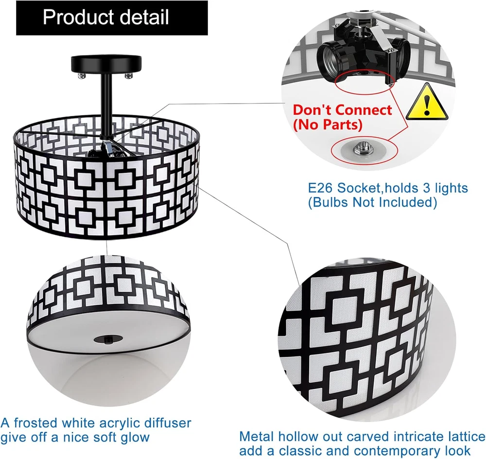 Exquisite Carved Art Lampshade: This flush mount ceiling light showcases an astonishing geometric design, setting it apart from traditional fabric shade ceiling lights. The square grid pattern meticulously carved into the metal frame strikes a perfect balance between precision and elegance. The open spaces within the carving allow soft ambient light to filter through the frosted shade, providing a warm and even glow Semi-Flush Mount Ceiling Light: Compared to chandeliers, semi flush mount lights are installed closer to the ceiling, making them ideal for rooms with lower ceilings. Additionally, the design of kitchen light fixture complements a variety of styles, from modern to traditional, seamlessly blending with different interior decorations Durable and Timeless: Each drum lighting fixture is a testament to the home. Our metal drum shade ceiling light, with its exceptional durability, carries the memories of home and passes on its warmth. Compared to fabric shade counterparts, our metal and acrylic double-layer lampshade design is easy to maintain, retaining its original state with a simple wipe, and will not bend or deform over time, ensuring a consistently high-quality lighting experience for years to come 3 x E26 Bulbs (Bulbs Not Included): Our 3-light ceiling light fixture comes with 3xE26 sockets, providing even and bright illumination suitable for living rooms, kitchens, hallways, and other spaces that require good lighting. Moreover, it supports dimming functionality, allowing you to adjust the brightness according to different occasions and needs, creating the ideal ambiance. The bedroom ceiling lamp is compatible with E26-based bulbs, including LED, CFL, incandescent, and halogen bulbs Perfect Size for Versatile Applications: With its perfect size of 12.6"L x 12.6"W x 10.2"H, gold light fixture provides ample ambient light without taking up too much space. Suitable for various settings such as bedrooms, kid’s rooms, bathrooms, home offices, dining rooms, laundry rooms, entrances, study areas, and more, it caters to a wide range of users including interior designers, homeowners, tenants, families, parents, artists, and home decorators Satisfaction Guarantee: We offer a 12-month quality guarantee and a 30-day refund policy. If you are not satisfied with our close to ceiling light fixtures, please contact us at any time, and we will resolve any issues for you promptly within 24 hours Product Description 1 Entrance 2 Kitchen 3 Living Room 4 Bedroom 10+ years of industry experience, 1930+ reviews, and 4.7+ rating. Our high-quality drum ceiling lights are both stylish and reliable. 1 Why choose us? 2 Customer Sharing Semi-Flush Drum Light DLLT Drum Light Fixture 12.6Inch Size: 12.6Inch Metal+Acrylic Materials: Metal+Acrylic Black Color: Silver 3×E26 Bulb Base: 3×E26 12.6Inch Size: 12.6Inch Metal+Acrylic Materials: Metal+Acrylic Black Color: Gold 3×E26 Bulb Base: 3×E26 Semi-Flush Drum Light Semi-Flush Drum Light
