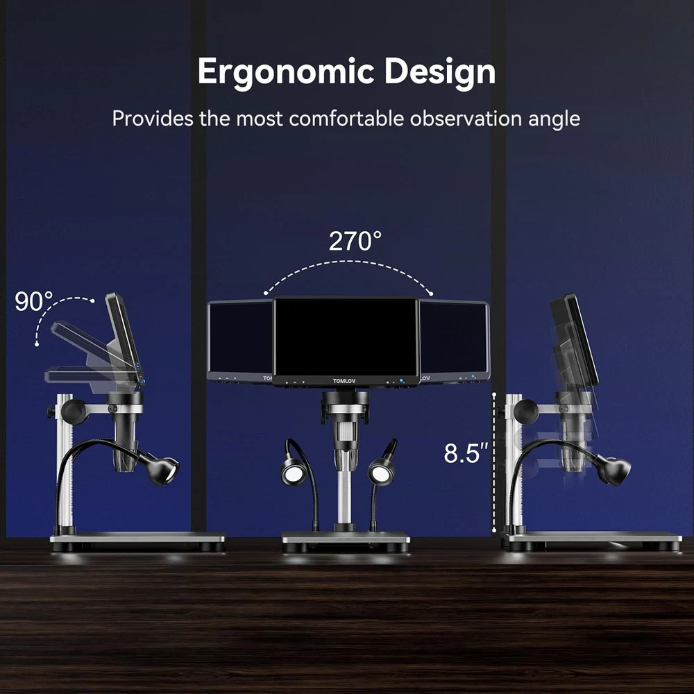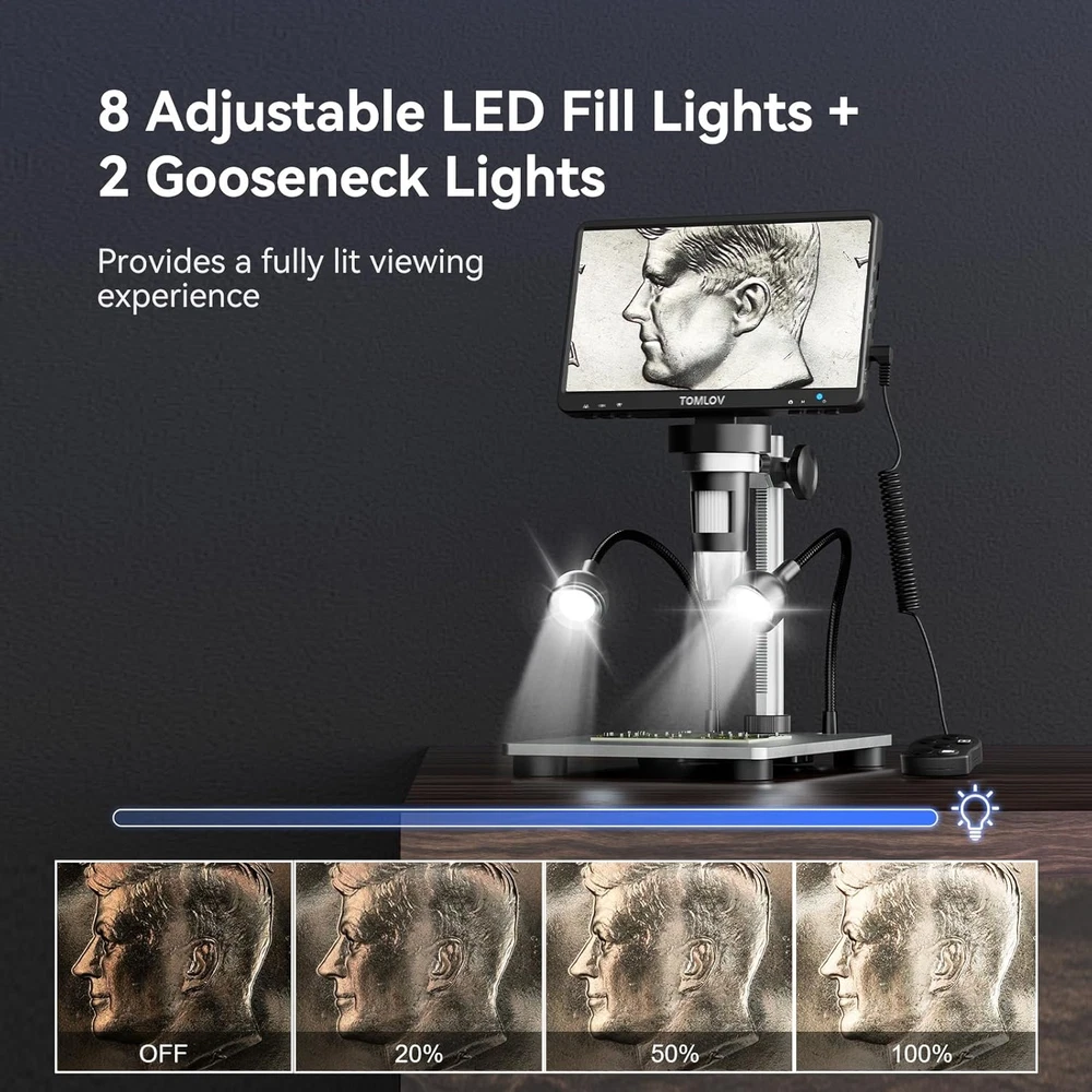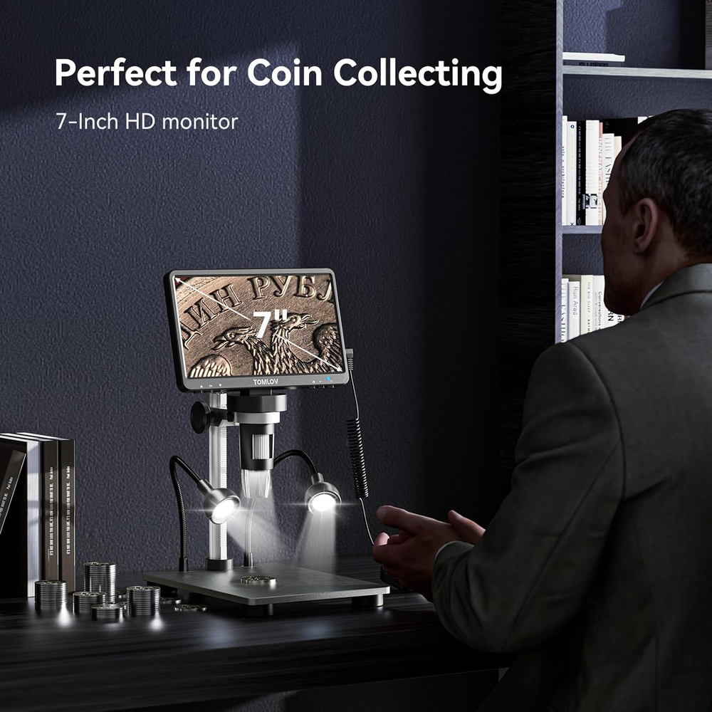 Tons of Fun and Applications: With easy-to-use operation and a wide range of applications, from micro soldering and rock inspection to coin and stamp observation, this coin microscope with screen is perfect for adults, students, and young learners, enhancing interaction between parents and kids, as well as teachers and students 7-Inch Rotatable FHD Screen: Equipped with a 12MP ultra-precise focusing camera and 1080P high-definition imaging, this LCD digital microscope captures high-quality images and videos, delivering an incredible microscopic viewing experience. The rotatable (90-degree) screen design improves ergonomics and reduces eye and neck strain 5X-1200X Magnification: Allows you to zoom in and observe the tiniest details with a magnification range from 5X to 1200X. The 8 LED fill lights, plus 2 additional gooseneck lights, ensure a well-lit view. The actual magnification varies depending on the screen size and the distance between the camera and objects Hook Up to PC for a Larger View: Compatible with Windows and macOS, the PC view allows you to observe on a larger screen and facilitates data sharing and analysis. No additional software required—simply use the default apps: "Windows Camera" for Windows and "Photo Booth" for iMac/MacBook 32GB SD Card Included: This coin magnifier with light includes a 32GB Micro SD card, allowing you to store numerous photos and videos. Press and hold the menu button for 3 seconds to switch between “Photographing,” “Video Recording,” and “Playback” modes Solid Metal Frame Construction: Constructed with an aluminum alloy base, stand, and holder, this soldering microscope ensures long-term durability, making it ideal for micro soldering and PCB repairs Available Photo & Video Resolutions: Photo Resolution: 12MP (4023×3024), 10MP (3648×2736), 8MP (3264×2448), 5MP (2592×1944), 3MP (2048×1536). Video Resolution: 1080FHD (1920×1080), 1080P (1440×1080), 720P (1280×720). Please note that higher resolutions take up more storage space, and resolution may be limited when viewed on a PC Product Description The Most Popular 7" Soldering & Coin Microscope - TOMLOV DM9 1 Mass Storage 2 Capture & Record 1 Rechargeable Battery 2 Convenient Remote Control TOMLOV DM9 Digital Microscope - The Most Useful Tool for You & Your Child! Parameter Difference of TOMLOV DM9 Series Digital Microscope Customer Reviews 4.4 out of 5 stars 2,505 4.4 out of 5 stars 2,505 4.5 out of 5 stars 307 4.4 out of 5 stars 275 Price $69.99 $ 69 . 99 $72.99 $ 72 . 99 $89.99 $ 89 . 99 $129.99 $ 129 . 99 Screen Size 7" LCD Display 7" LCD Display 7" IPS Display 10.1" IPS Display Magnification 5X-1200X 5X-1200X 10X-1200X 5X-1500X Photo Resolution 12MP 12MP 16MP 20MP Video Resolution 1080P 1080P 1080P 1080P Stand Height 8.5" 8.5" 10" 12.6" Base Size 4.6"*6.5" 4.6"*6.5" 4.6"*7.8" 7"*8" Base Color Silver Black Black Black Compatible System Windows/macOS Windows/macOS Windows/macOS/HDMI Windows/macOS/HDMI SD Card 32GB 32GB 32GB 64GB