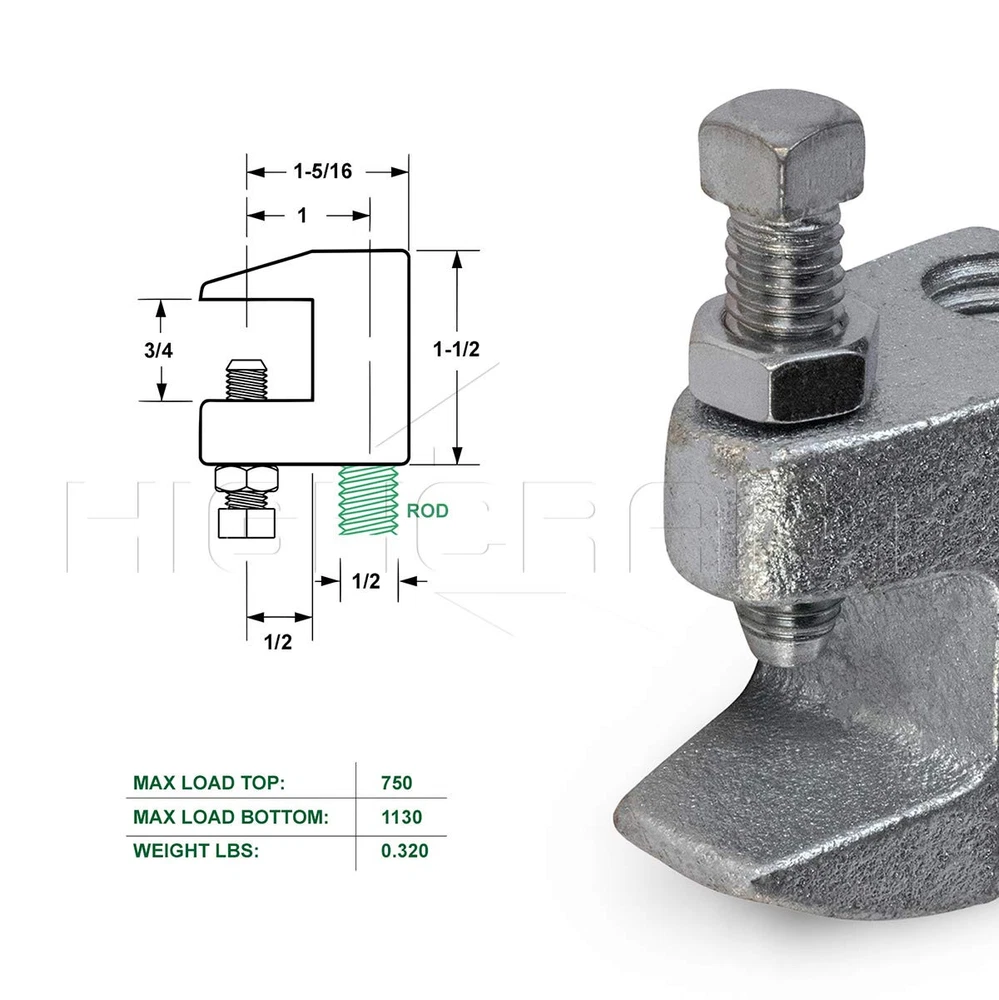 Function: Clamps onto beam flange to anchor vertical threaded rod Specialty Clamp Features: Reduces need for drilling / allows vertical Adjustment of rod / handy in various different Applications Specifications: Rod Fitting 1/2 in. / Jaw Opening 3/4 in. / Max Load 1130 Superior Quality: electro galvanized steel Construction Compliance: UL listed and FM approved
