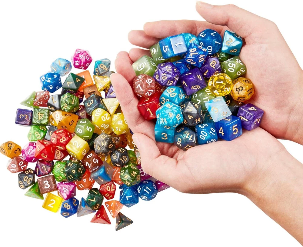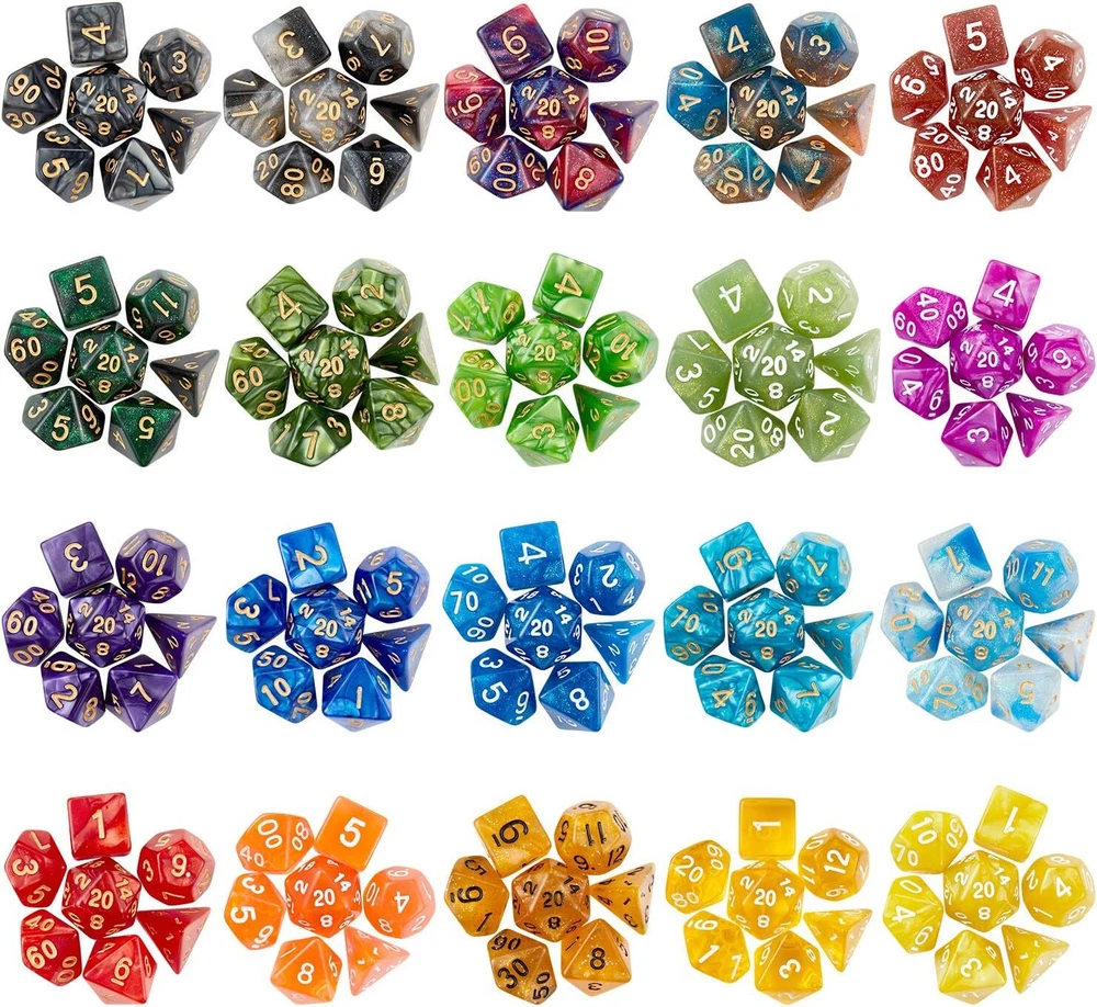 DND Dice Set (140 Pieces), Huuancy Polyhedral Dice for Dungeons and Dragons DND RPG MTG Table Games with 1 Large Flannel Bag, 20 Colors Product Details Package Dimensions: 8.62 x 5.83 x 2.87 inches Item Weight: 1.3 pounds Manufacturer recommended age: 14 years and up Manufacturer: Huuancy 【20 COLORS】: Each group of DND dice contains 1 d4 dice, 1 d6 dice, 1 d8 dice, 2 x d10 (0-9 and 00-90) dices, 1 x d12 dice, 1 x d20 dice. There are 140 in total.Comes with a big dice bag. 【DICE MATERIAL】:The polyhedral game dice are made of acrylic, resistant to oxidation, easy to roll and durable, bringing you a better gaming experience. 【EASY TO READ】:All the numbers are engraved on the Dice, Never fade easily. All acrylic dices have clear figures on each side. And the clear figures are as large as possible on each face for easy reading. 【GOOD BALANCE】: These rpg dice are scientifically designed and manufactured using precise molds. They are well balanced to ensure that each dice in the game can roll correctly. 【Tips】:If you receive any missing or damaged dice, please contact us for Replacement or Refund. Huuancy 20 x 7 Polyhedral Dice sets are Great for D&D role palying games, DND,MTG,Yugioh,card or table games, board games, miniature and dice gaming,family and party games, education and school supplies. Features: 1.Sets of 7-die set,contains: d4,d6,d8,2 x d10 (0-9 and 00-90),d12 and d20 - the percentage dice. 2.No visual trouble,dice numbers on each face are as large as possible for easy reading,use underscoring to differentiate 6 and 9. 3.The polyhedral game dice are made of acrylic, resistant to oxidation, easy to roll and durable. 4. High quality: guarantee the quality in all aspects of the balance, color, material, printing, touch and packaging of the dice. 5.Comes with a beautiful velvet cloth bag, easy to store and take out. pocket size: 9.4X6.3 inches. Package includes: 140 x polyhedral dice 1 x gray drawstring flannel bag Product Warranty: If you receive defective dies or missing dies set, please CONTACT US for replacement or Refund. Warm notice: Small parts, please keep them away from children. Adult supervision is required.