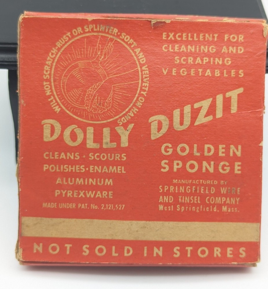 This vintage Dolly Duzit metal sponge is a rare find for any collector or enthusiast. The golden metal dish cloth adds a touch of elegance to any kitchen or dining area. Made in the United States, this unit is of high quality and has never been opened. The unique distressed design adds character to the piece, making it a one-of-a-kind addition to any collection.