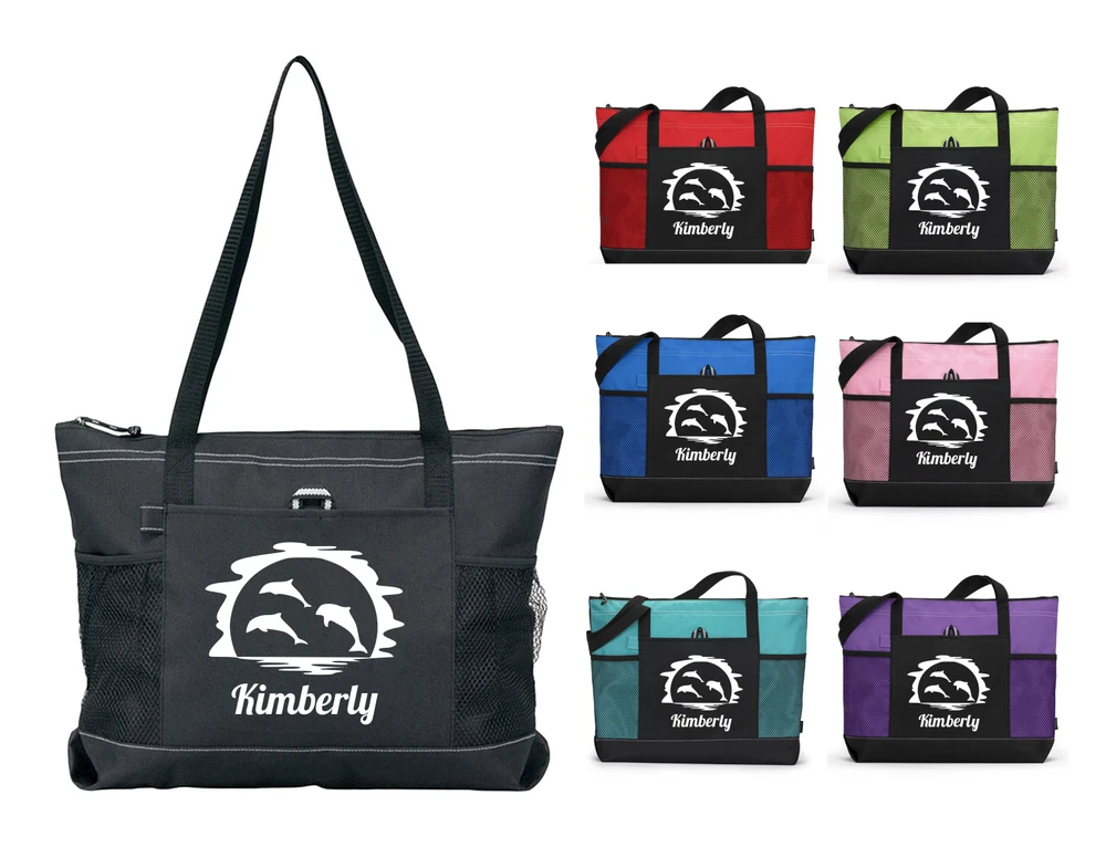 DOLPHINS JUMPING IN THE SUN DESIGN WITH NAME ZIPPERED GEMLINE TOTE YOUR CHOICE OF COLOR TOTE COLOR BE SURE TO INCLUDE YOUR NAME FOR THE DESIGN AT CHECKOUT GEMLINE BRAND TOTE - VERY NICE AND DURABLE GREAT TO USE FOR OVERNIGHT BAGS, PURSES, TRIPS TO THE LAKE OR BEACH, CAMPING, AND SO MUCH MORE THE DESIGN IS HEAT PRESSED VINYL AND WILL BE DONE IN WHITE BAG SPECS: 600-denier polyester 29½" Black webbing shoulder straps Zippered main compartment Front pocket with pen loop Two side mesh pockets Back panel is Black 20"W x 14"H x 4"D If you have a design request feel free to send us a message. We will work to see what we can do for you. Thanks! We try to ship out our items as quick as possible, but with made to order items it could take up to 5 days for the item to be completed and shipped. We thank you for your patience. DESIGN MAY BE SLIGHTLY ENLARGED TO SHOW DETAIL. DESIGNS WILL NOT EXCEED 6.5 INCHES EITHER IN WIDTH OR LENGTH. Be sure to fully examine all pictures closely and read auction completely prior to placing a bid. If you have any questions please be sure to contact me and I will do my best to answers them. I do combine shipping! Please note that our post office is closed on Sat & Sun so we can only ship Mon-Fri. Paypal is the only form of payment we accept at this time. If ever there is a problem please contact us prior to leaving bad feedback. We strive for a 5 star rating. Thank You :-)