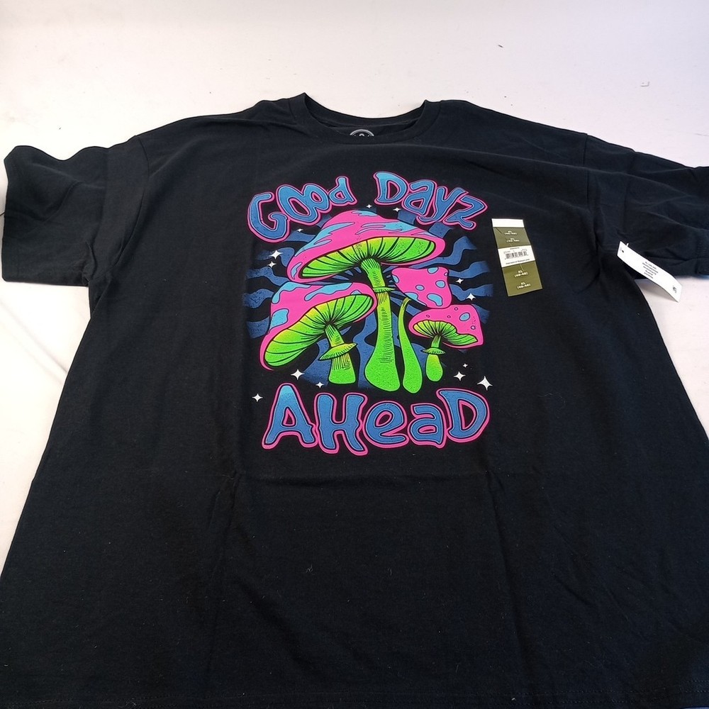 The DOM Men's Black GOOD DAYZ AHEAD Neon Mushroom T-Shirt in size XL is a stylish and comfortable addition to any man's wardrobe. Made from cotton, this short sleeve shirt features a crew neck and a regular fit, making it perfect for the summer, fall, or spring seasons. With its bold neon mushroom design, this shirt is sure to make a statement and stand out from the crowd. Machine washable for easy care, this shirt is a practical and trendy choice for any occasion.